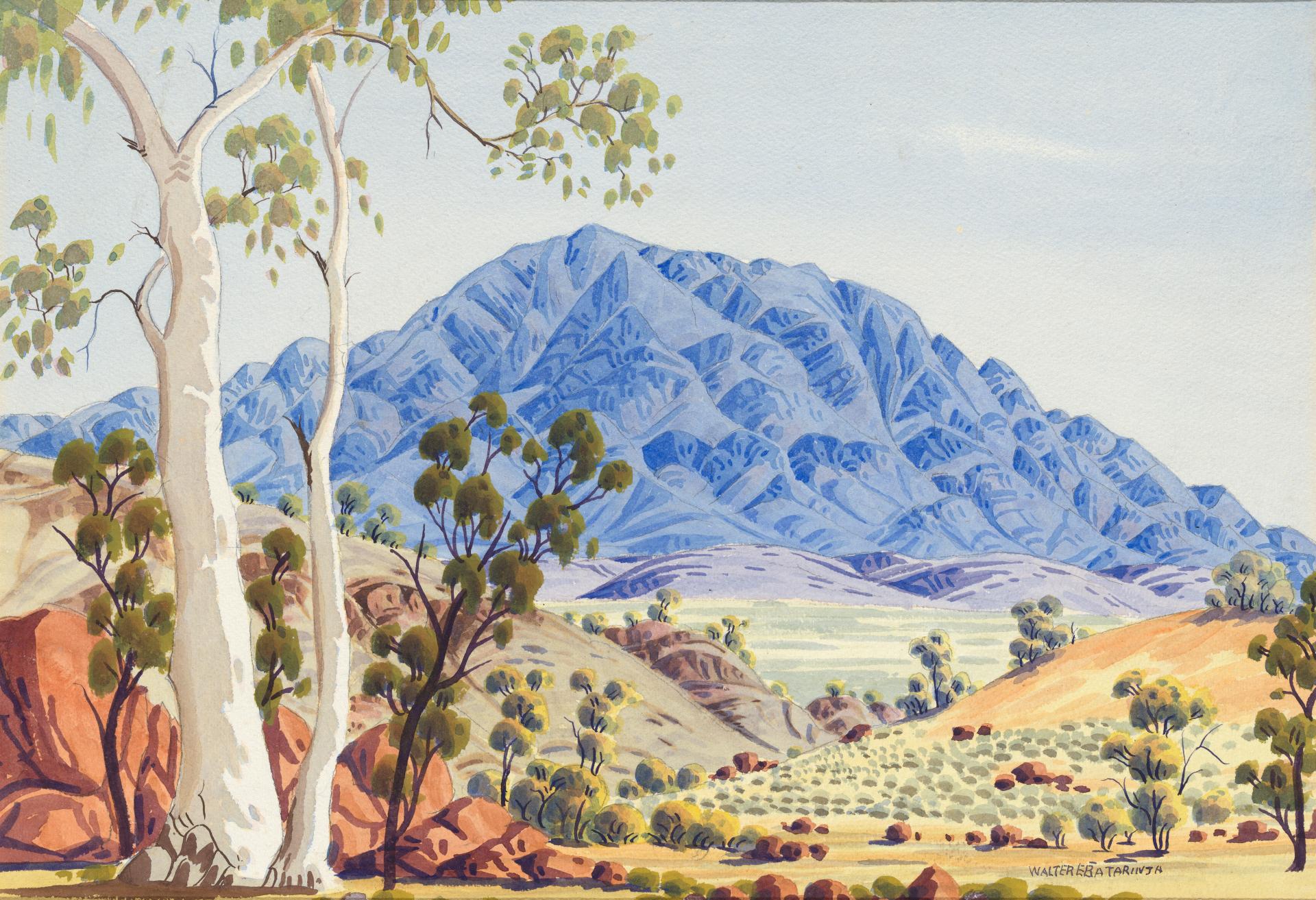 Selma Coulthard grew up in Hermannsburg where she went to school with fellow artist Ivy Pareroultja. She is an accomplished acrylic artist and has recently started painting in watercolour. On her art practice, Selma says: ‘It is [in Ntaria/ Hermannsburg] that my love for art started when I saw the Namatjira brothers doing their painting in Ntaria and around tourism camps such as Glen Helen and Palm Valley. I have always wanted to be an artist and I just hope that my work will be recognised. No work is the same each piece is unique in its own right. I have created artwork based on my stories: my work on Mulga Spinifex Country, my country where I grew up and lived – Urrampinyi (Tempe Downs), the oasis in the Desert at Urrampinyi, running Waters at Irrmakara, spiritual keepers of our land, my dreaming – the Thorny Devil, animals in my country, paintings depicting women’s ceremonial site (business) and more.”