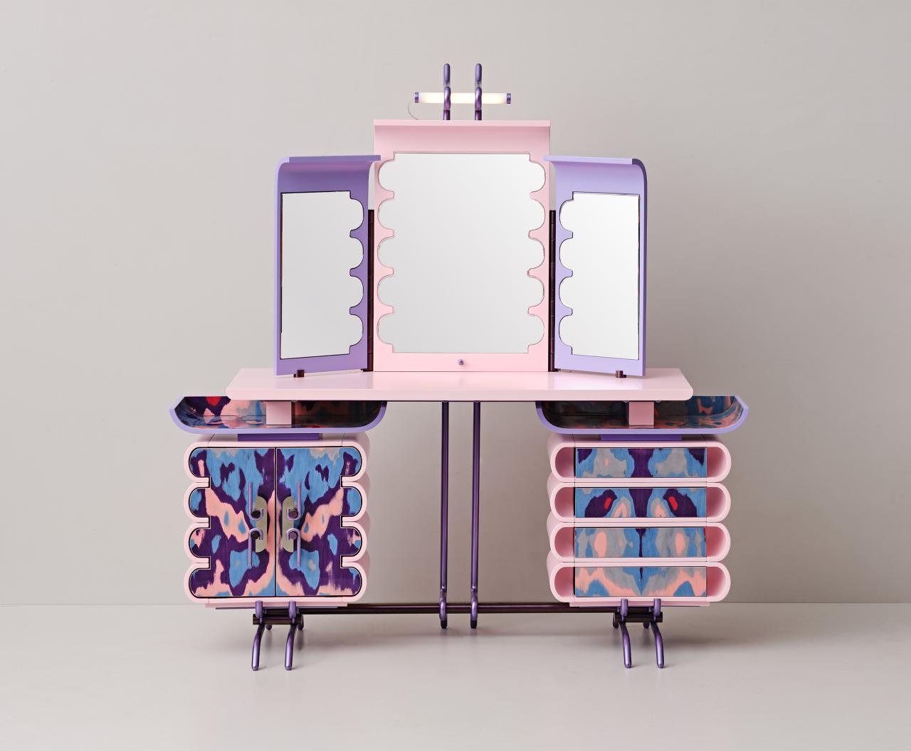 Bethan Laura Wood’s radical approach to materiality, colour, and pattern has garnered a cult following. Fascinated with the cultural and historical significance of surface design and colour in domestic space and the interior, she explores unlikely combinations of colour and shape, developing unique timber veneers, material composites and textiles for furniture, lighting, objects, installations, and accessories. Wood has presented work at Design Miami, Victoria and Albert Museum and Sketch, London; and has works held in permanent collections including The Art Institute of Chicago, SFMOMA and Victoria and Albert Museum.