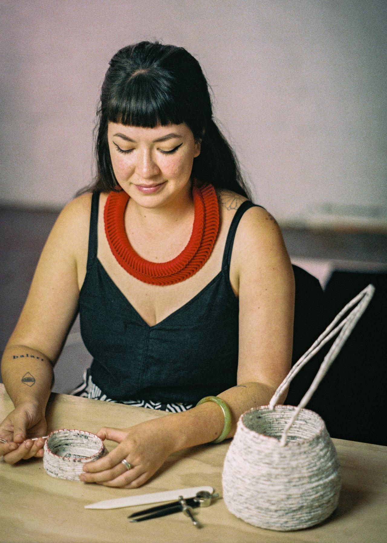 Jenna Lee is a Gulumerridjin (Larrakia), Wardaman and Karajarri Saltwater woman with Japanese, Chinese, Filipino and Anglo-Australian ancestry. Working across sculpture, installation and body adornment, Lee uses her art practice to explore these overlapping identities. Lee’s practice builds on the foundation of her father’s teachings of culture and her mother’s teachings of papercraft. Represented by MARS Gallery in Melbourne, she has exhibited in Australia and internationally, including the Pitt Rivers Museum in the United Kingdom, the Museum and Art Gallery Northern Territory, and Institute of Modern Art in Brisbane. Lee has also been the recipient of the Wandjuk Marika 3D Memorial Award and the Australia Council’s Dreaming Award.
