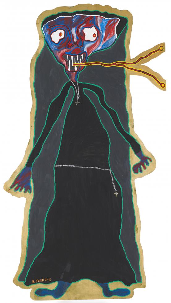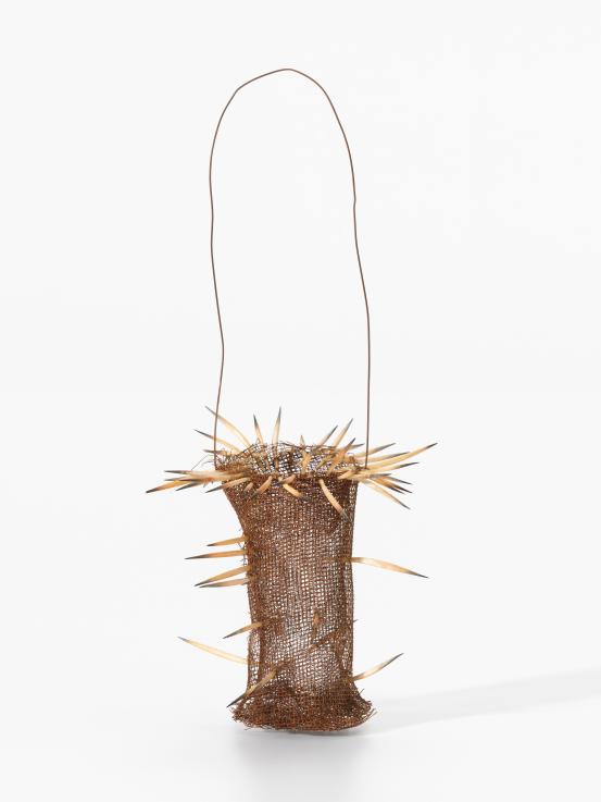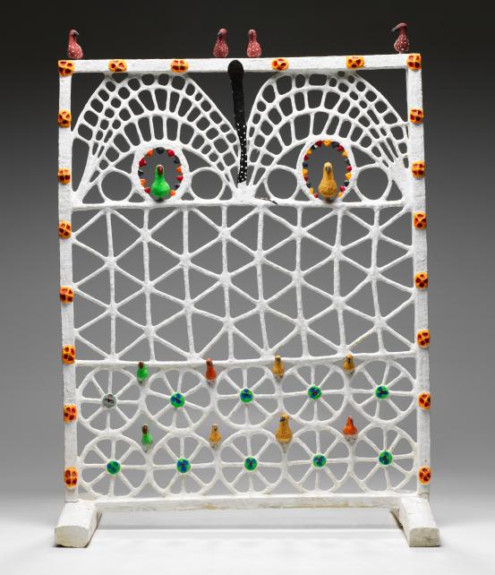 various found objects, wood, metal, bamboo, cork, fibreglass, glass, sequins, tin, rubber, synthetic polymer paint, palm fronds, synthetic fur, synthetic hair