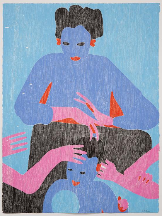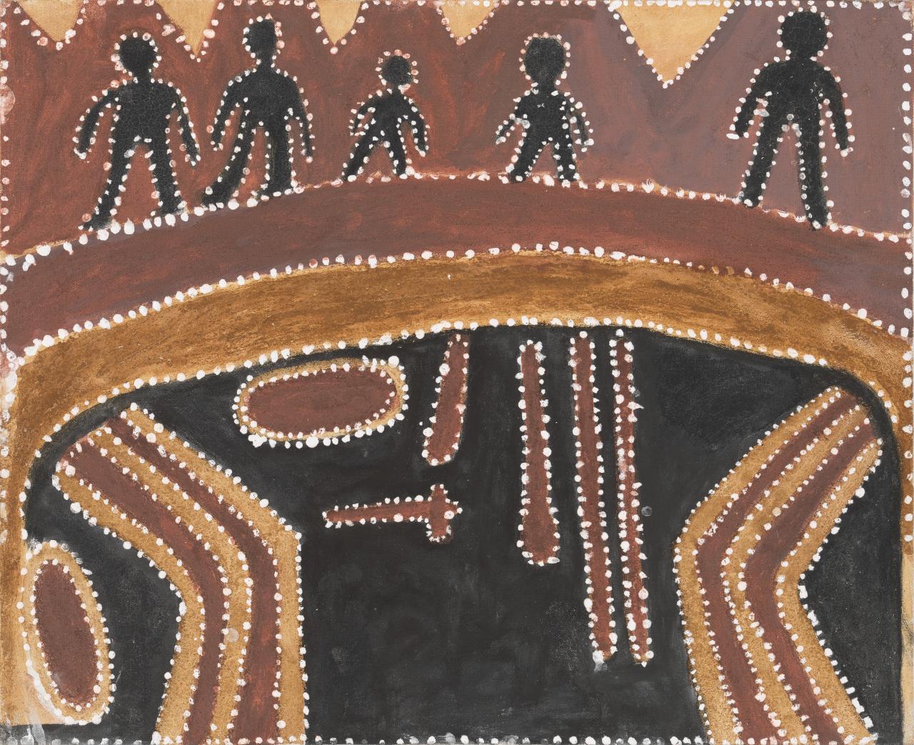 With the same generosity, Heather Koowootha also permits a view into her family’s history with her work Mother and daughter's reunion, 2014. Both of Koowootha’s parents were stolen in childhood. Her mother was confined to a dormitory at Yarrabah, just outside of Cairns, while her father was removed from his family in Aurukun and sent to work as a stockman at Normanton Mission. The two later met at Yarrabah and raised ten children together, of whom Koowootha and four siblings survive. While deeply connected to her family’s truth, in reality, Mother and daughter's reunion depicts an imagined event dreamt by her mother: the moment she would reunite with her own mother back on Country. A dream that never eventuated.