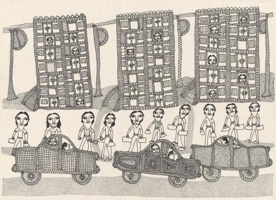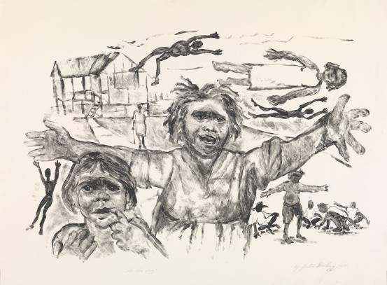 The term Stolen Generations names a collective trauma, and in doing so homogenises and conceals the individual experiences of those affected. Today, many contemporary artists are exposing the stories long left untold. John Packham’s Petin – to abduct, steal, 1999, is a wrenching and horrific depiction of the moment a mother watches her child being abducted. To Packham, the image is intimate, drawn from his own story, at the moment his maternal lineage was ruptured. ‘This painting was inspired by my mother’s grief,’ says Packham. ‘She still suffers, along with so many others, because she was taken, stolen at birth, back in the mid 1900s and institutionalised at Colebrook Home.’ Babies, children and teenagers were taken from their families, mostly by force or by forced signing of legal documents. ‘A lot of parents sent their children off to hide in the bushes, which I’ve depicted,’ notes Packham, ‘I’ve also shown the great grief of the mother.’1