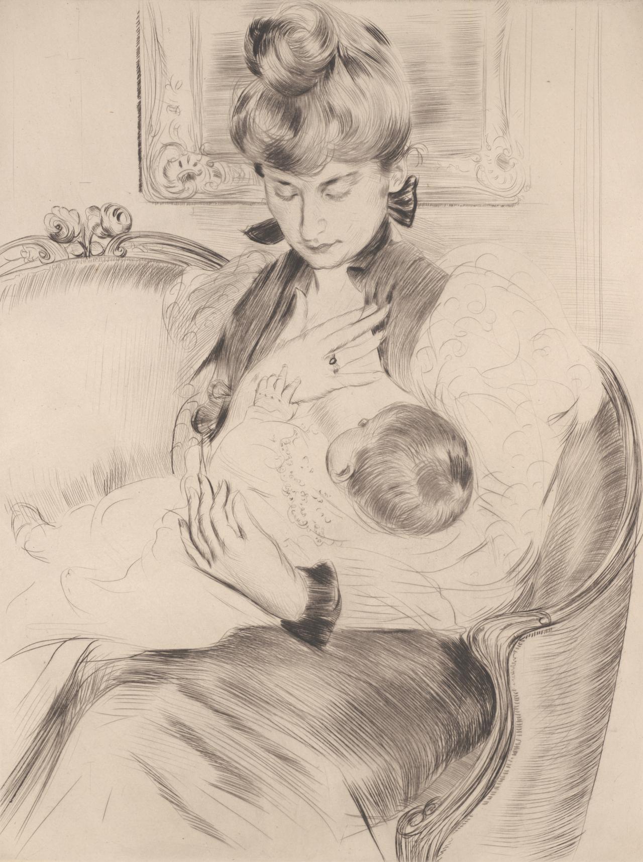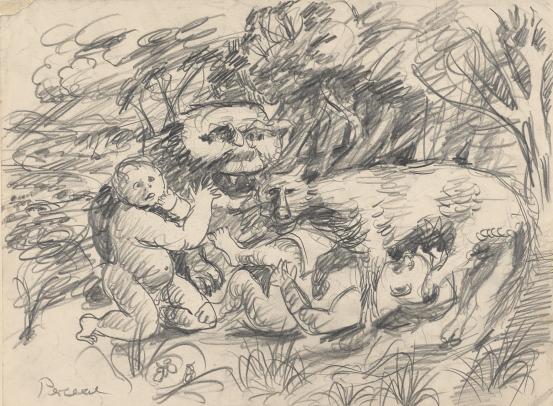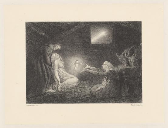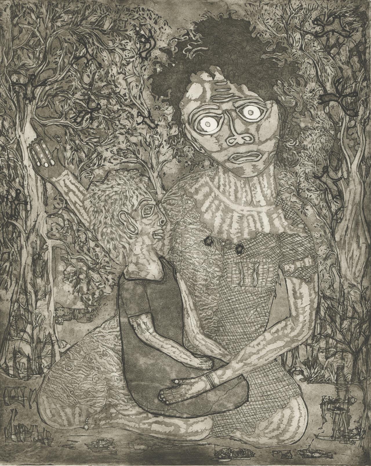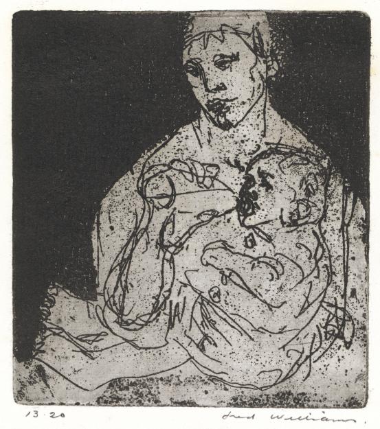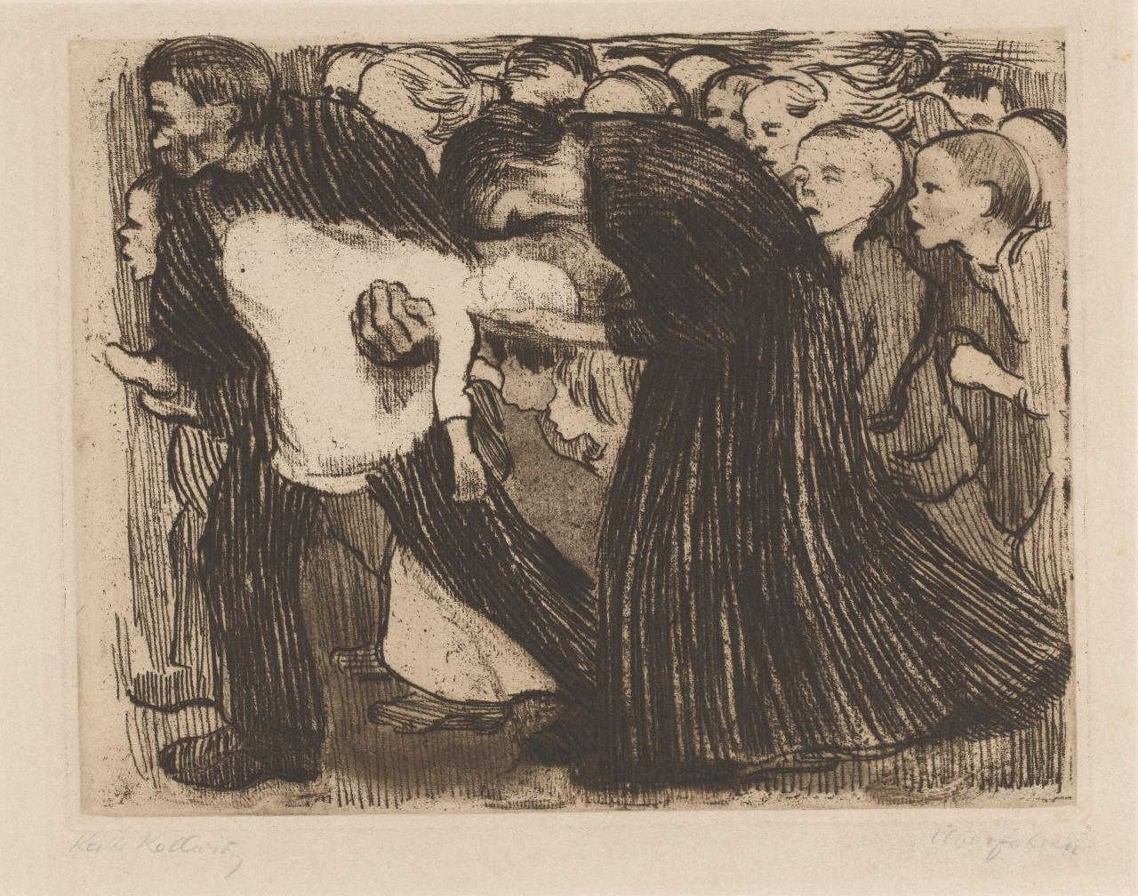 While Kollwitz was not drawing on first-hand experience of maternal grief at the time these works were made, the nightmare of losing a child weighed heavily within her practice. As a child, her baby brother Benjamin died of meningitis – a tragedy which the artist carried with her throughout her life. Later, married to a physician and living in a working-class Berlin neighbourhood, Kollwitz was often exposed to infant mortality. As themes, death of both the child and the mother appear frequently in her work, often as a personified force of inevitable darkness and dread. Kollwitz would sometimes employ her son, Peter, as model, most notably in Woman with dead child (Frau mit Totem Kind), 1903 (Museum of Modern Art, New York). Eleven years after the work was completed, at the beginning of the First World War, Peter died in Flanders aged just nineteen. Her older son Hans later wrote, ‘I asked mother where she got the image of the mother with her dead child from – years before that period. She thought she foresaw Peter’s death even then. She said she had been crying while working on these images.’3