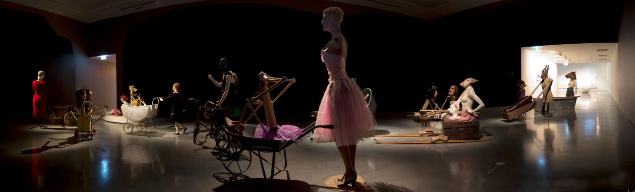 Judith Wright expresses the terror of losing a child in her work A journey, 2011–12, with both theatricality and profound melancholia. The installation is inspired by the sudden death of her daughter, just days after her birth and comprises of surreal, ghostly figures assembled in procession: wooden puppets and Victorian dolls, antique mannequins with prosthetic limbs. Together, a band of childlike characters march ‘on their journey from one realm to the next’.4 For Wright, the figures sit somewhere between the extremities of maternal love and loss, their creation an endeavour to reconstruct the imagined life of her daughter. The work is eerie and playful, likened by curator Andrew Jensen to the tale of Peter Pan – a boy whose shadow was stitched back on and destined to never grow old. To Jensen, like A journey’s young protagonist, Peter Pan was youthful and brave, but denied the dimensions that come with age. He writes, ‘I have learnt we require both the shadows and the light in the same way. To understand happiness, we must know sadness; to value possession, we must reconcile loss. Peter himself represented all children who were lost to us and lived in the shadows of our thoughts and feelings.’5 A journey captures the magic of motherhood and is an extraordinary example of the power of art making in its ability to hold space for human experience.