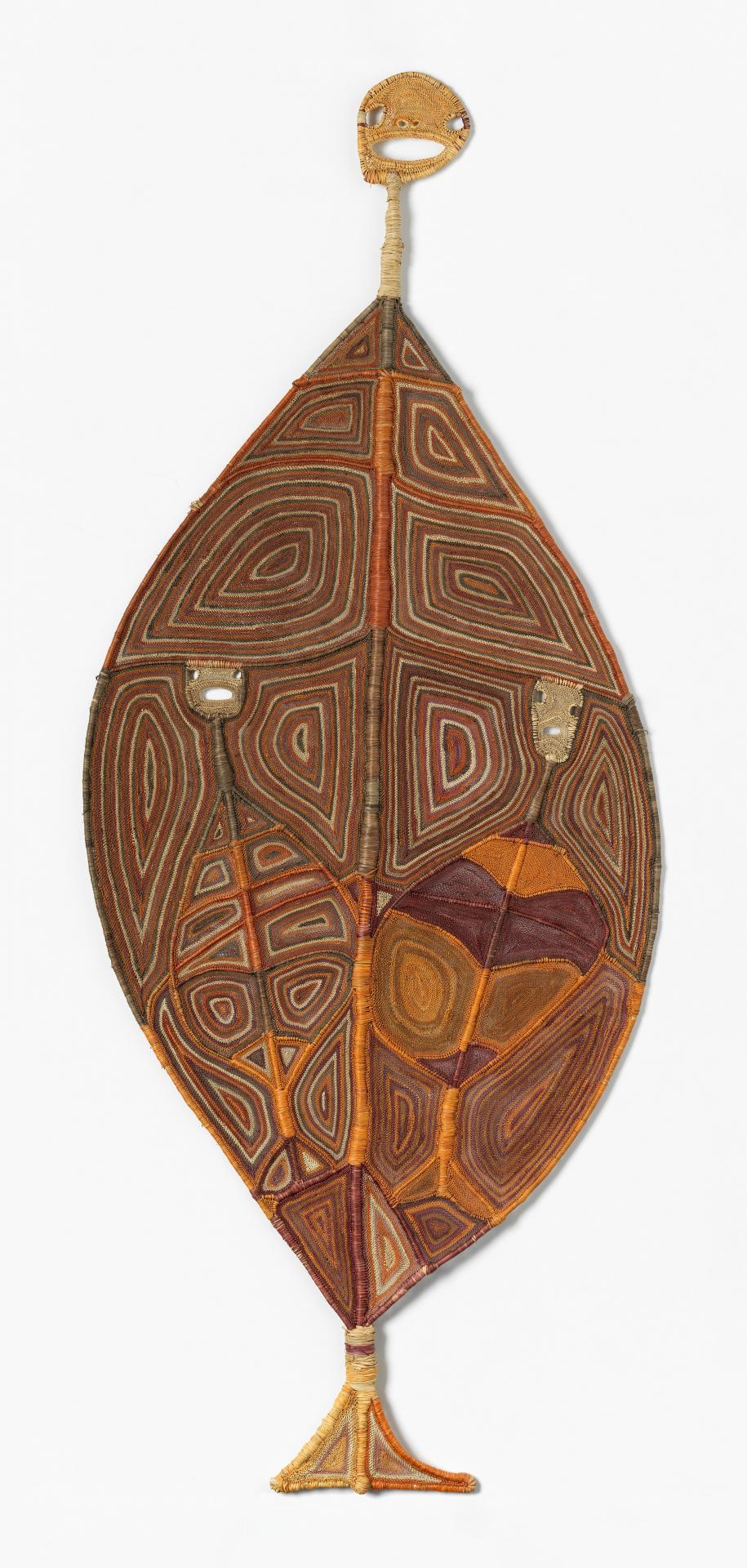 This woven figure represents a yawkyawk or young female spirit. Yawkyawks are usually represented with a fish tail and long hair, which is associated with trailing blooms of green algae. They are sometimes compared with the European notion of mermaids, because these spiritual beings live in the cool freshwater streams and rock pools in the western Arnhem land plateau known as the Stone Country. This yawkyawk carries two babies beautifully woven into her swollen abdomen. Their pale, open-mouthed faces contrast with the swirling optical rows of pink, yellow and orange bands of woven rarrk, like crosshatching in a bark painting.
