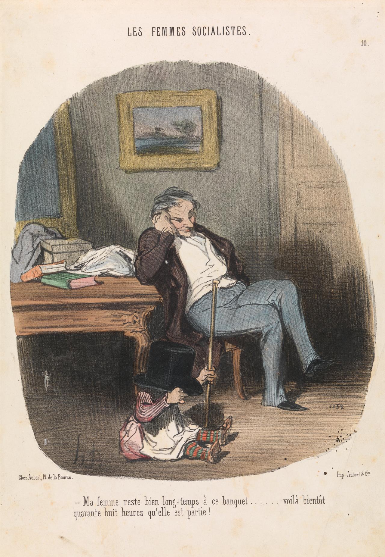 In plate ten from his Socialist Women series, Honoré Daumier depicts the perceived consequences of the rebellion against husbands: children are neglected, and the household falls into disarray while the lonesome husband ponders his wife’s whereabouts.