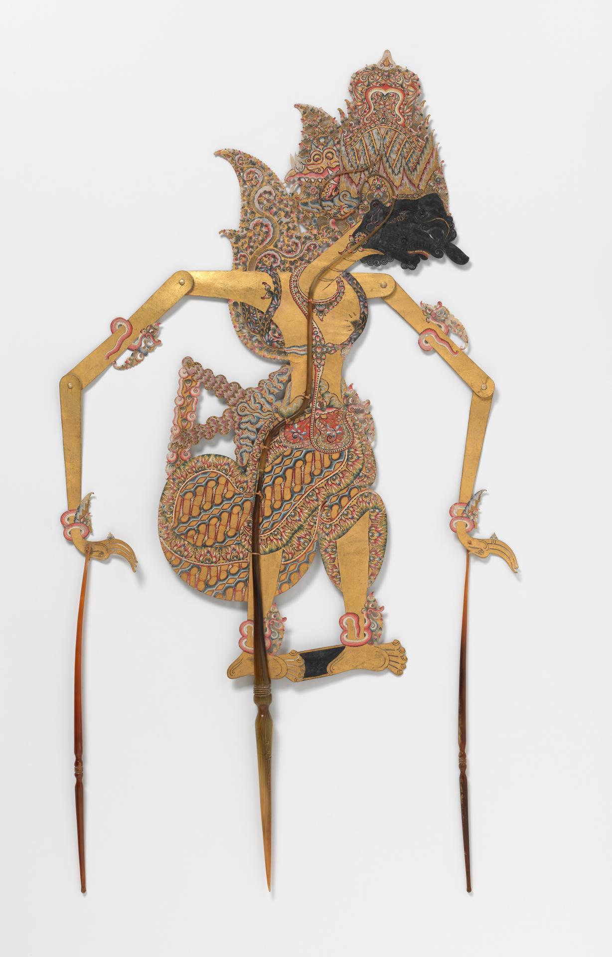 Ancient Hindu epics and Indonesian folk narratives are still performed in Indonesia using wayang kulit shadow puppets. This oral story telling tradition provides moral guidance and entertainment for the audience. The puppet Prabu Suyudana represents a character in the Mahabharata, an important Hindu story. Facial features, costume, physiognomy and the use of colour determine the character of each puppet, and clarify the moral aspects of the narrative.