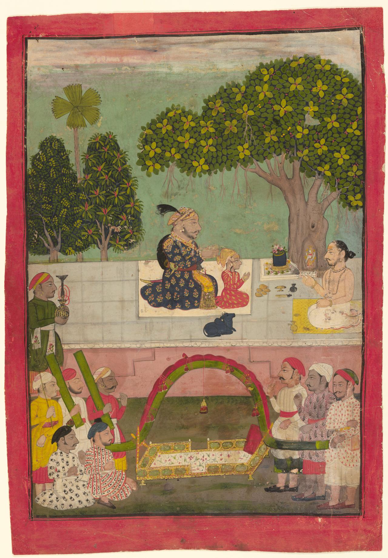 The Indian painting from 1715, Maharana Sangram Singh II and his son at a Shiva shrine, painted to record life at court, shows the importance of religious worship at court with Maharana Sangram Singh II and his son at a shrine worshipping Shiva, a Hindu god in the form of a linga.