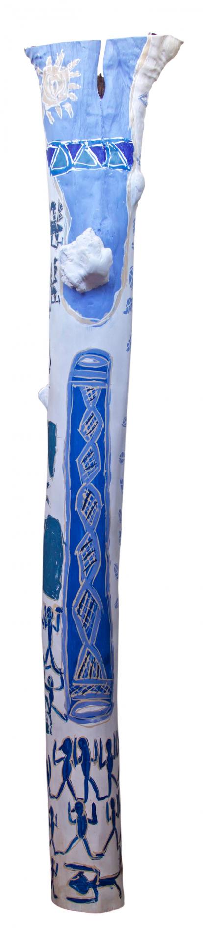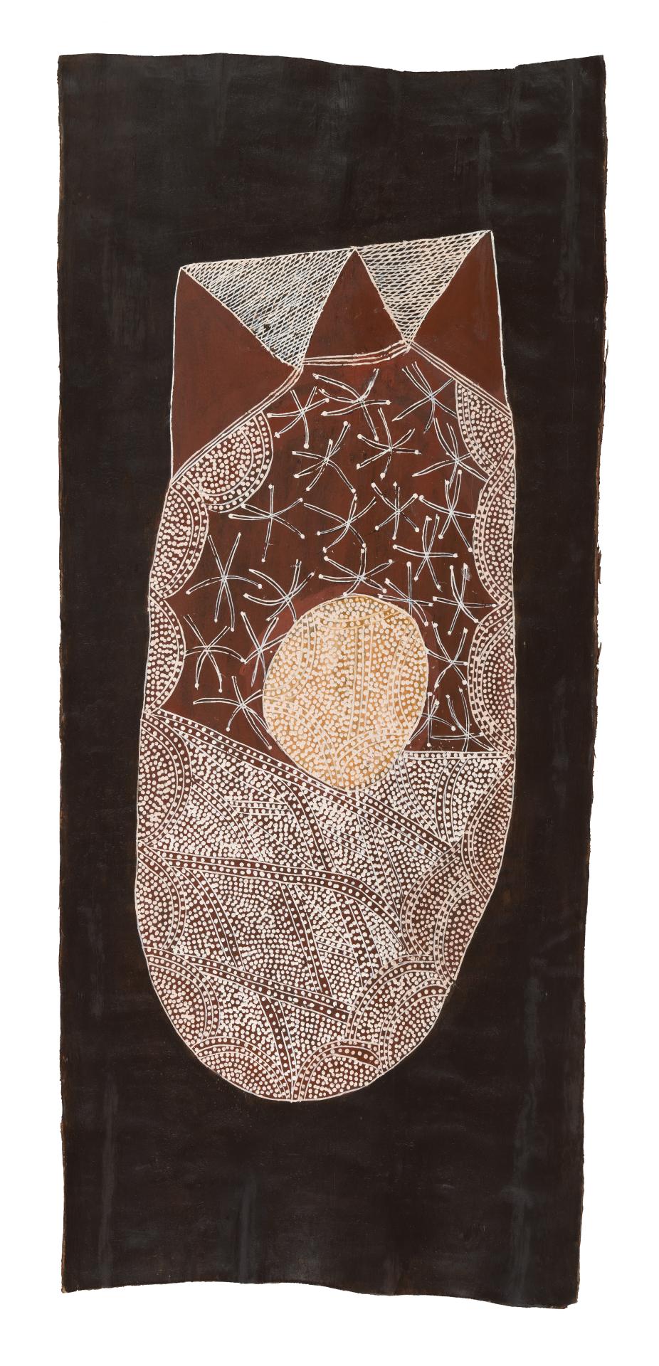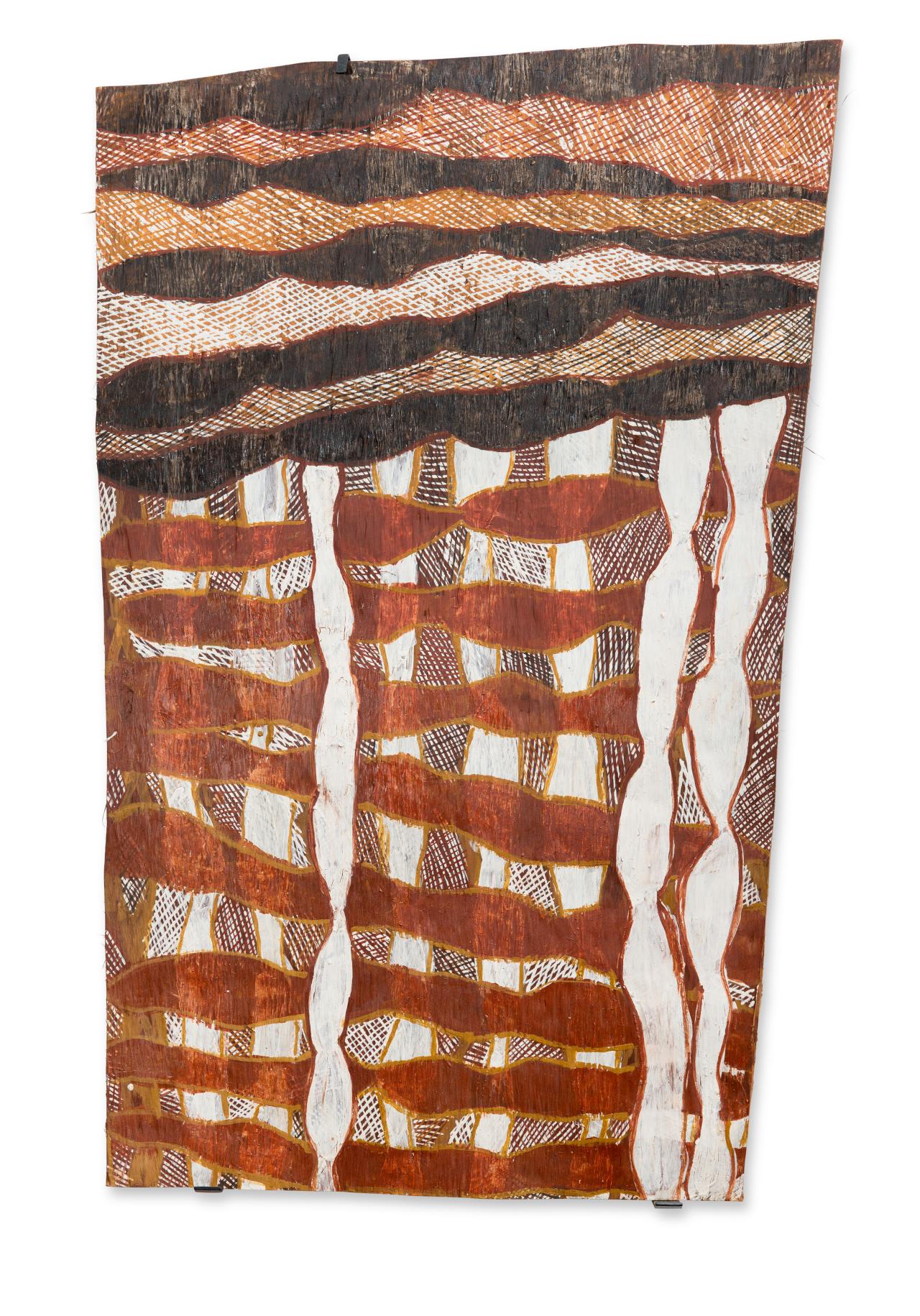 The exhibition features artworks from the NGV collection including both bark paintings and sculptural memorial poles, known as larrakitj. Each of the artists have created works that expand on and challenge traditional styles of art-making: