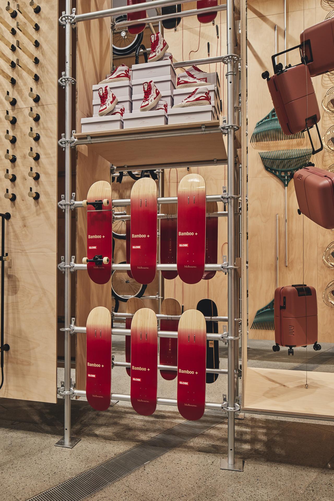 Responding to consumer demand for more environmentally friendly products, Globe’s G3 Bar Skateboard Deck incorporates environmentally sustainable construction methods while the updated Dimension Shoe is made with recycled materials. Both the G3 Bar Skateboard Deck and Dimension Shoe feature in the Melbourne Now Design Wall 2023.