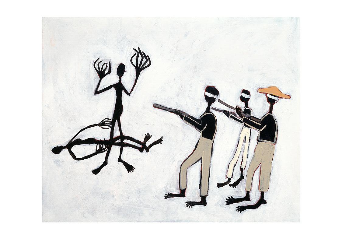 For the exhibition, the NGV commissioned Boe to create a new work: For the angels in paradise, 2023. As she tells us in the video series, ‘the works that I have made look at the contemporary relationships between First Nations People and the police and the justice system in Australia’. The work includes nine paintings and a mural, making it her largest installation to date.
