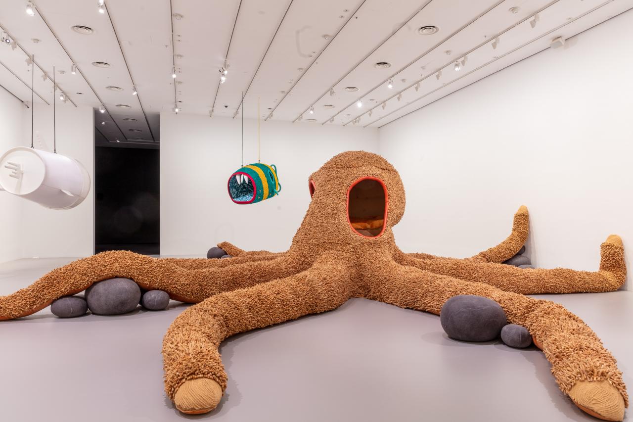 Porky Hefer’s Plastocene – Marine Mutants from a Disposable World, 2020, is a series of large-scale handcrafted creatures that inhabit an imaginary sea environment in a future dominated by plastic. Each of Hefer’s giant creatures refers to particular kinds of waste that pollute the oceans. Buttpus is a sprawling octopus with skin that reminds us of cigarette butts. Flat white, a fish like creature with a gaping mouth, looks like a disposable coffee cup. While they may be inviting, charming and quirky, Hefer’s creations challenge us to consider how comfortable we’d feel living in a space built entirely of garbage.