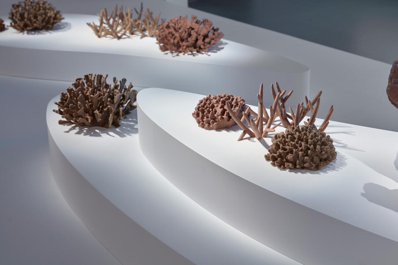Dr Pirjo Haikola is a designer, researcher and scuba diving instructor who examines the way design can contribute to the regeneration of marine eco systems. Her Triennial project involves 3D-printed sea corals made from a material comprised of the shells and spikes of sea urchins. Around the world, exploding populations of ravenous sea urchins are destroying the nutrient-rich kelp forests that are crucial to the survival of many marine species and the vitality of the planet. By developing a new use for sea urchins, Haikola aims to reduce this threat to marine life. Her new sea urchin material presented in Triennial is currently being tested for coral reef restoration purposes.