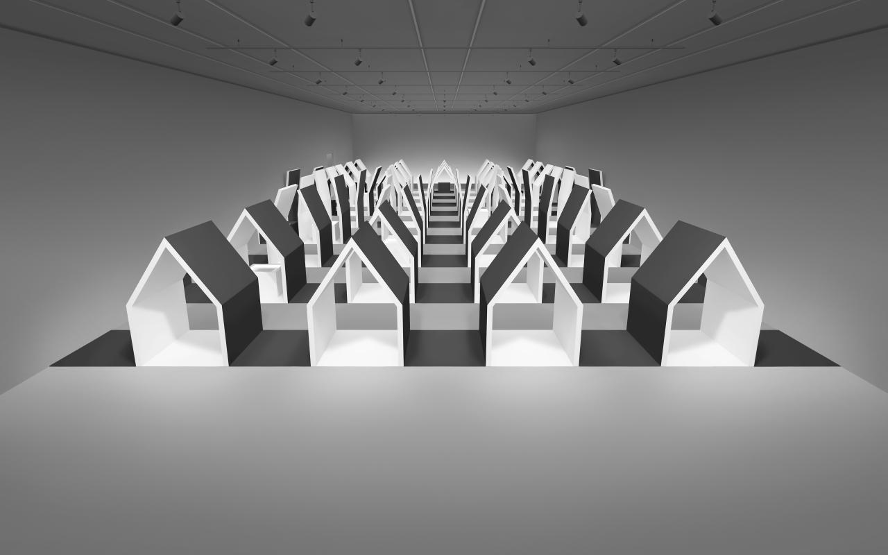 In response to Escher’s tessellations nendo created its own tessellation using the house motif, which allows for multiple readings. Depending on the point of focus, the houses seem to face right or left, up or down. Inverted houses fill up the space in between.