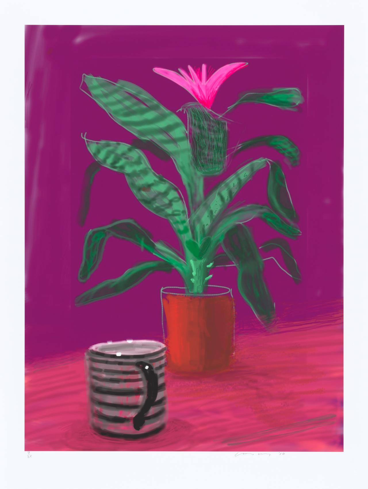 David Hockney is widely considered one of the most important and influential painters of the 20th century. Born in 1937 in Bradford, England, Hockney was involved in the Pop art movement during the 1960s which celebrated subjects from everyday life and borrowed from the visual language of popular culture including advertising. Hockney became well known for his portraits of friends, and his paintings of swimming pools and lush, dense landscapes. From the late 1980s, Hockney began incorporating technology in his art. He started by using a photocopier to make homemade prints, then continued to innovate through the 1990s with fax machines and laser printers. As technology developed, Hockney began using an iPad and the Brushes app to produce still life artworks, many of which were displayed at NGV in the 2016–17 exhibition, David Hockney: Current.