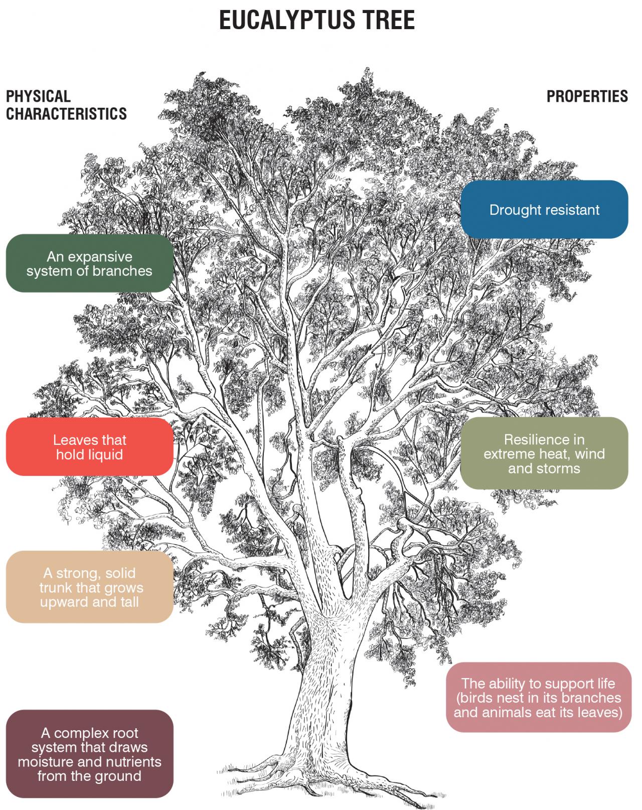 Like Margaret Preston, we are going to consider how we, as artists, can use native Australian flora to communicate meaning. This will require some research into the physical characteristics and properties of flora species native to Australia and what these attributes can mean and symbolise. Take the example of a eucalyptus tree: