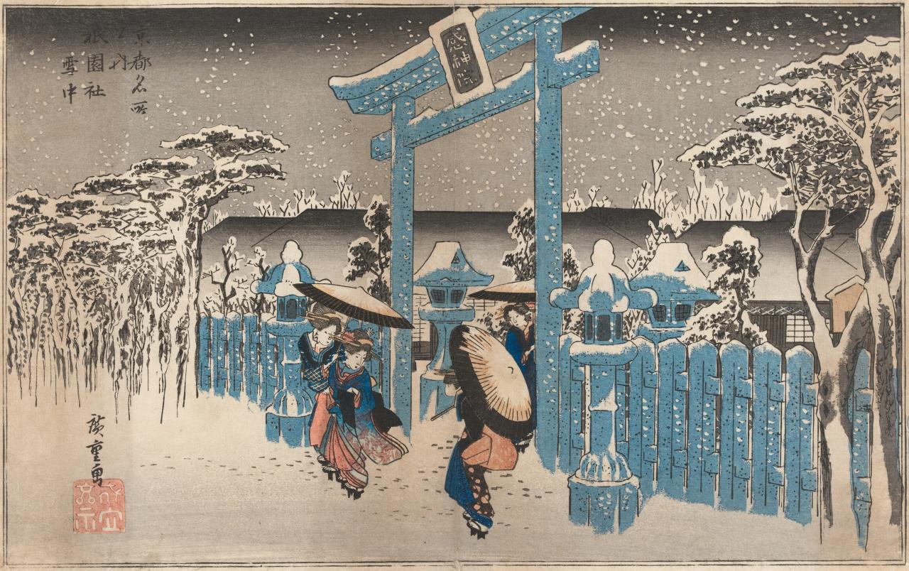 Utagawa Hiroshige (1797–1858) was a Japanese artist famous for his paintings and ukiyo-e (floating world) woodblock prints. His depictions of the landscape inspired many European artists in the nineteenth and early twentieth century who learned from his compositions, including cropping images to create drama and the suggestion of atmosphere or weather.