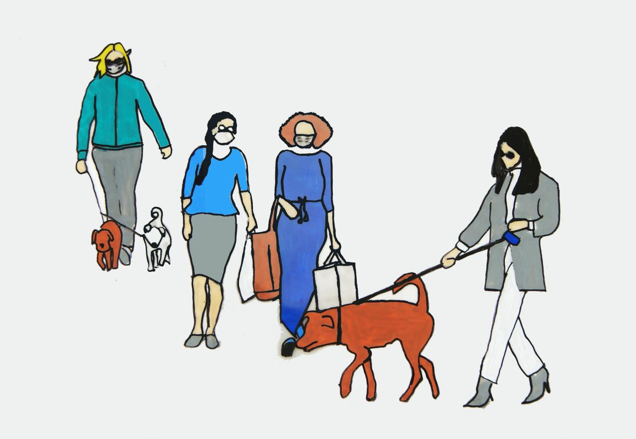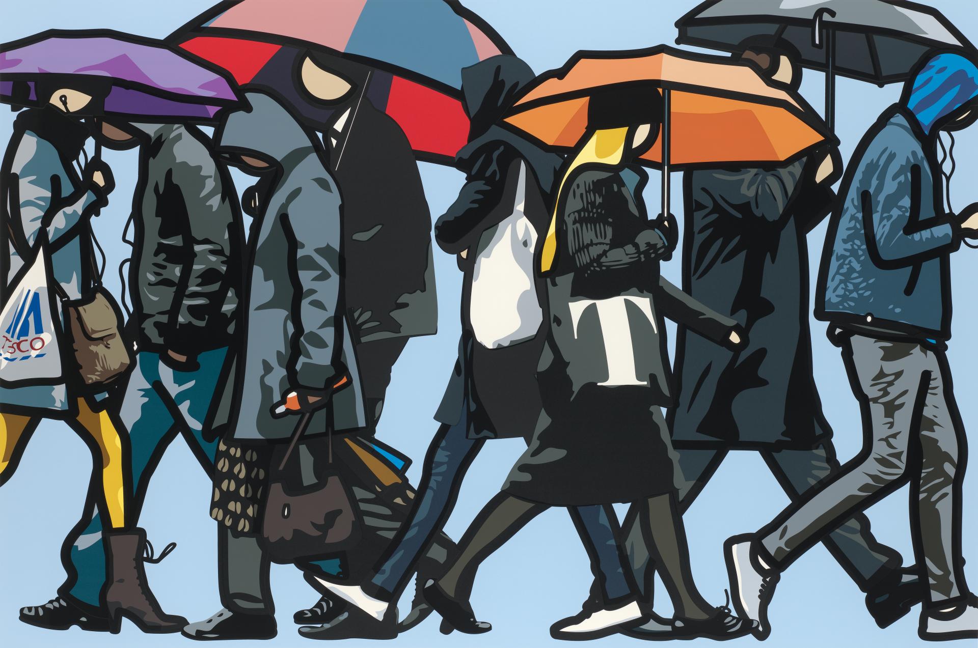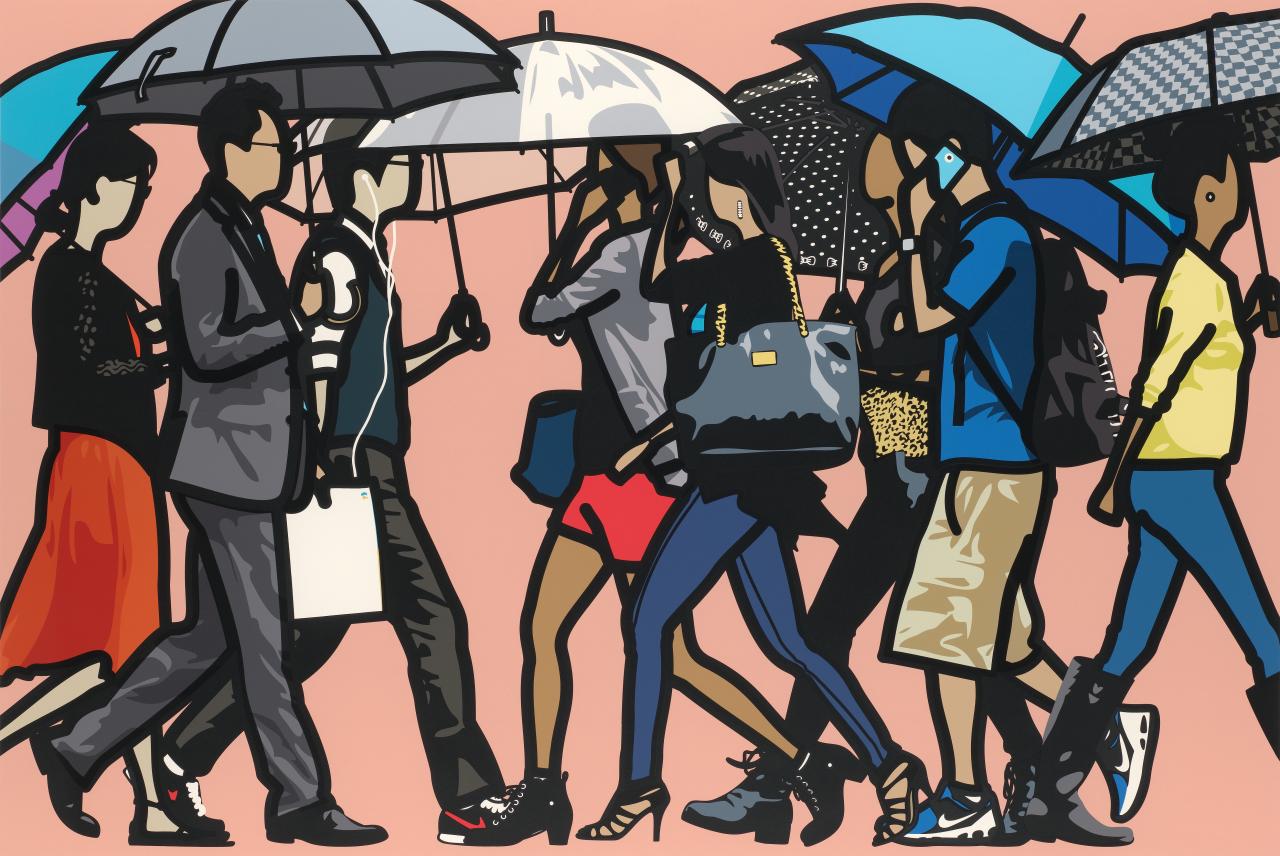 Starting with photographs, Opie uses digital programs to trace thick outlines over figures and fills the sections of blank space with flat colour. His Walking in the rain series features people captured mid-stride and provides a snapshot of his subject’s personality through