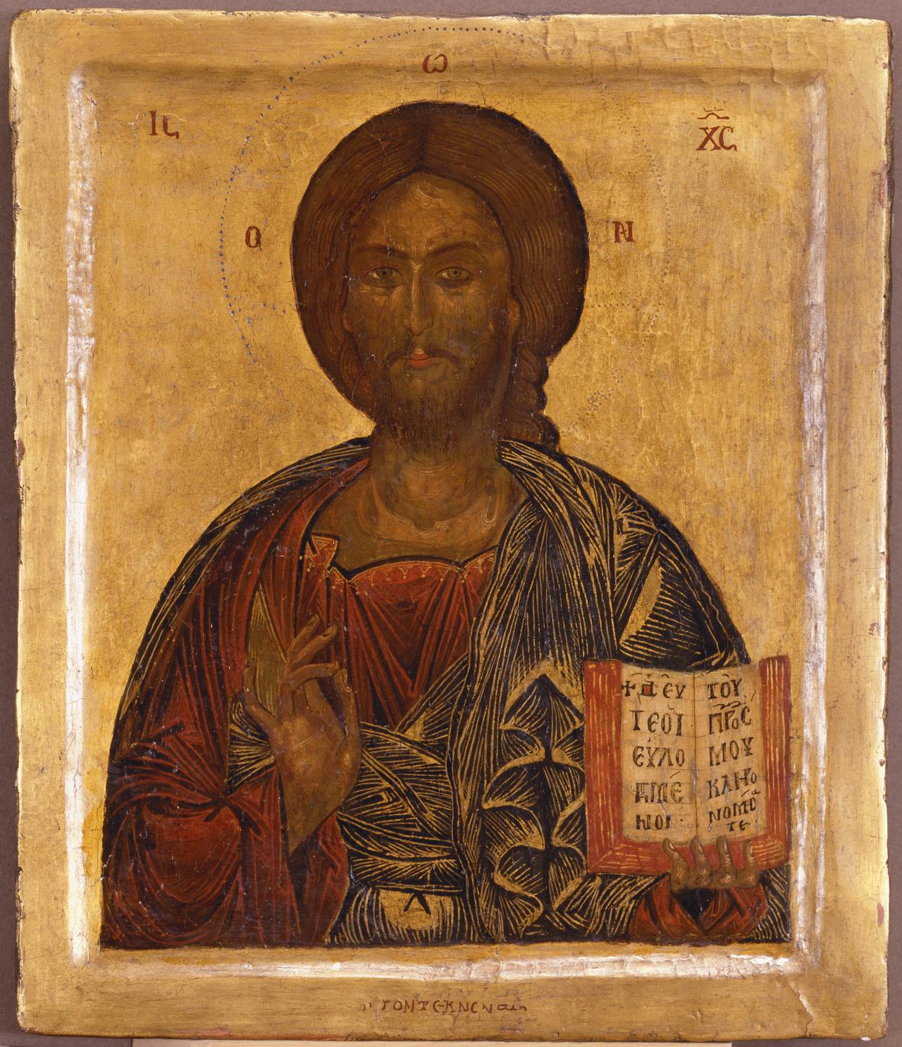 This painting is part of a very longstanding tradition in Christian Iconography. Painted in the 17th Century, it depicts Christ as Pantocrator (Lord of All). Beginning in the sixth and seventh century, the image of Crist Pantocrator was used in mosaics and encaustic panels. Encaustic painting is a painting technique in which coloured pigments are mixed with hot liquid wax. Although this style of representation was most popular in the Byzantine era, it continues in popularity in Orthodox and Eastern Catholic churches today.