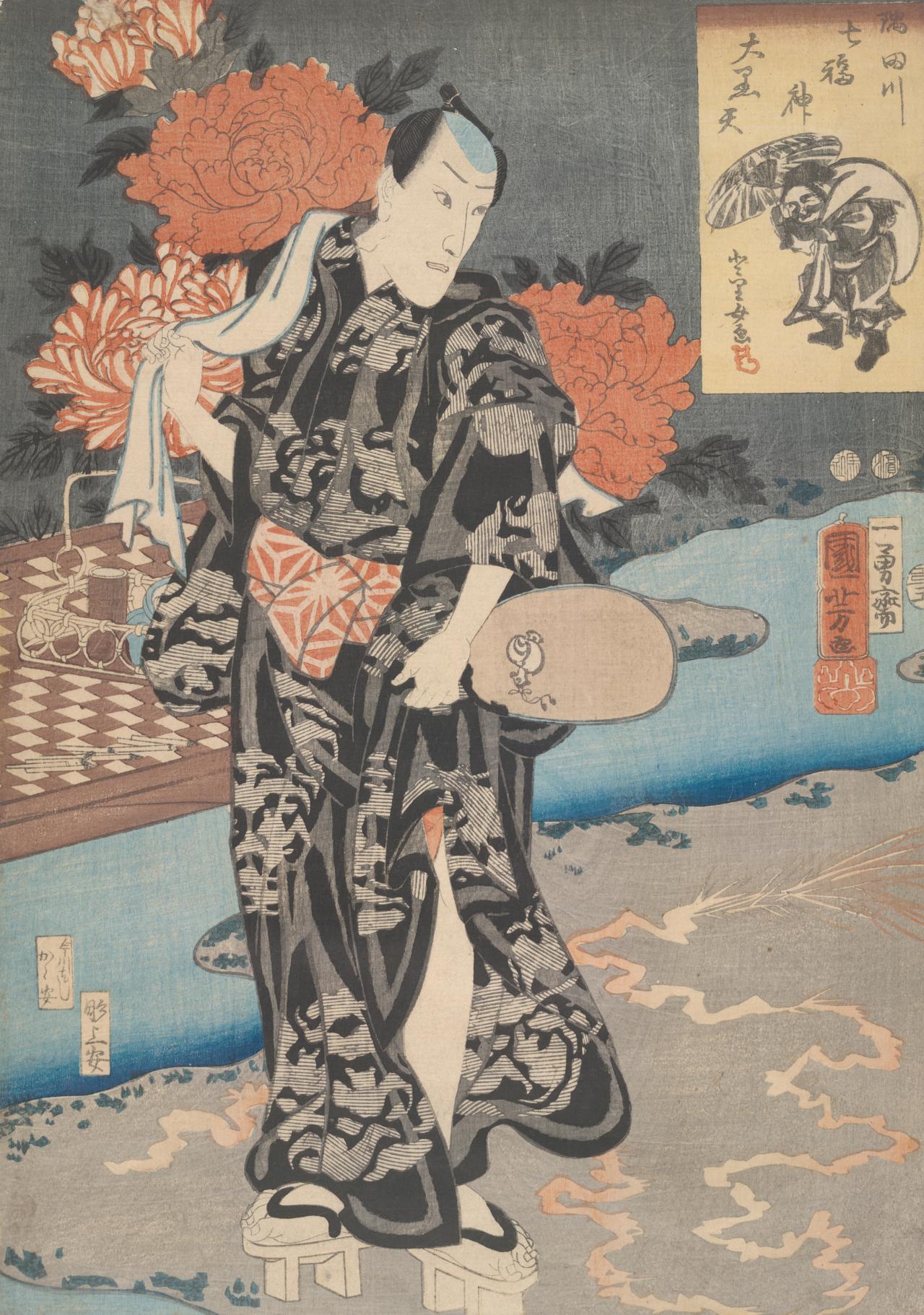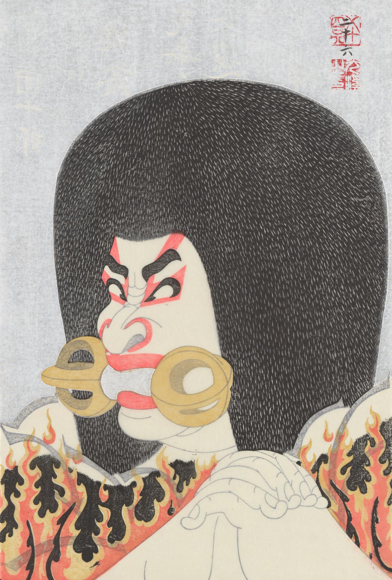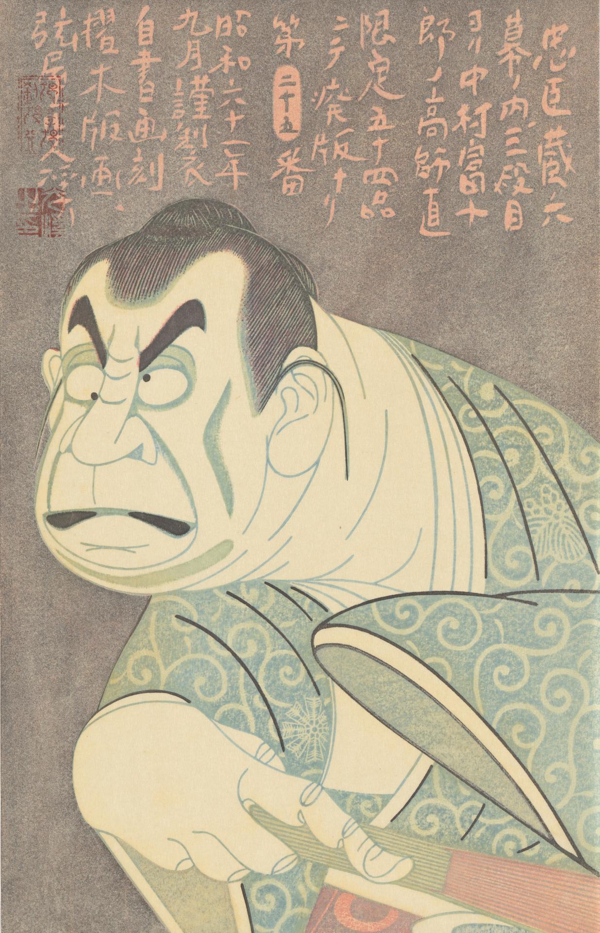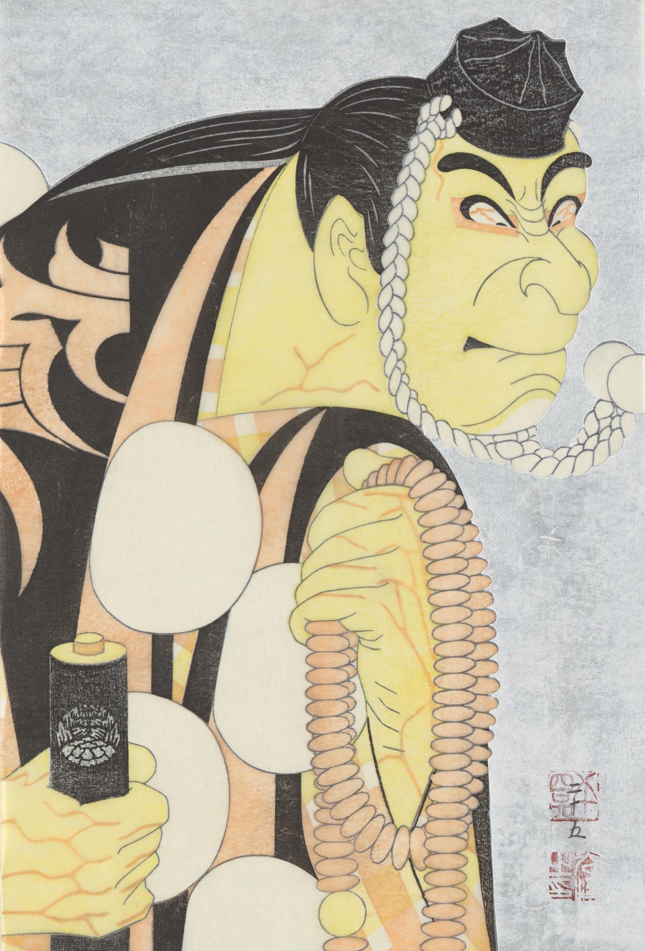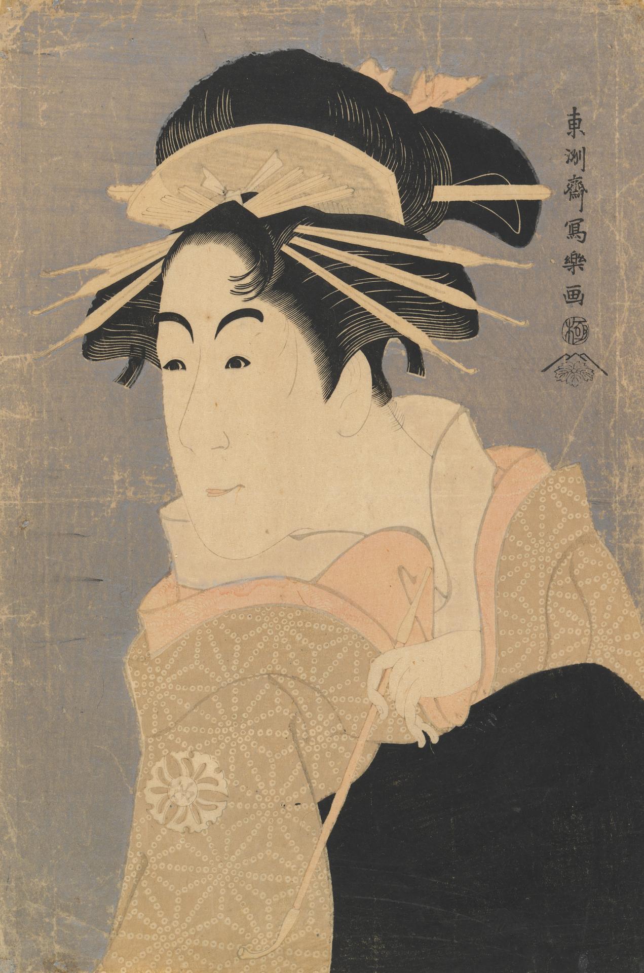 In this example of yakusha-e, Toshusai Sharaku depicts the actor Matsumoto Yonesaburo performing as Shinobu, the daughter of a samurai, disguised as a high-ranking courtesan. In 1629 a law was passed banning women from appearing in kabuki. After this date kabuki as performed solely by men who were required to adopt male and female roles. Male actors who perform in female roles are known as Onnagata (女形). We see the craft of the actor depicted here in the delicate hand gesture holding a long pipe, and the beauty of the character shown through her delicate shibori dyed kimono and immaculate hairstyle with hairpins and comb.