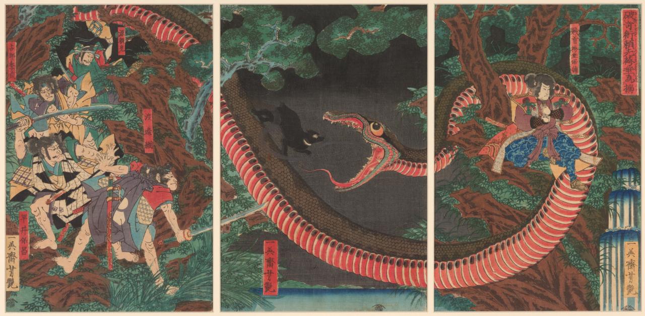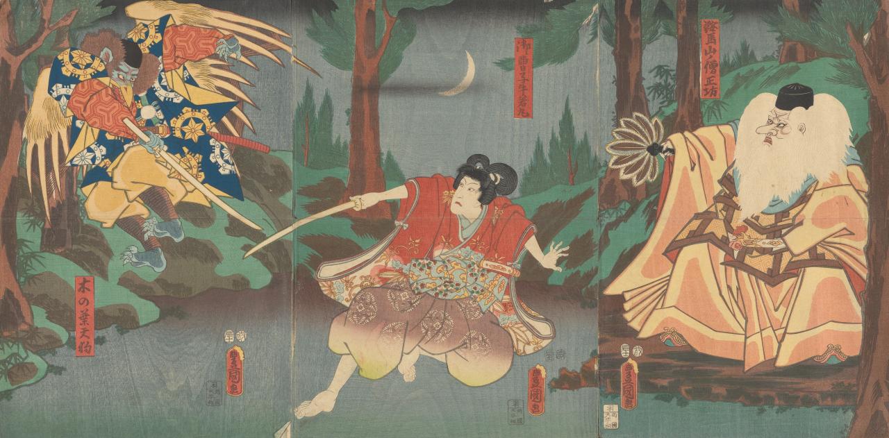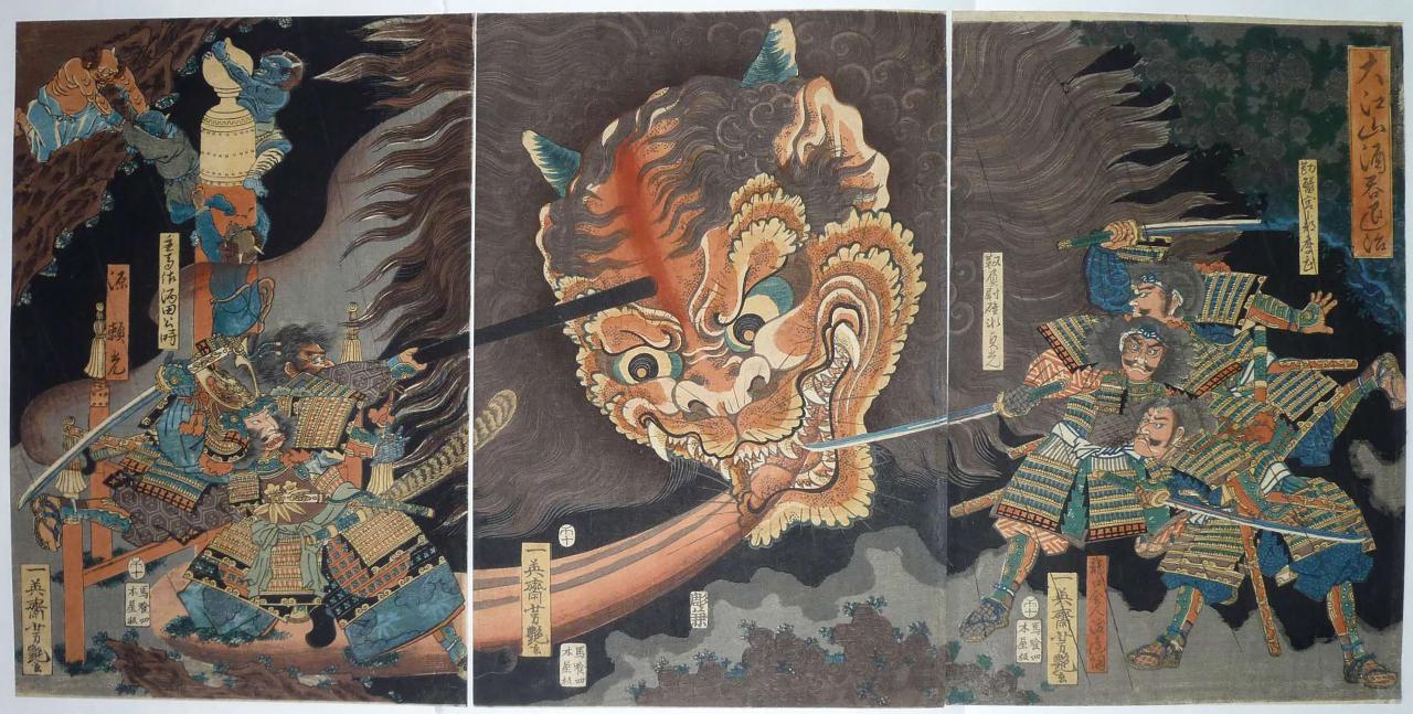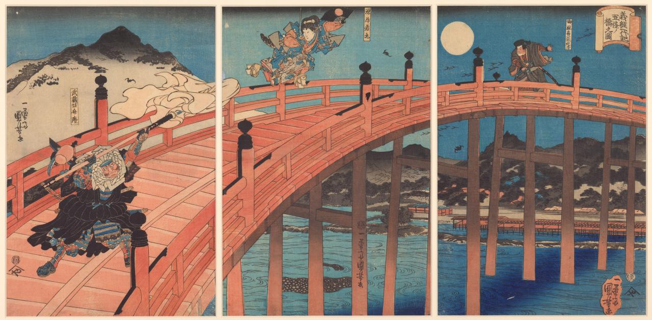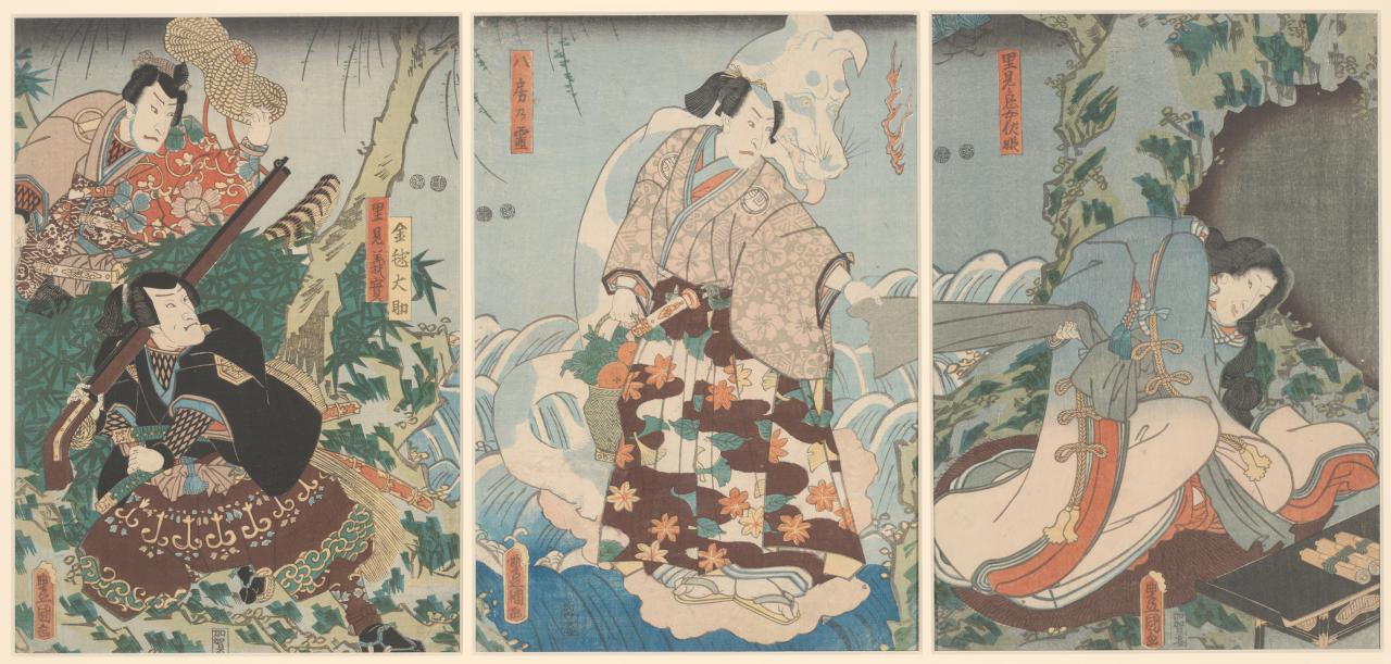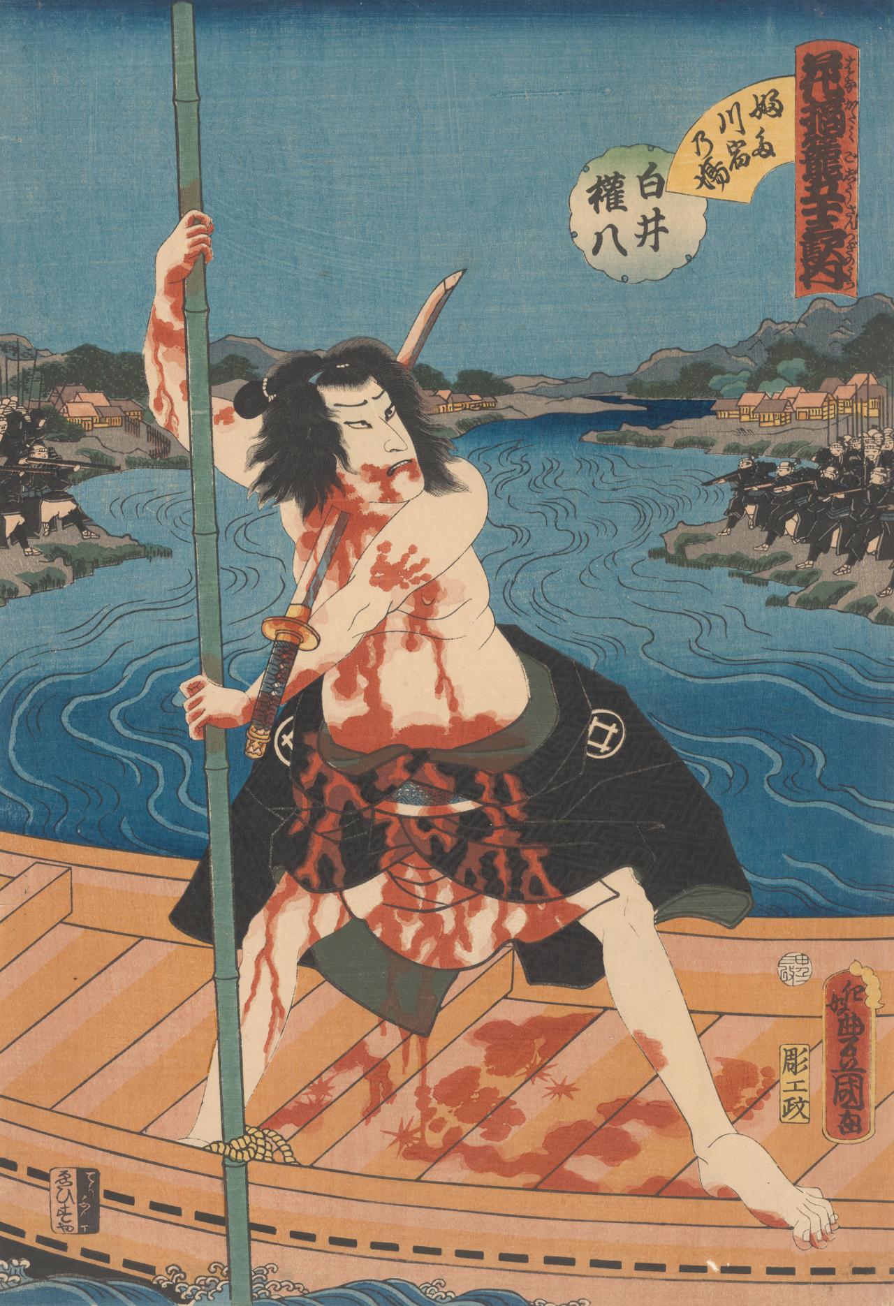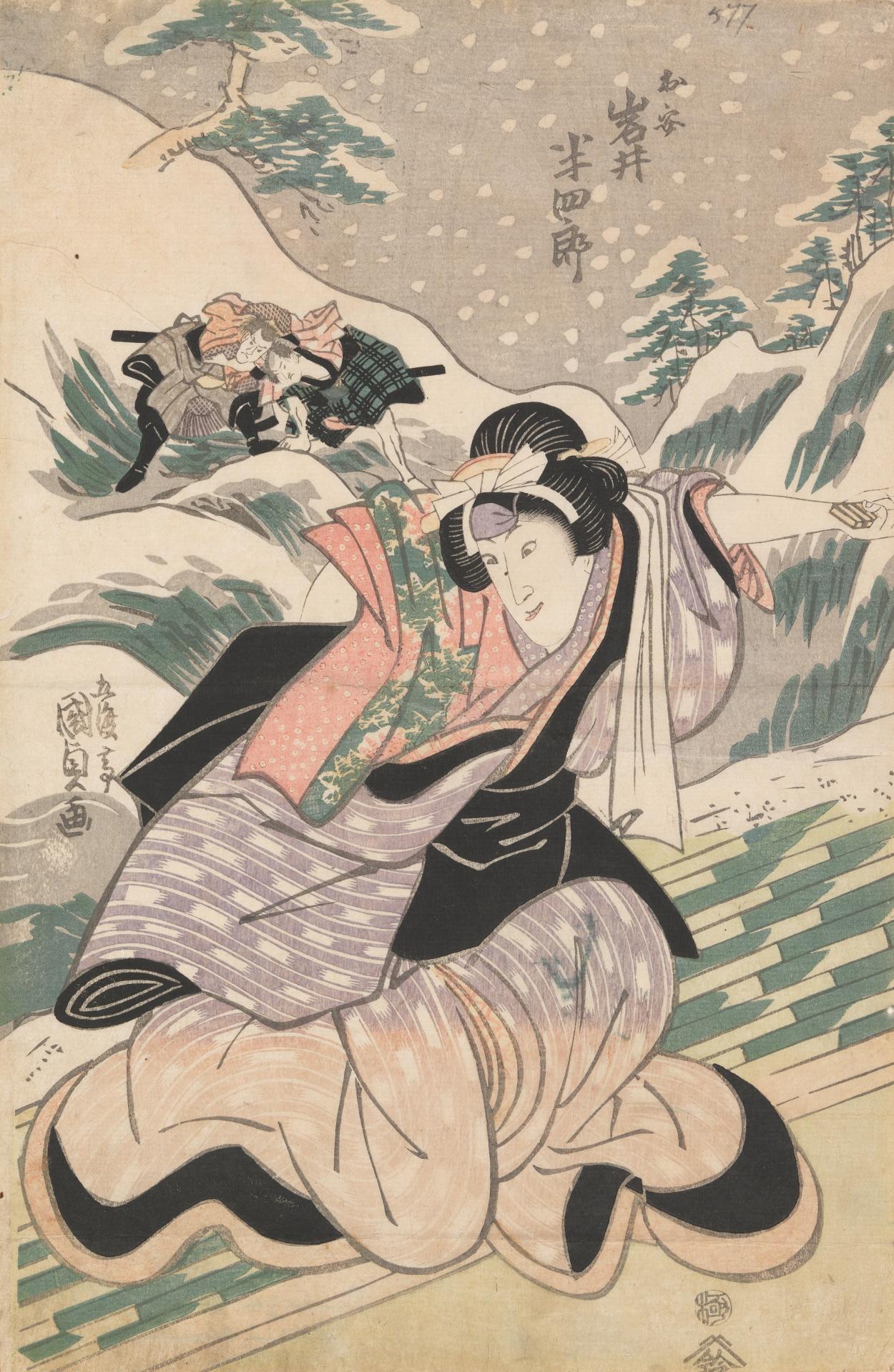 In this example of yakusha-e, Toshusai Sharaku depicts the actor Matsumoto Yonesaburo performing as Shinobu, the daughter of a samurai, disguised as a high-ranking courtesan. In 1629 a law was passed banning women from appearing in kabuki. After this date kabuki as performed solely by men who were required to adopt male and female roles. Male actors who perform in female roles are known as Onnagata (女形). We see the craft of the actor depicted here in the delicate hand gesture holding a long pipe, and the beauty of the character shown through her delicate shibori dyed kimono and immaculate hairstyle with hairpins and comb.
