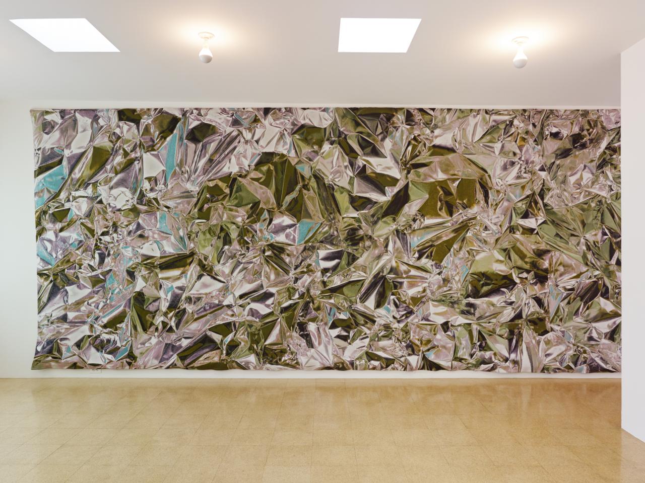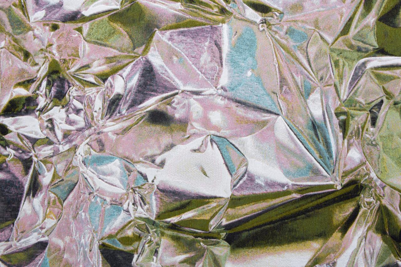 Pae White (born 1963) is an American artist who currently lives and works in Los Angeles, California. Since 2004 Pae White has produced large scale tapestries that highlight the details of everyday materials: fabric swatches, junk mail, advertising, wrapping paper. White photographs the objects, creating a digital image which is then reproduced by artisans – machine-loomed into a woven form. Her Triennial work Spearmint to Peppermint 2013 is an enormous silver-green foil wrapper, crumpled into a topography of folds and creases to form a grand abstract tapestry. What appears to be a shimmering metallic surface reveals itself to be threads and fibres on closer inspection.