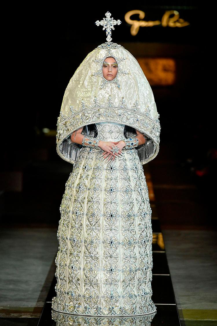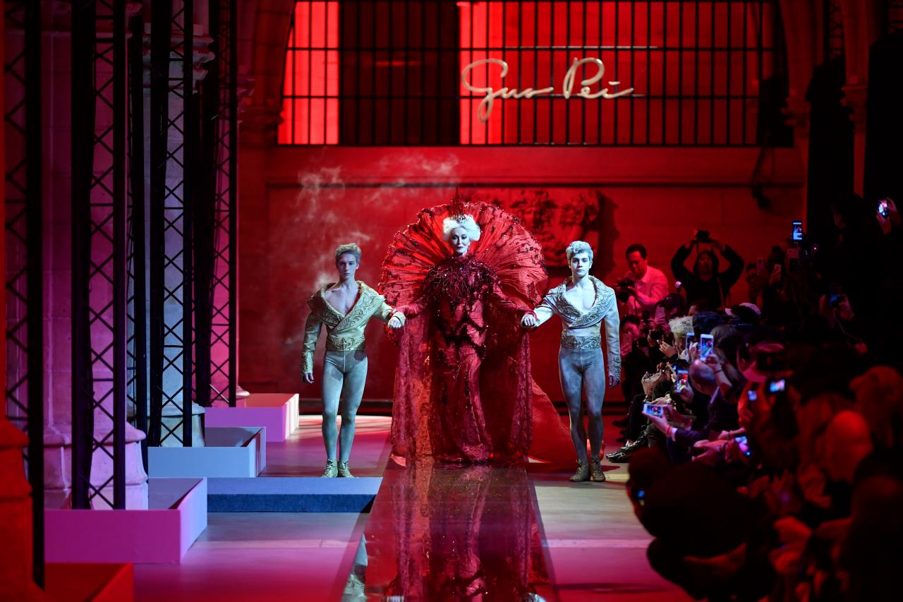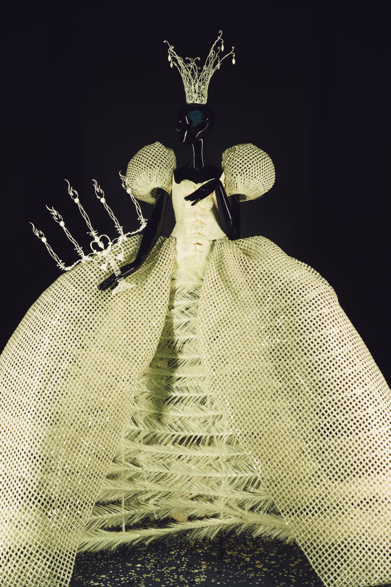 The NGV Triennial features the 2017 spring−summer couture collection, Legend, which took two years to create using the skills of more than 300 embroiderers and 200 designers, pattern makers and seamstresses. The collection was first presented at La Conciergerie, the building where Marie Antoinette, the last Queen of France, was imprisoned and beheaded. Marie Antoinette’s story infuses the collection, which was initially inspired by the history of the missionaries, craftspeople and artists who worked within the Abbey of Saint Gall in Switzerland. Almost all of the fabrics in the Legend collection were manufactured in the town of Saint Gallen, known for its textile manufacturers and embroiderers. When the collection debuted the show opened with Luminous spirit, 2017 a garment made from phosphorescent fabric that glows ghost-like, evoking the spirit of the eighteenth-century queen. It concluded with Red goddess, 2017, a deep red robe of silk woven with fine metal fibres, modelled by 86-year-old American model Carmen Dell’ Orefice.