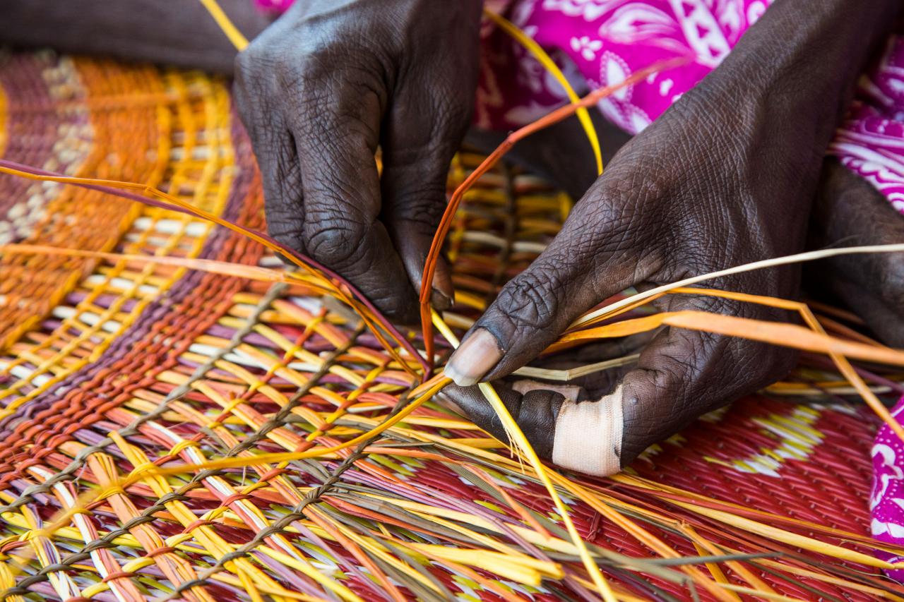 Yolgnu women have a strong tradition of weaving. Objects such as fish traps and nets, mats, string bags, baskets and dilly bags are traditionally made using materials harvested from plants such as pandanus, sandpalm and kurrajong, and coloured with natural dyes.