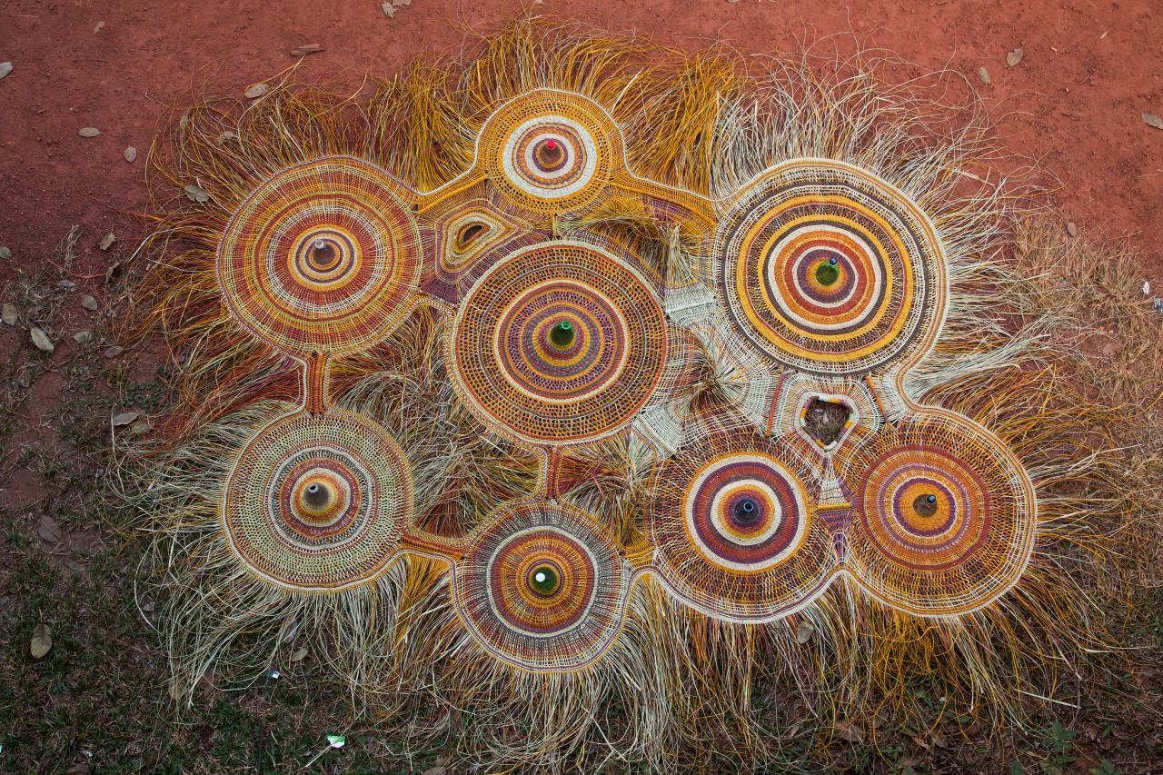 For the NGV project the Ramingining weavers created a large installation in which individual stories are woven together in a work that reflects both the landscape and kinship connections.