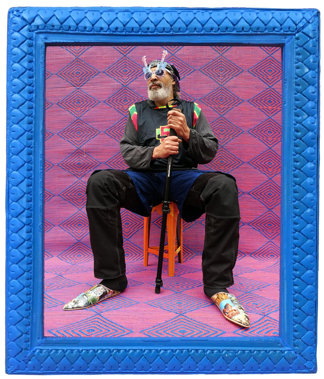 Hassan Hajjaj is a multidisciplinary artist whose work has embraced film, advertising, photography and graphic design. Born in Morocco in 1961, Hajjaj moved to London in the 1980s. His work mixes music, street culture and design, celebrating individuality and embracing the cultural diversity characteristic of both London and Morocco. In Hajjaj’s photos an array of compelling characters – often friends of the artist – are posed before colourful patterned backdrops. Dressed and styled by Hajjaj, the subjects wear bright clothes that often incorporate fabrics printed with counterfeit brands and logos, purchased in markets in London or Marrakesh. The images are framed in vibrant repeating patterns of found objects such as tins, product labels, plastic construction blocks or tyre rubber. The photographs embrace a Pop–kitsch aesthetic that urges us to celebrate individuality and personal creativity and prompts us to question stereotypes, consumerism and global culture.