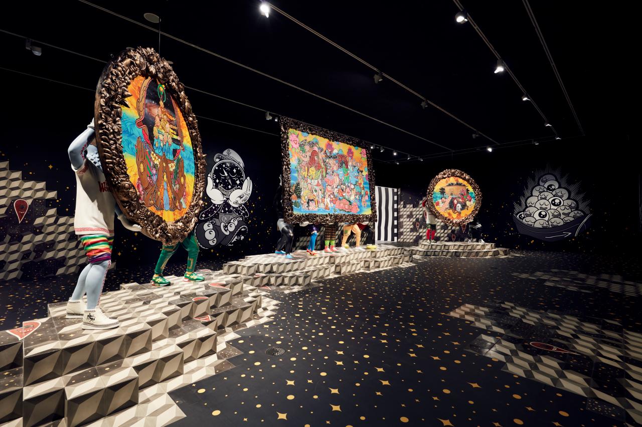 For the NGV Triennial Hahan has produced an installation called Young speculative wanderers, 2014–15, that looks at art and the art world including artists, collectors and galleries. It consists of three paintings, each supported by a group of figures in a room decorated with patterned tiles and painted walls.