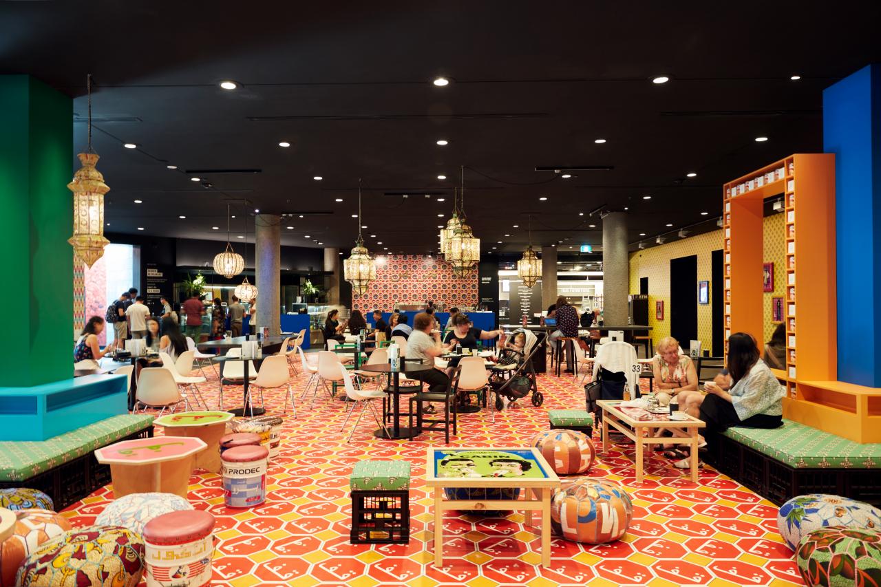 Hajjaj also designs interiors. Like his clothes and photographs, these installations are a mix of vibrant textiles and eclectic furnishings, creating a playful atmosphere in which the everyday is treasured and the unique is celebrated. For the NGV Triennial Hajjaj has styled the Gallery Kitchen to re-create the mood of a modern Moroccan tea house, including Moroccan food and music. Custom-designed patterned wallpapers cover the walls and floor and visitors have the opportunity to take their own photographic self-portraits against Hajjaj’s decorative backdrop.