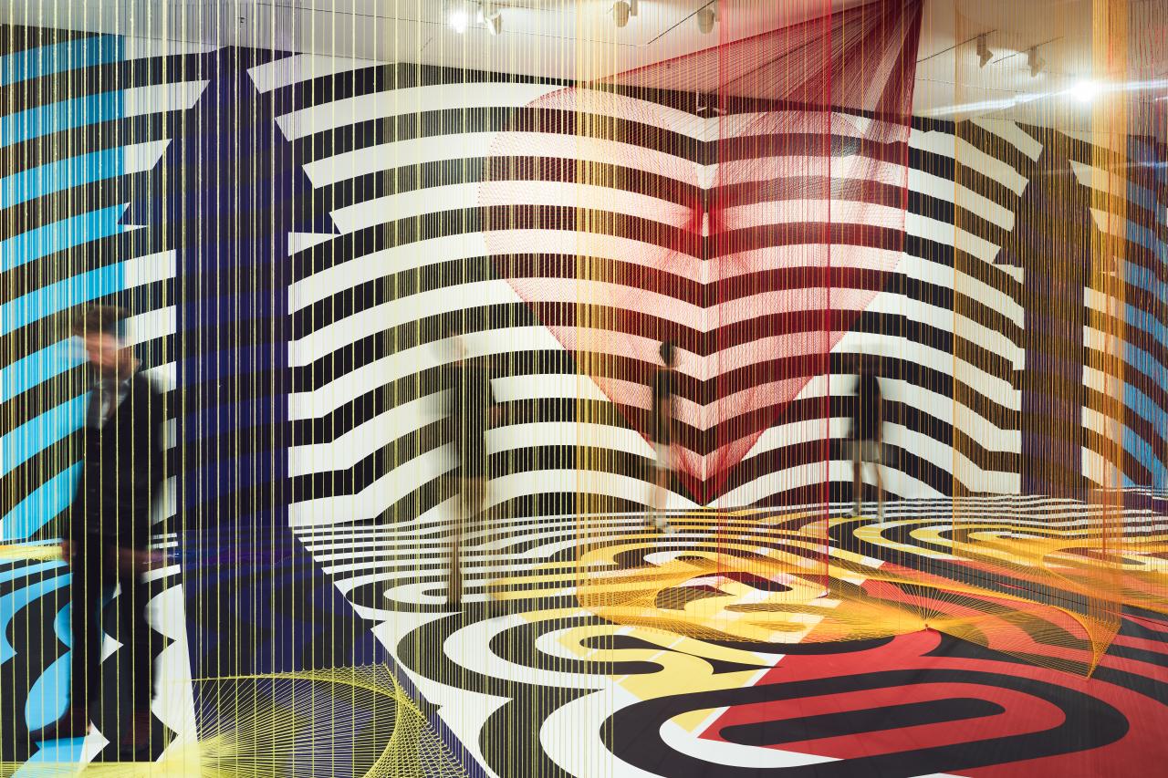 Pae White’s work Untitled 2017 is an immersive installation inspired by the graphic design for the 1968 Olympics, held in Mexico City. The Olympic design – which incorporated the text ‘Mexico 68’ in a rounded font with strong black and white parallel lines along with the Olympic rings – was intended to recall the patterns of the Huichole Indians of Mexico. In Untitled 2017 the viewer negotiates the maze of super graphics, bright threads and mirrors, becoming a part of the installation as they pass through it.