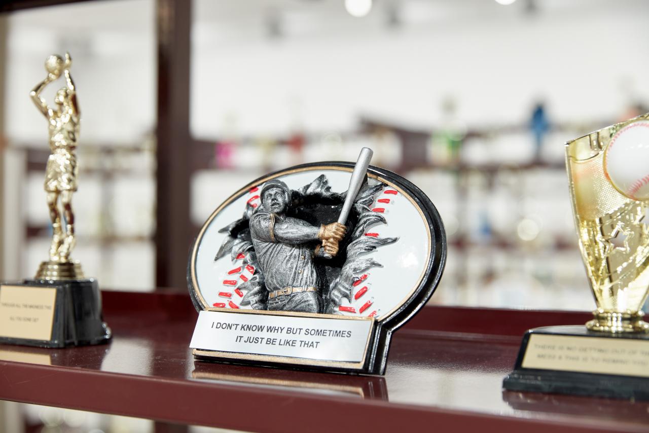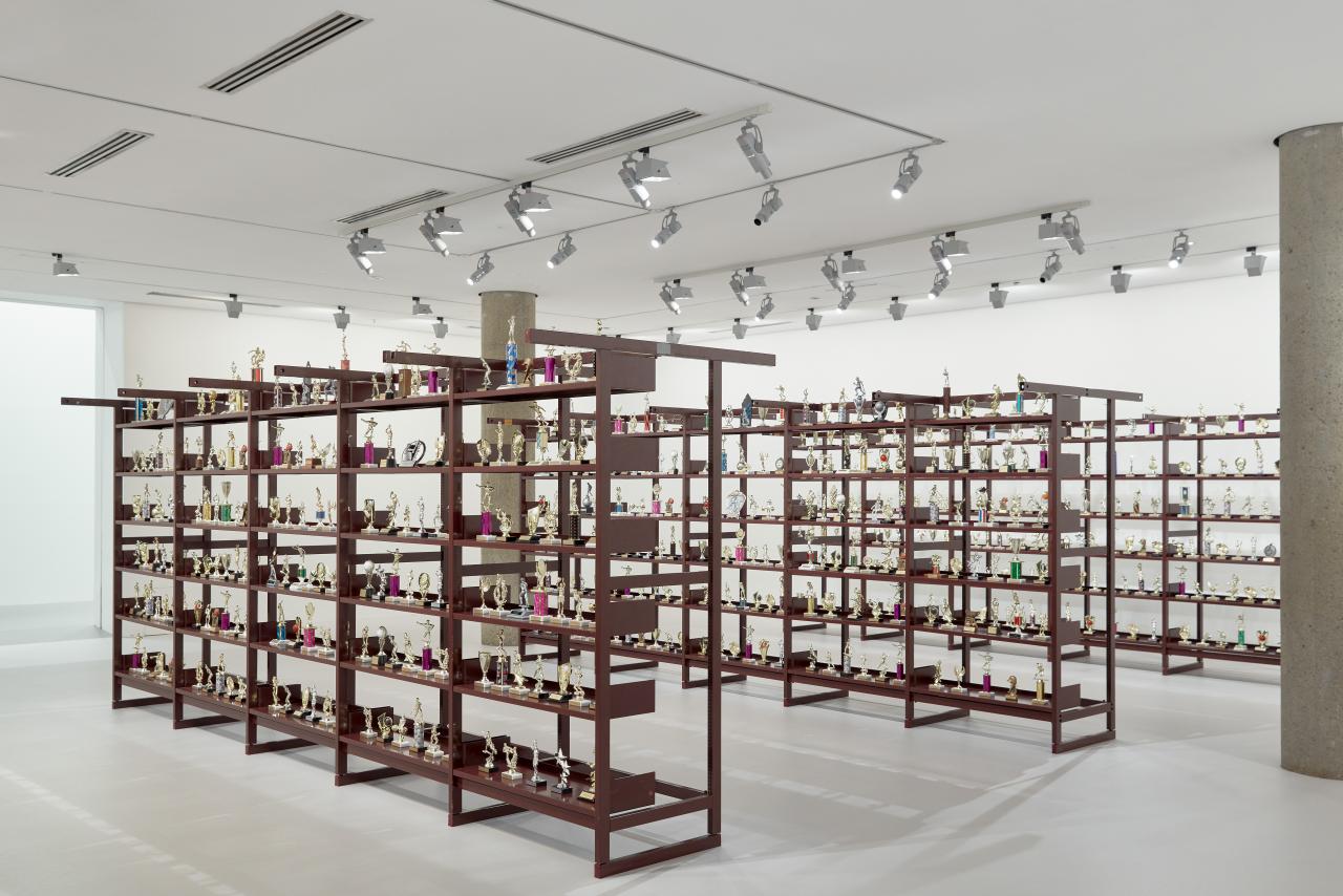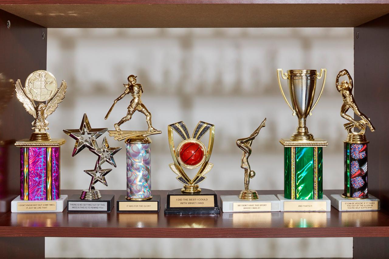 Diamond Stingily is an American artist, writer and poet. Her NGV Triennial work, In the middle but in the corner of 176th place, is an installation of more than seven hundred athletic trophies displayed on metal shelving. At first glance, the trophies look like those typically given to participants of conventional competitions at awards ceremonies. A closer look reveals that their plaques are replaced by short passages such as ‘I DID THE BEST I COULD WITH WHAT I HAD’ or ‘I DID IT FOR THE GLORY’.