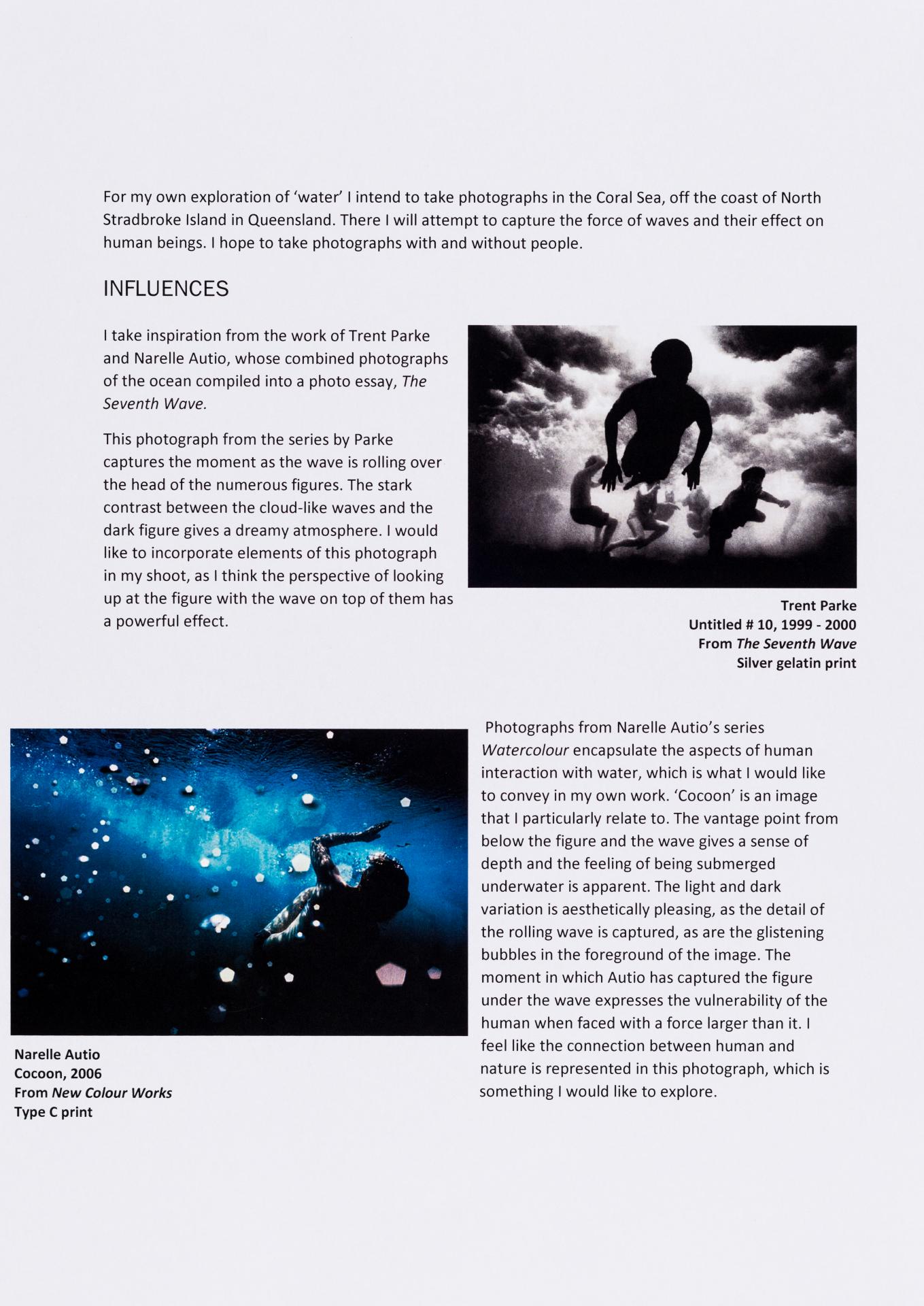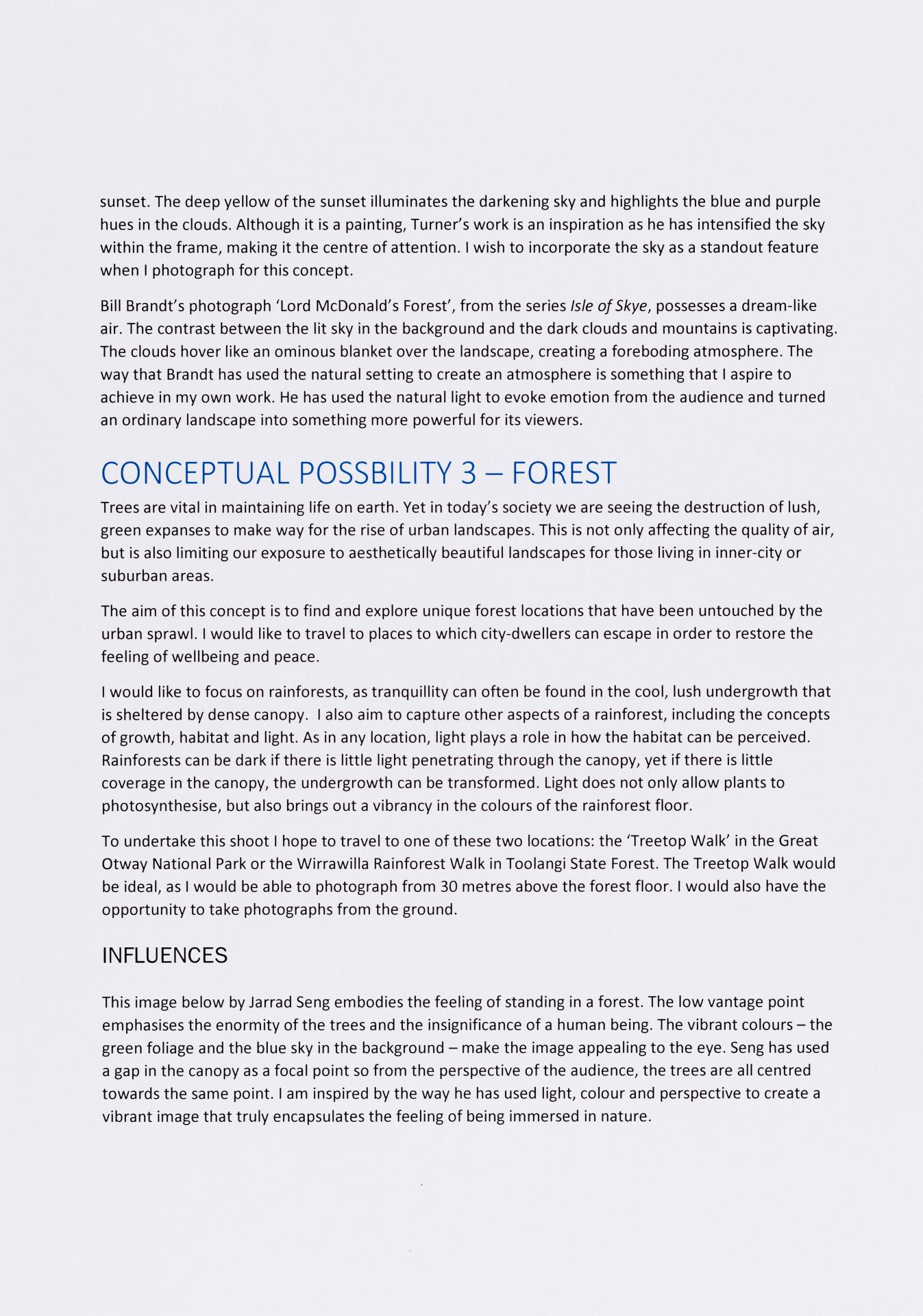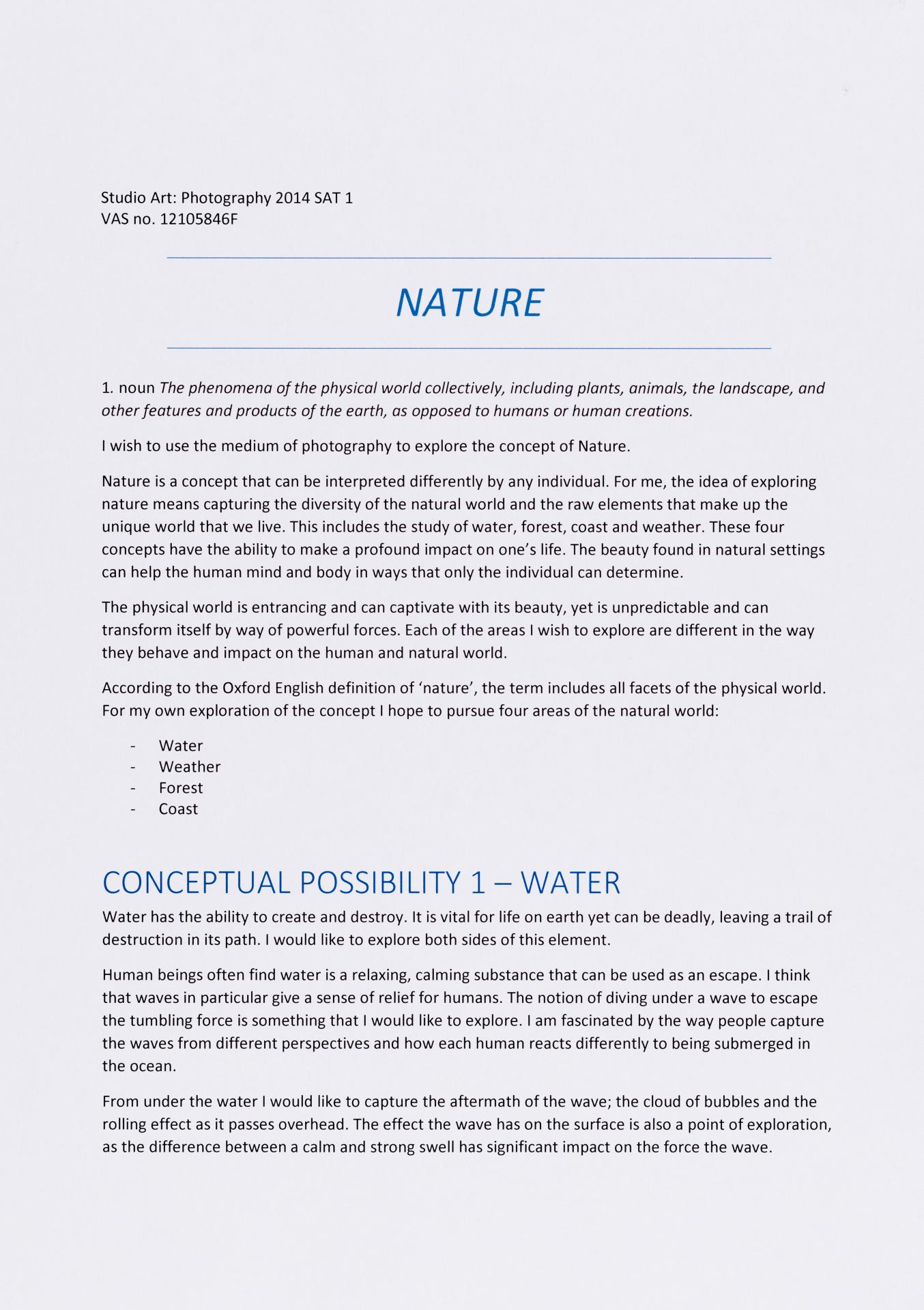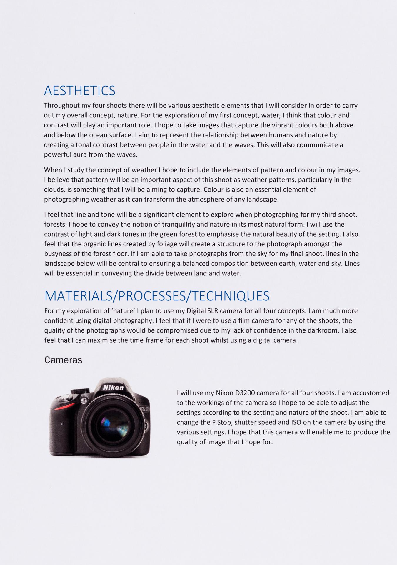 The exploration proposal should have an explanation on the focus and subject matter that is to be explored and developed as part of the design process. There needs to be a discussion of conceptual possibilities and how ideas will be explored. Art forms that will be part of the process must be referenced and an explanation given of how aesthetic qualities will be explored in relation to the stated ideas. Materials, techniques, process and skills should be referenced and discussed in relation to the ideas to be explored.