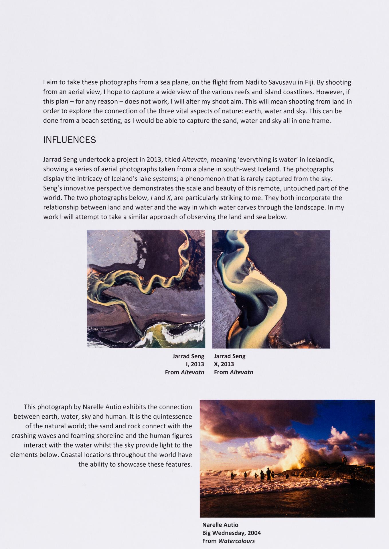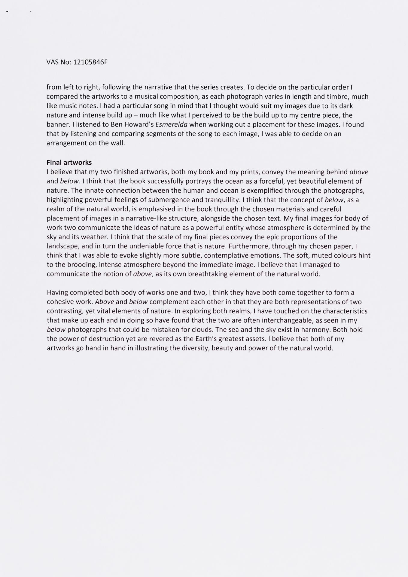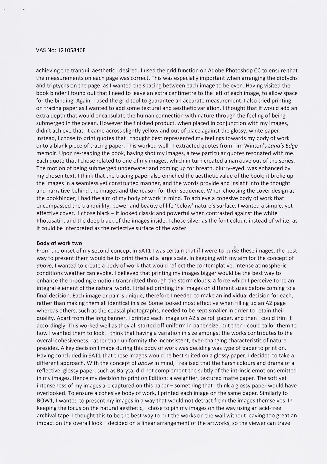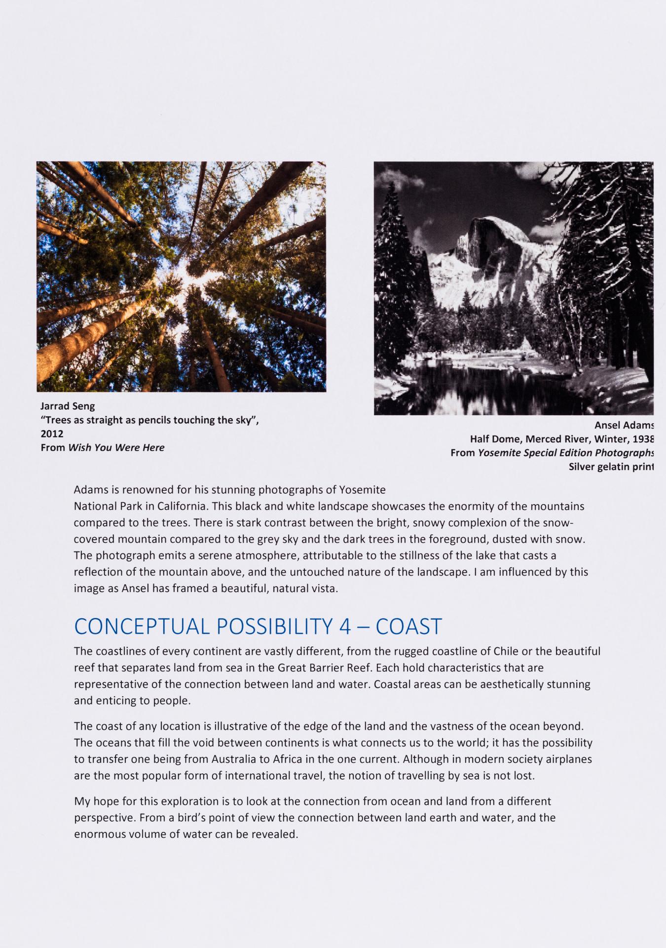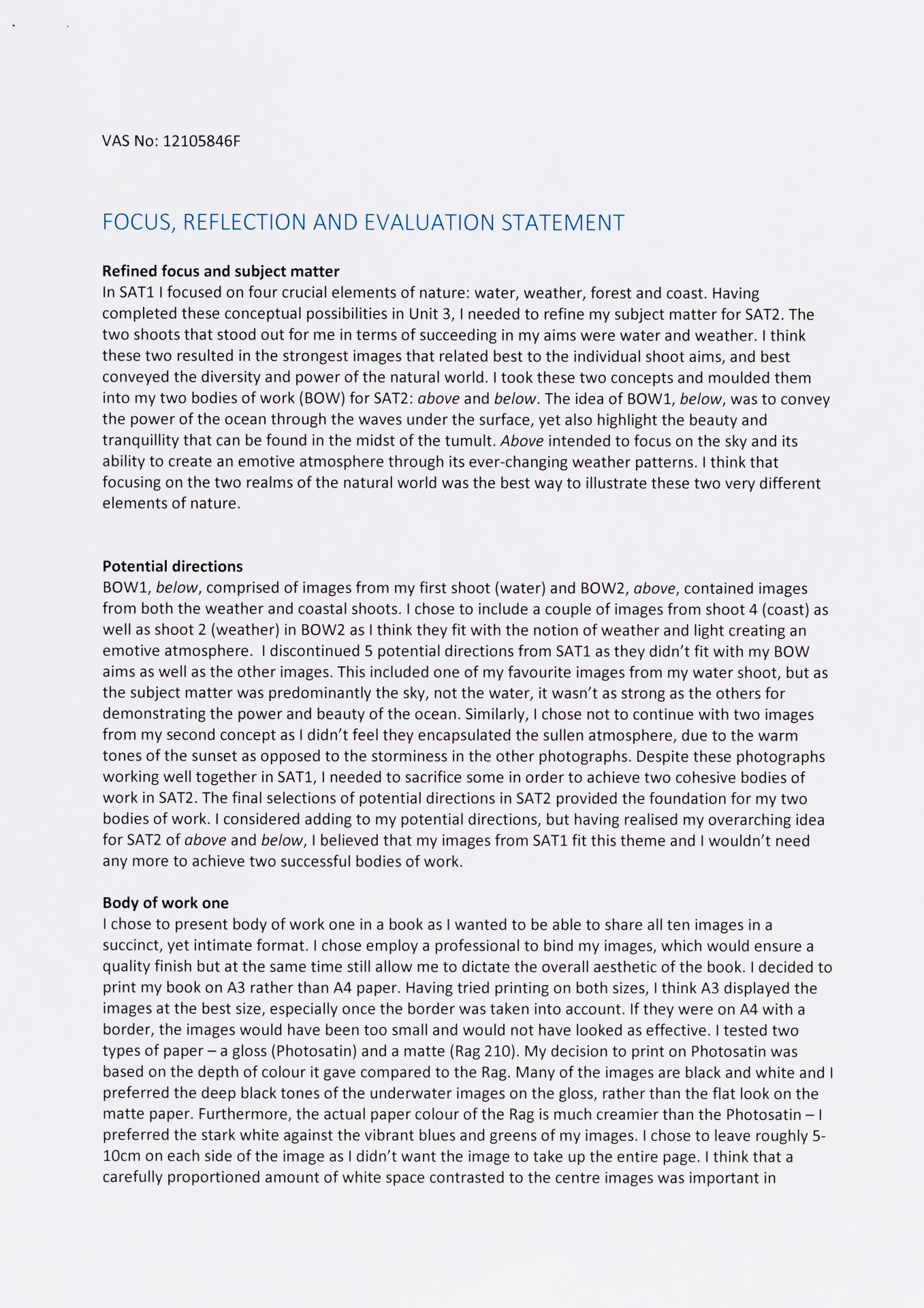 The exploration proposal should have an explanation on the focus and subject matter that is to be explored and developed as part of the design process. There needs to be a discussion of conceptual possibilities and how ideas will be explored. Art forms that will be part of the process must be referenced and an explanation given of how aesthetic qualities will be explored in relation to the stated ideas. Materials, techniques, process and skills should be referenced and discussed in relation to the ideas to be explored.