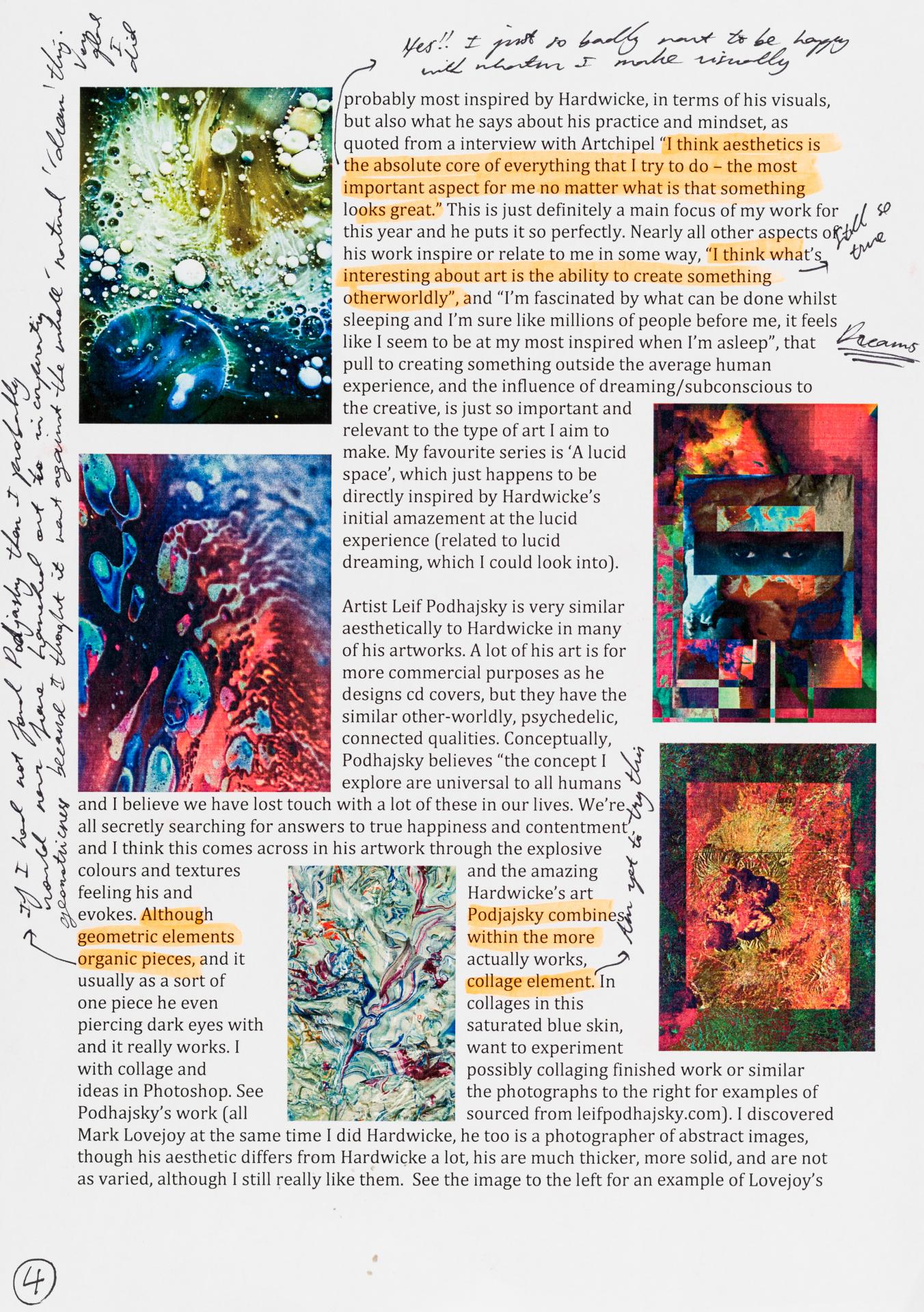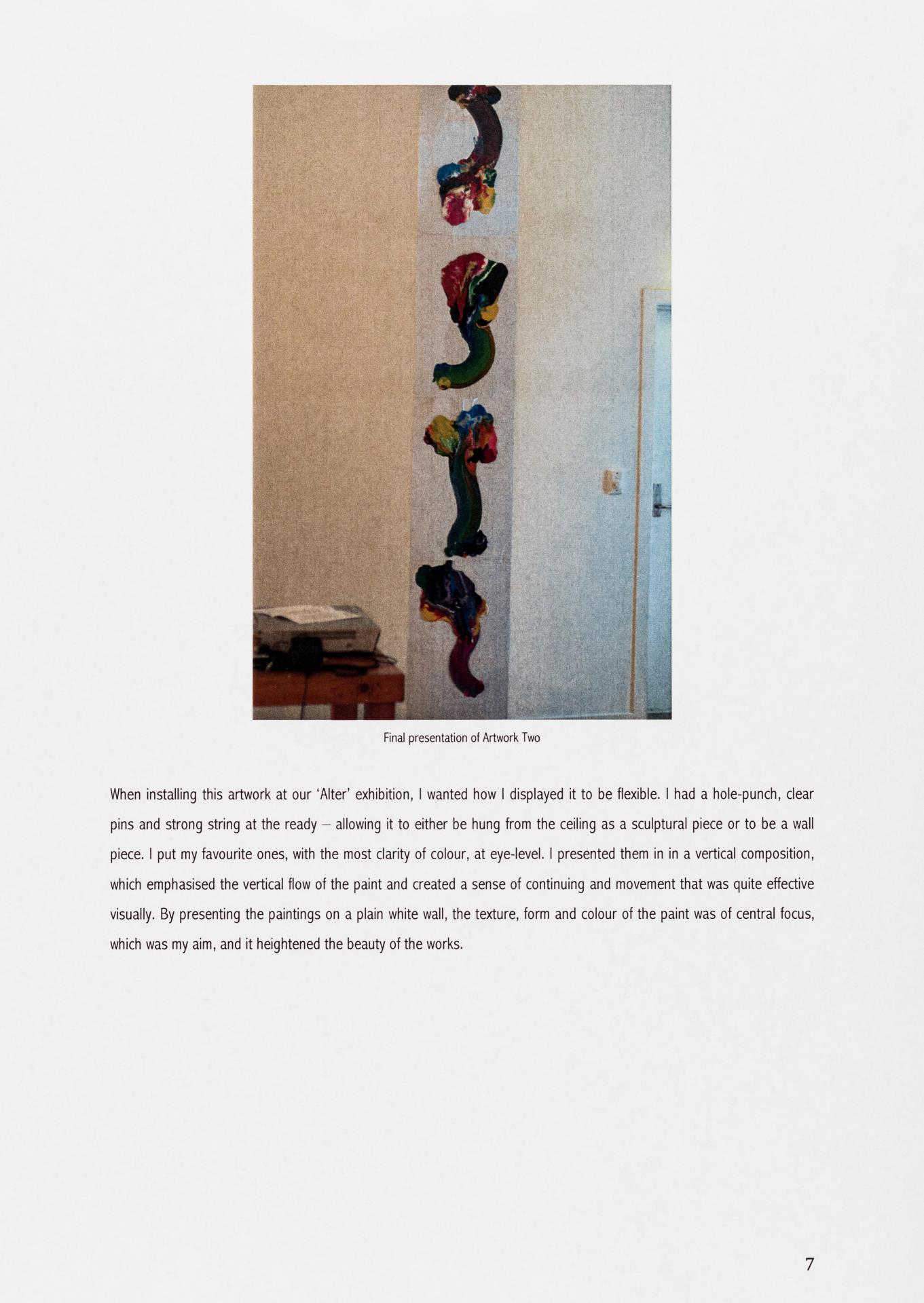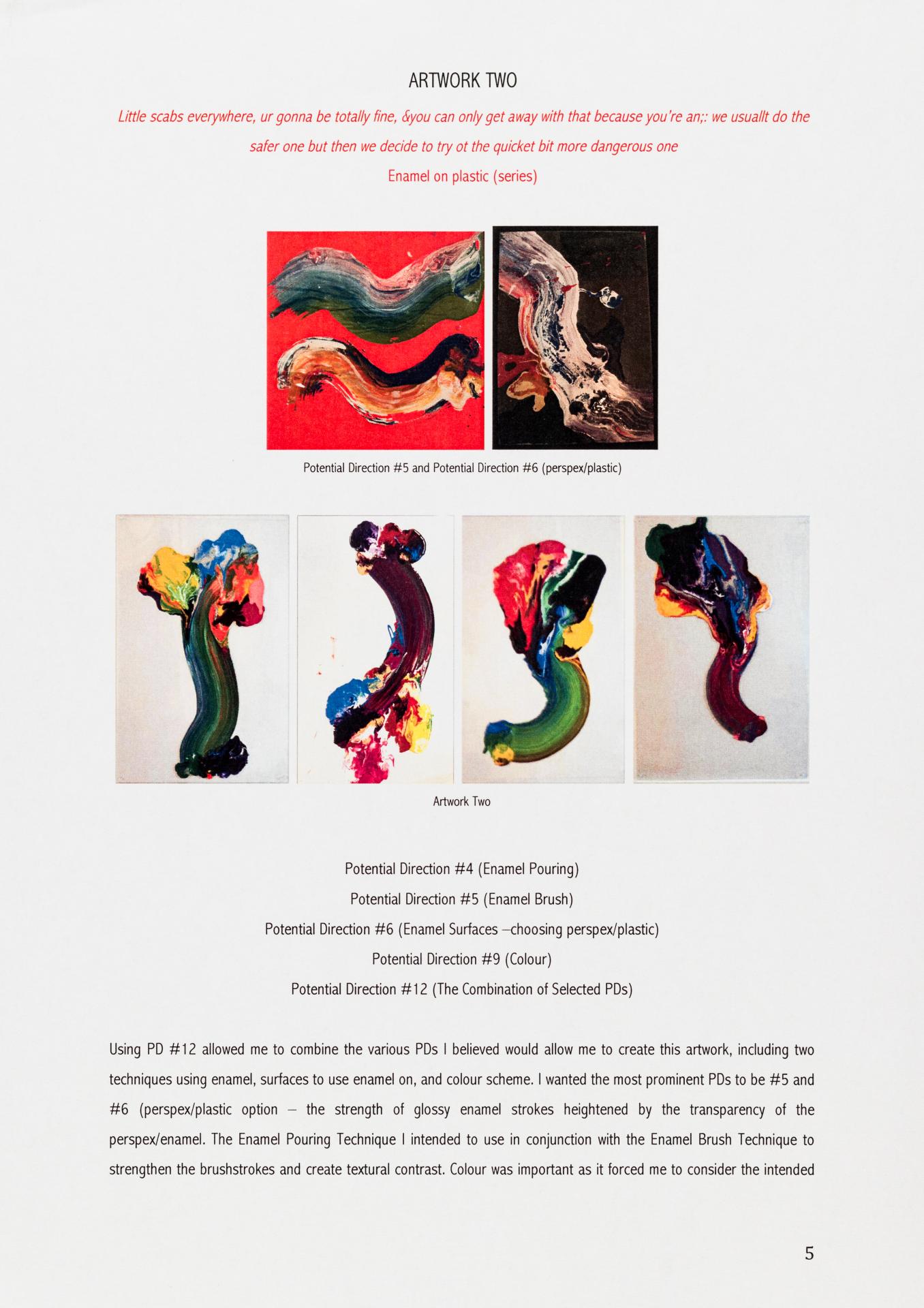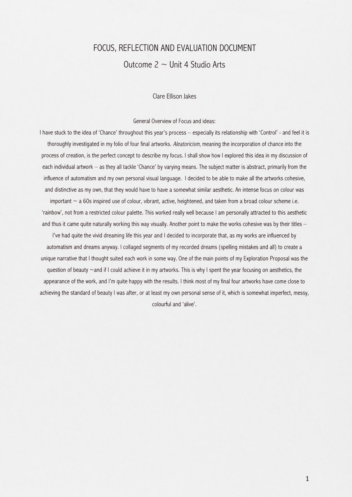 : Documentation that clarifies the focus of the folio evaluates the use of potential directions in the finished artworks and reflects on the cohesive folio