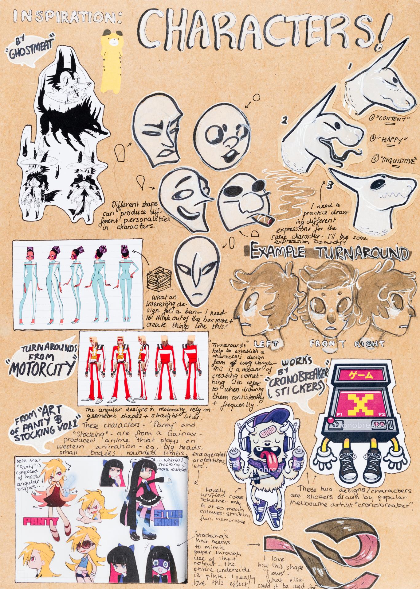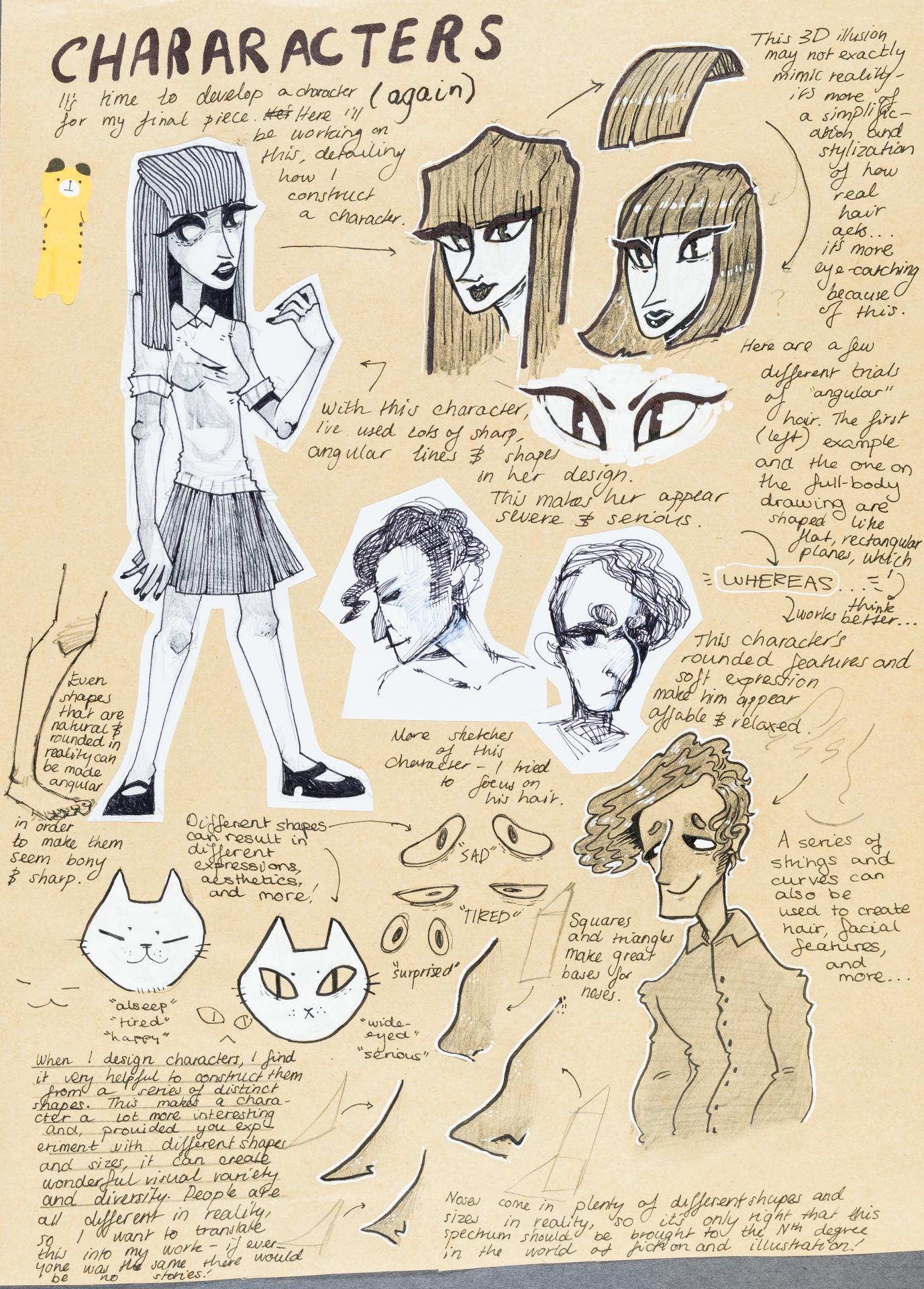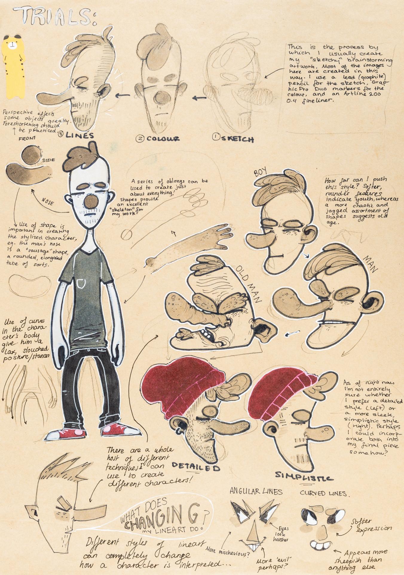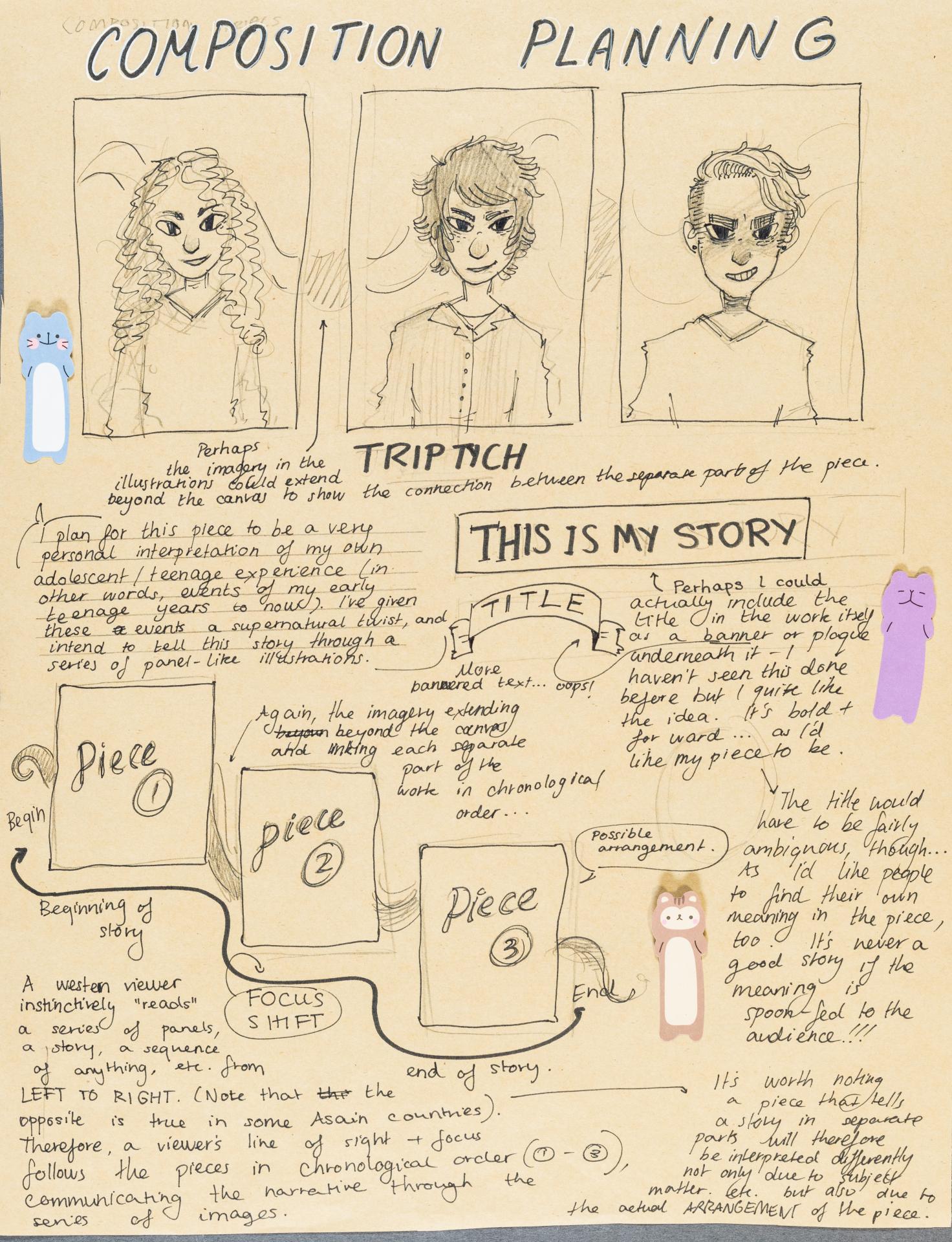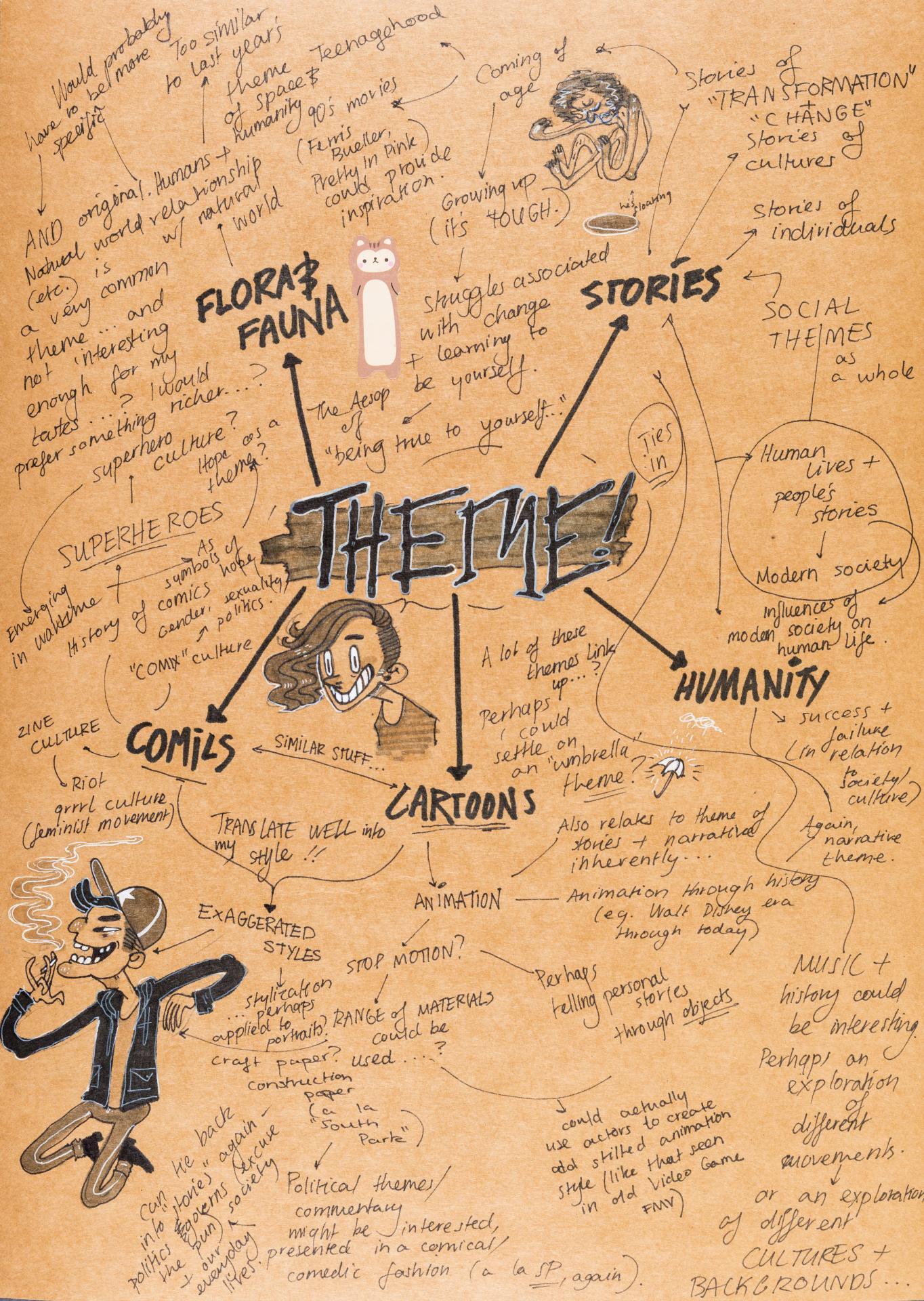 Emerson began his folio by completing several concept maps of thoughts and ideas to draw upon over the year. These related to themes that involved an individual’s search for true identity, love and acceptance. He created lists of possible ideas, making connections between a range of areas of interest, including various narrative structures.