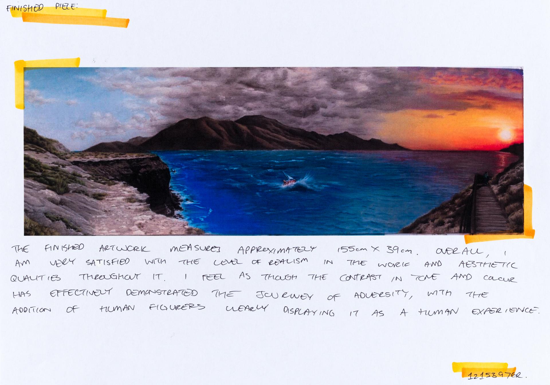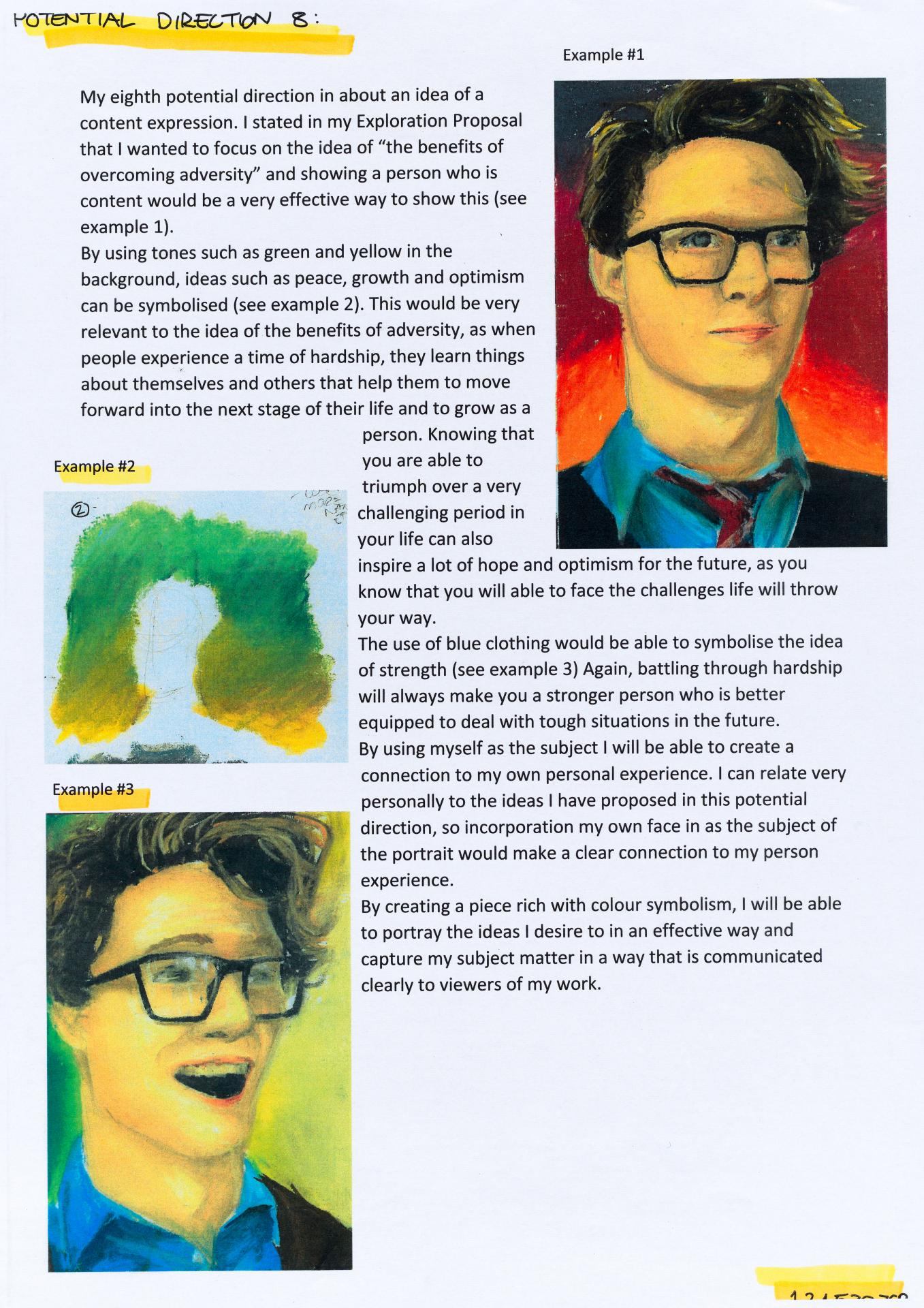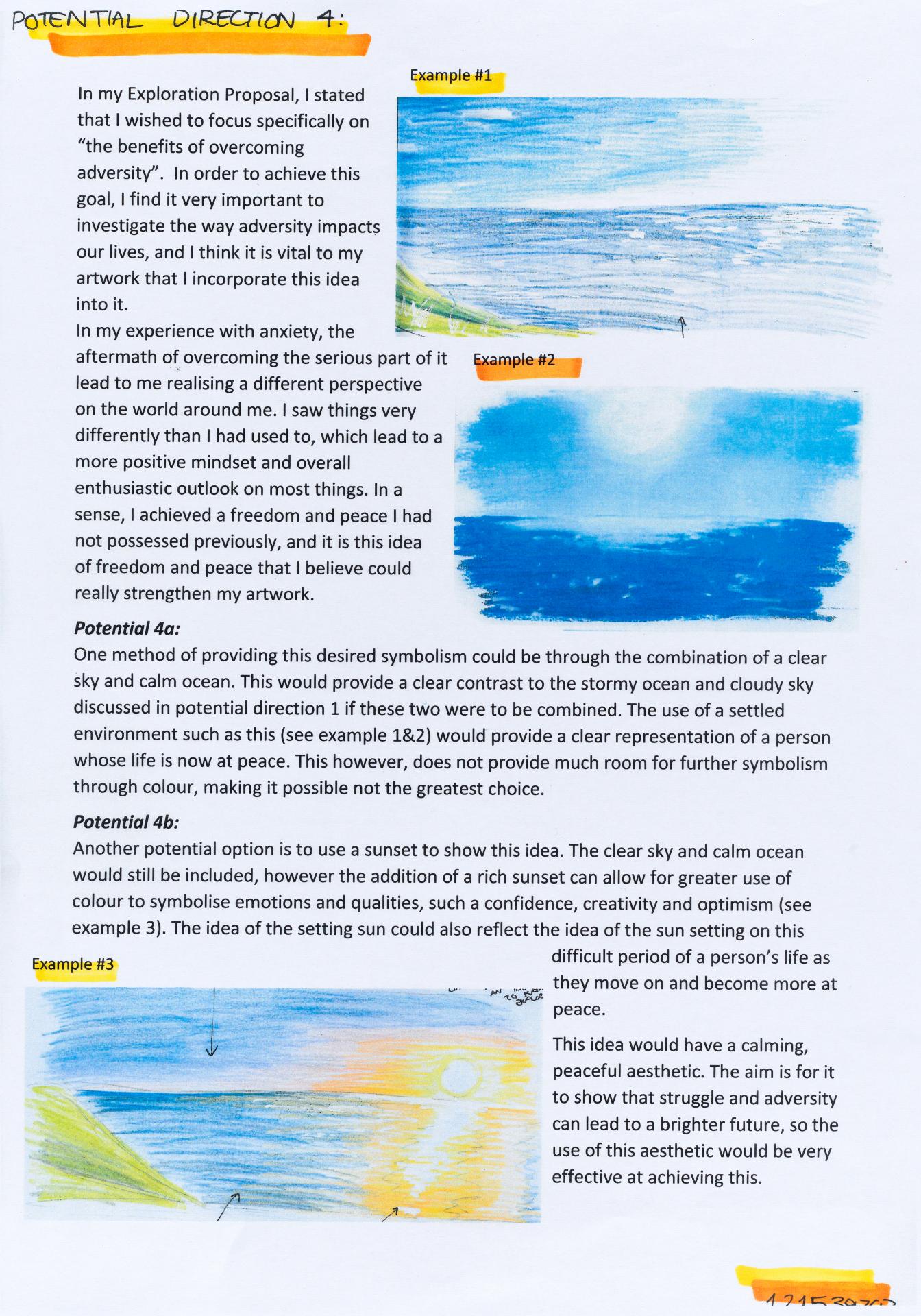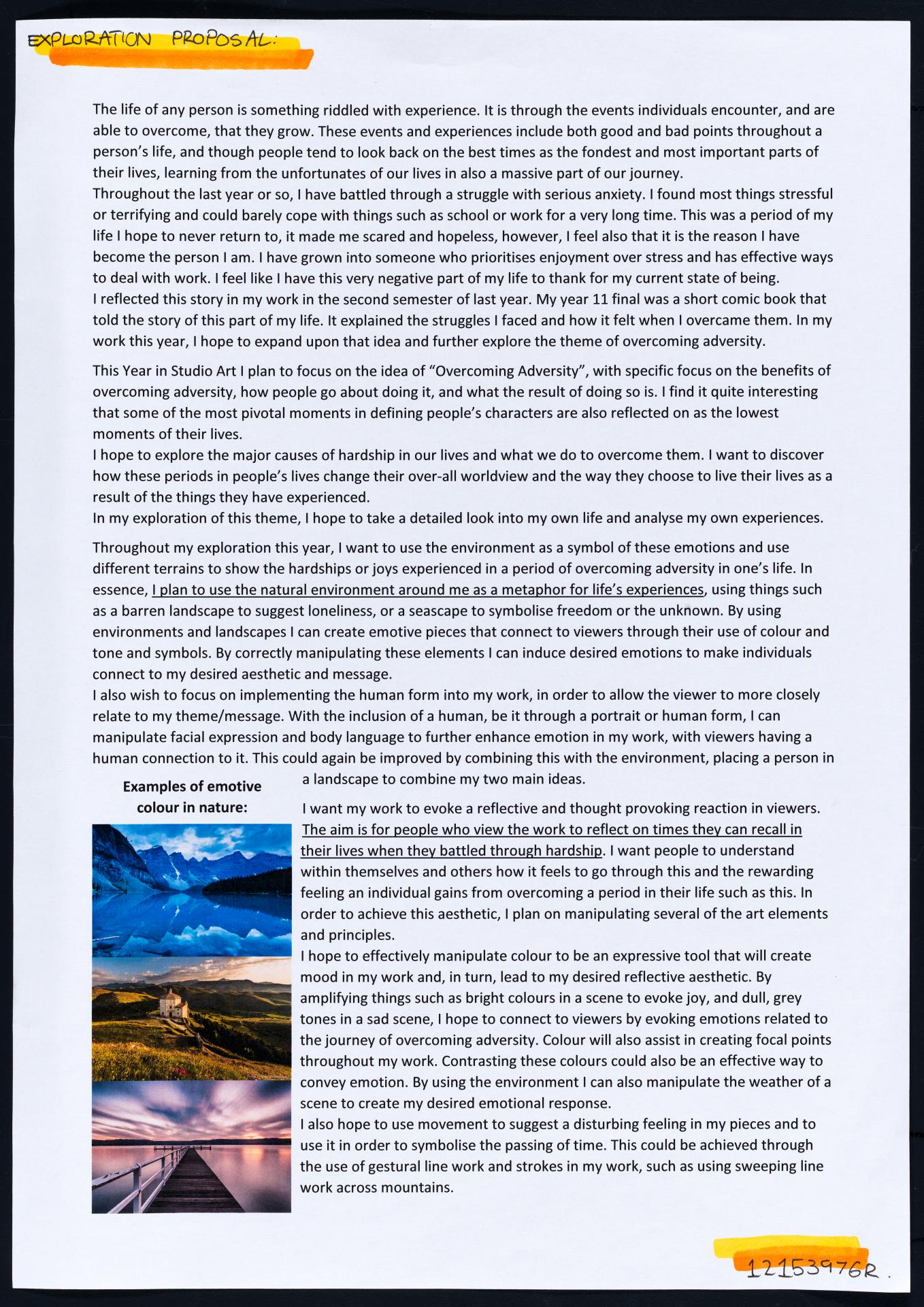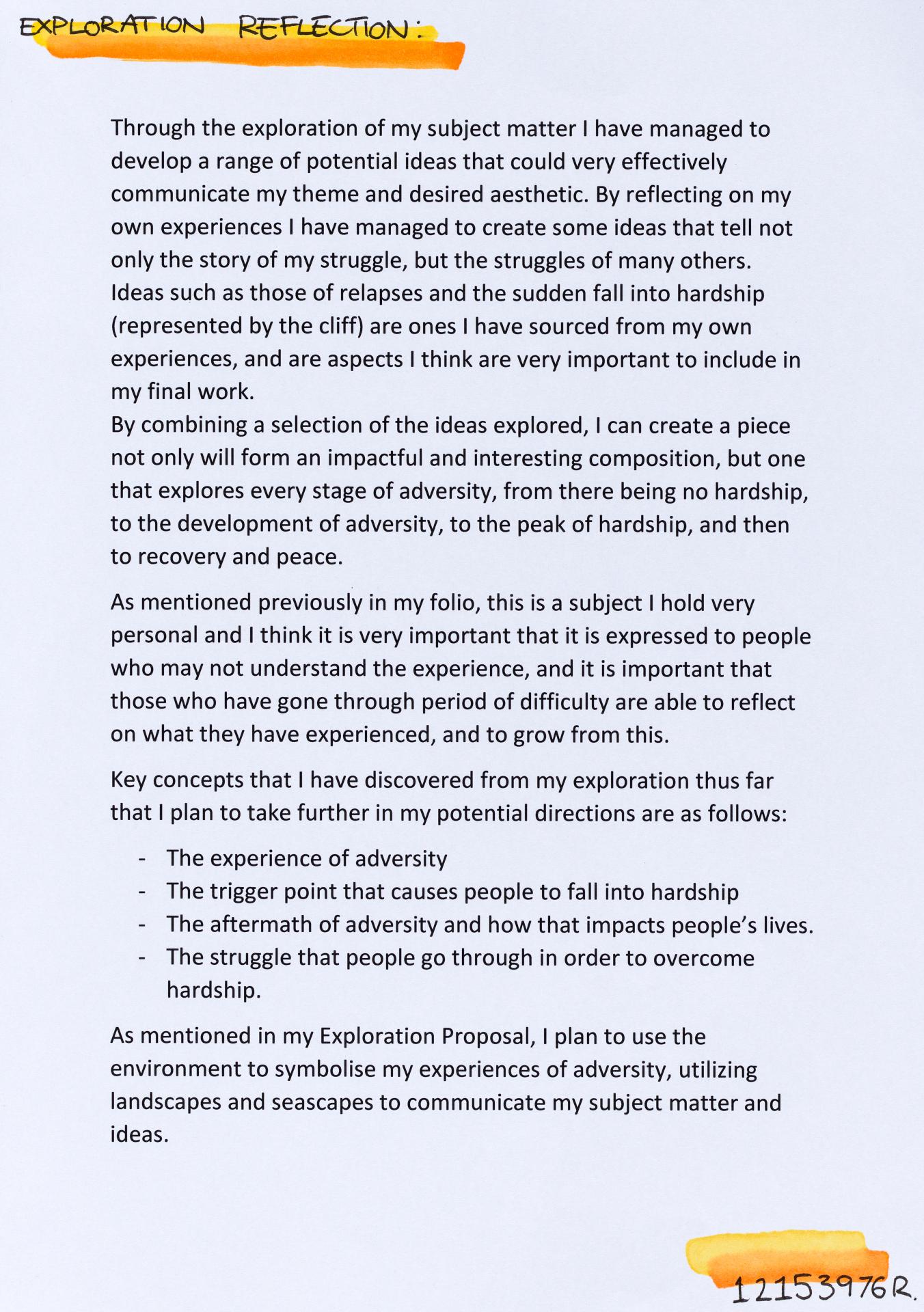 In his exploration proposal Jack has been able to provide detailed evidence of how he wants to develop his design process. He has described the focus and subject matter he will explore throughout his design process: “Overcoming Adversity” and how people do this. Jack has included personal imagery as part of his proposal to show the kind of work that he would like to make and to show how colour creates different moods and feelings within artworks. Jack describes how he wants to use the environment to explore emotions and review his own personal experiences.
