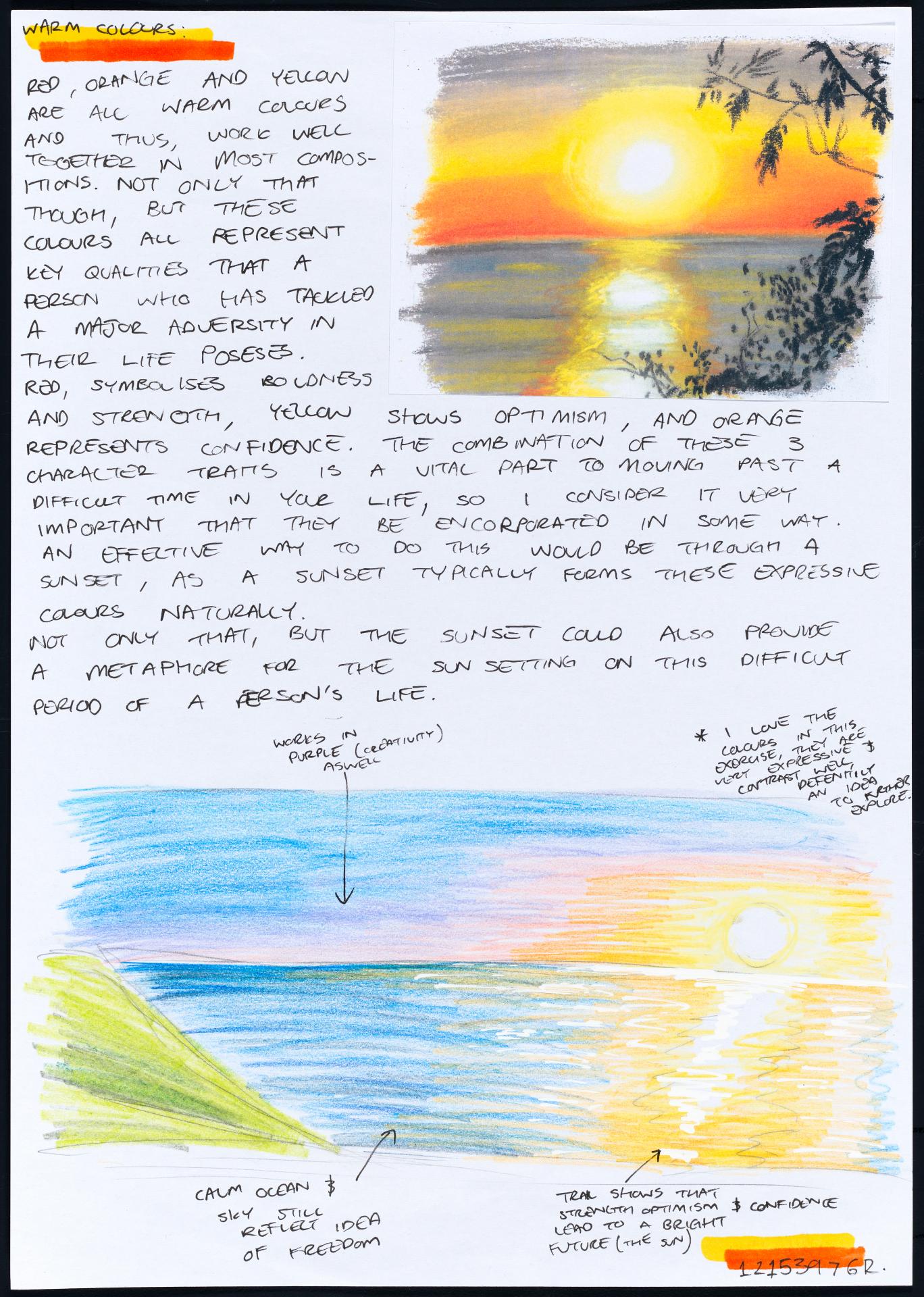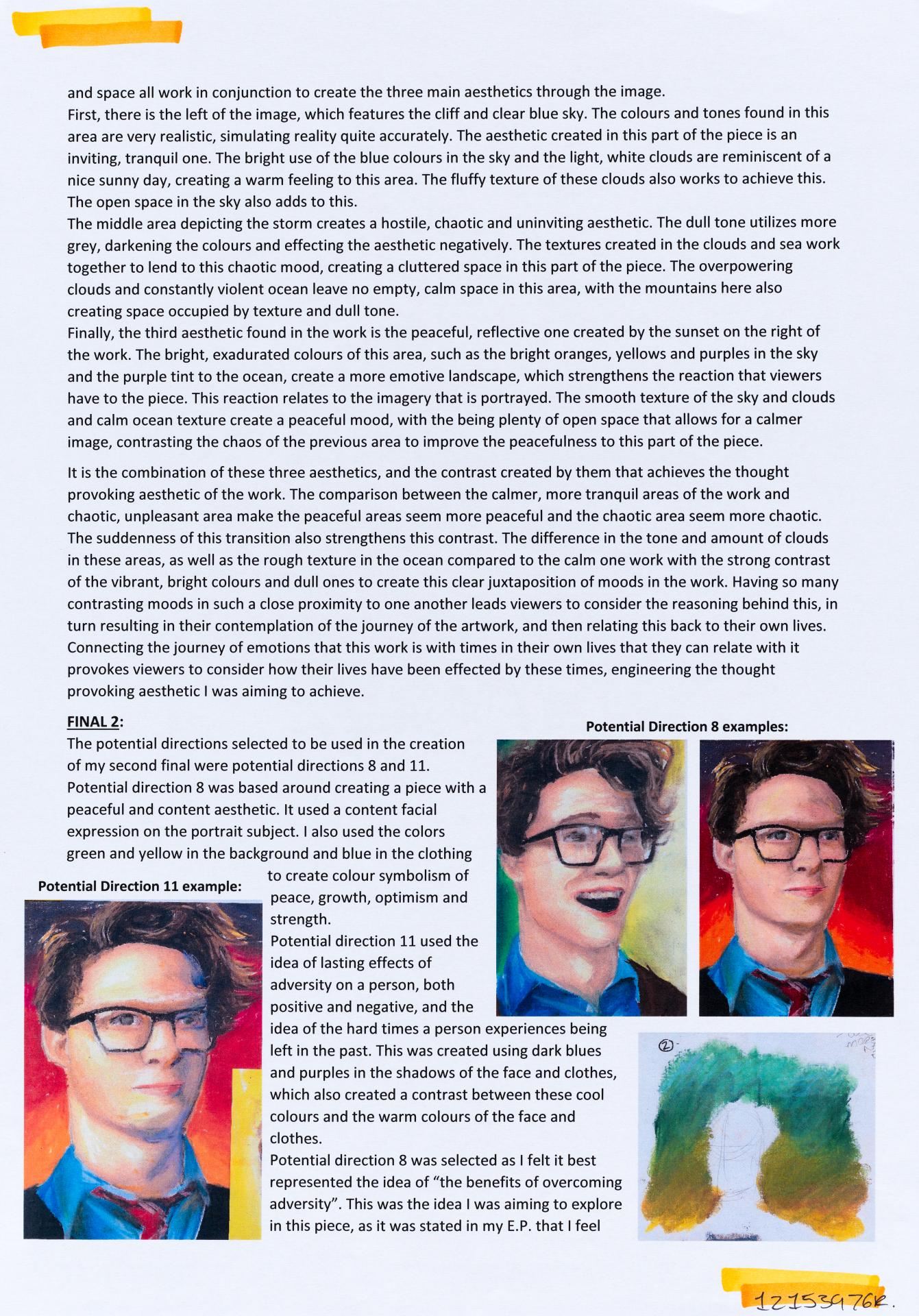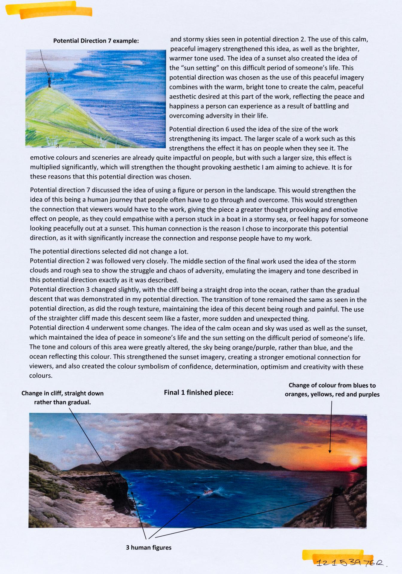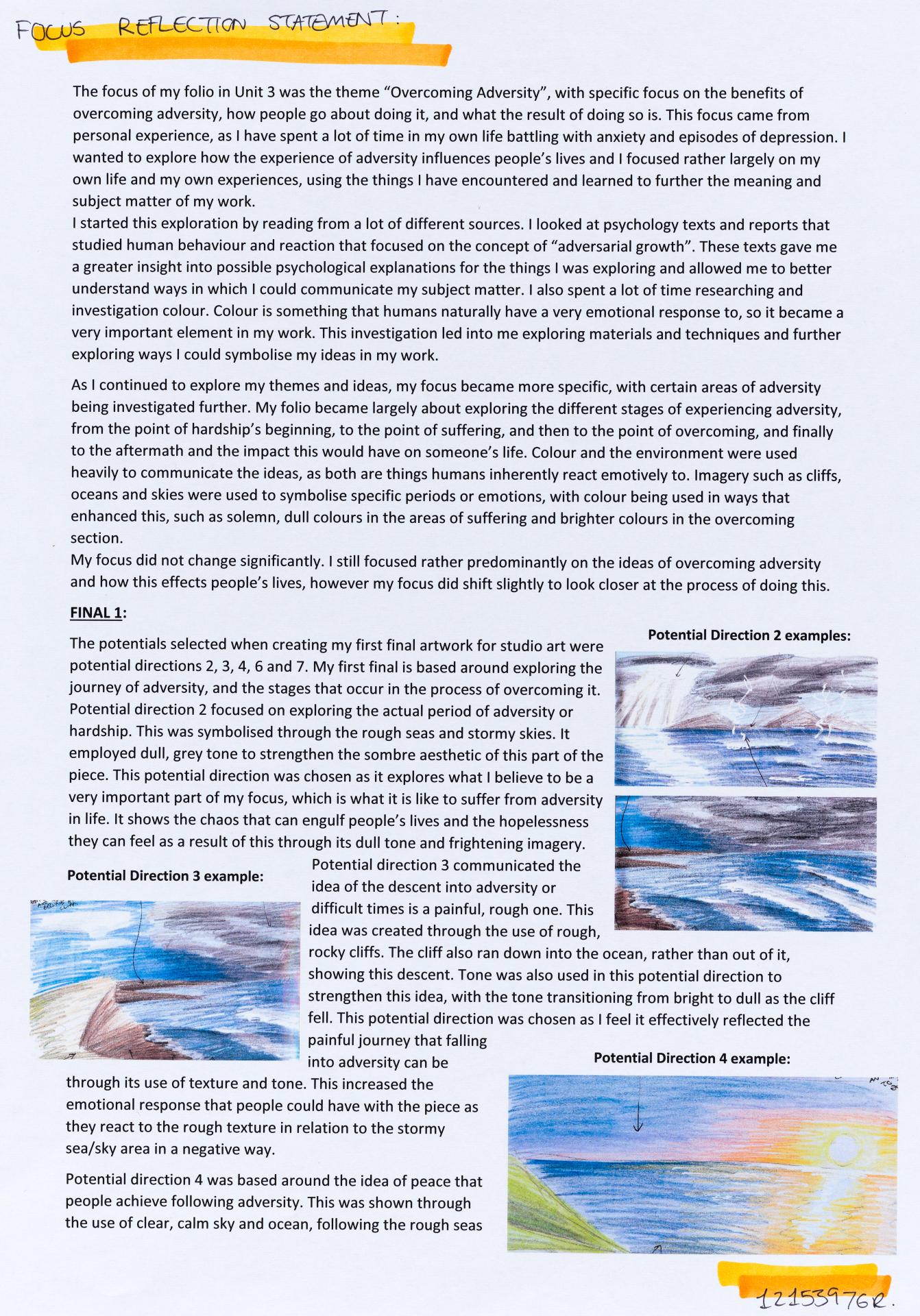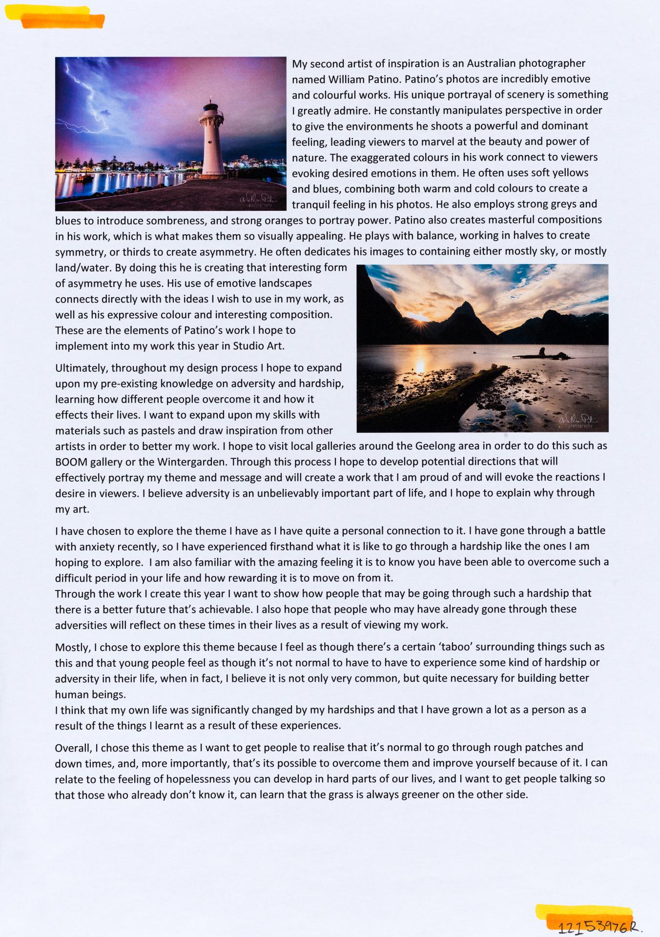 In his exploration proposal Jack has been able to provide detailed evidence of how he wants to develop his design process. He has described the focus and subject matter he will explore throughout his design process: “Overcoming Adversity” and how people do this. Jack has included personal imagery as part of his proposal to show the kind of work that he would like to make and to show how colour creates different moods and feelings within artworks. Jack describes how he wants to use the environment to explore emotions and review his own personal experiences.