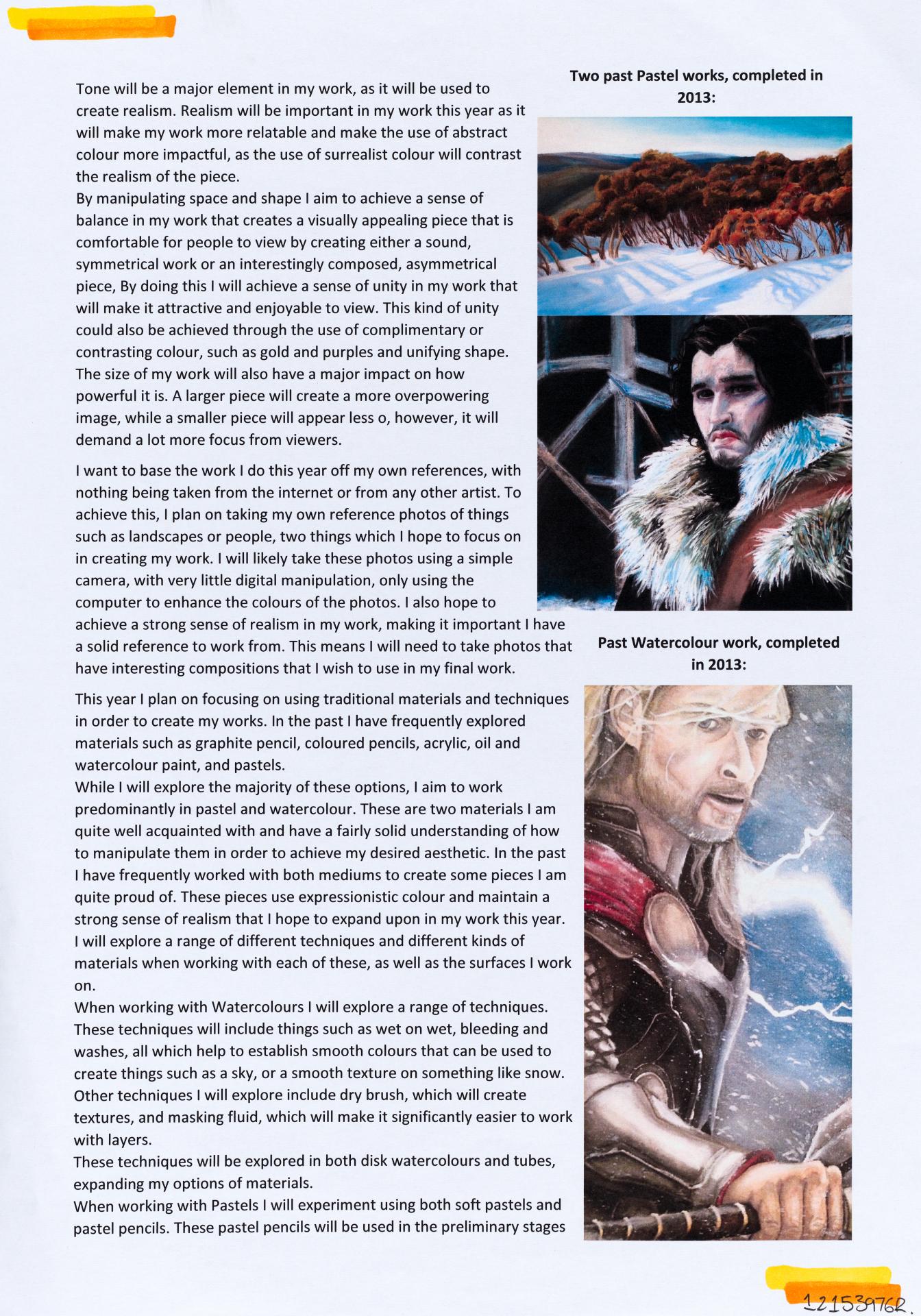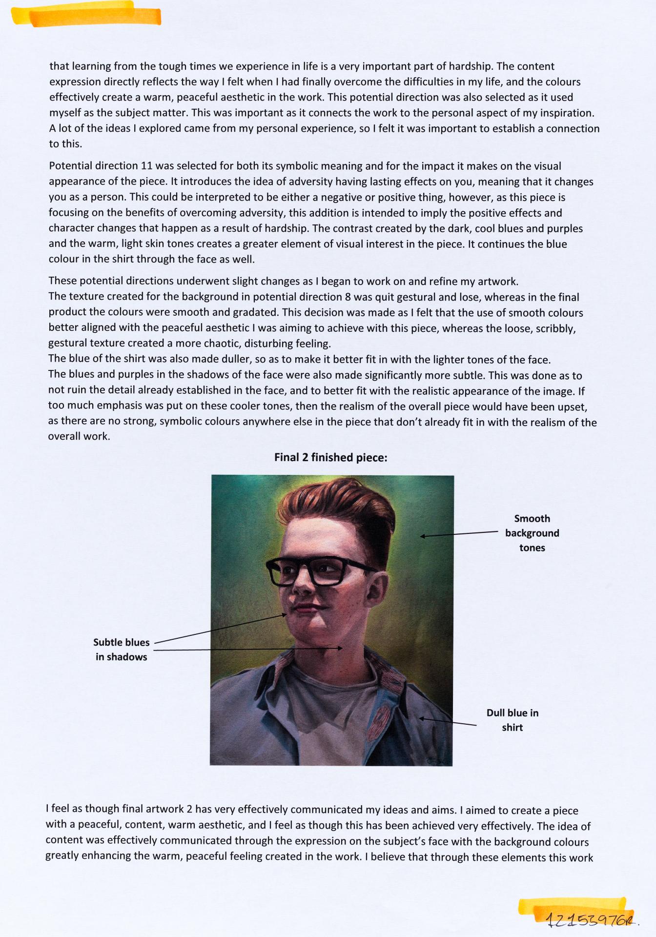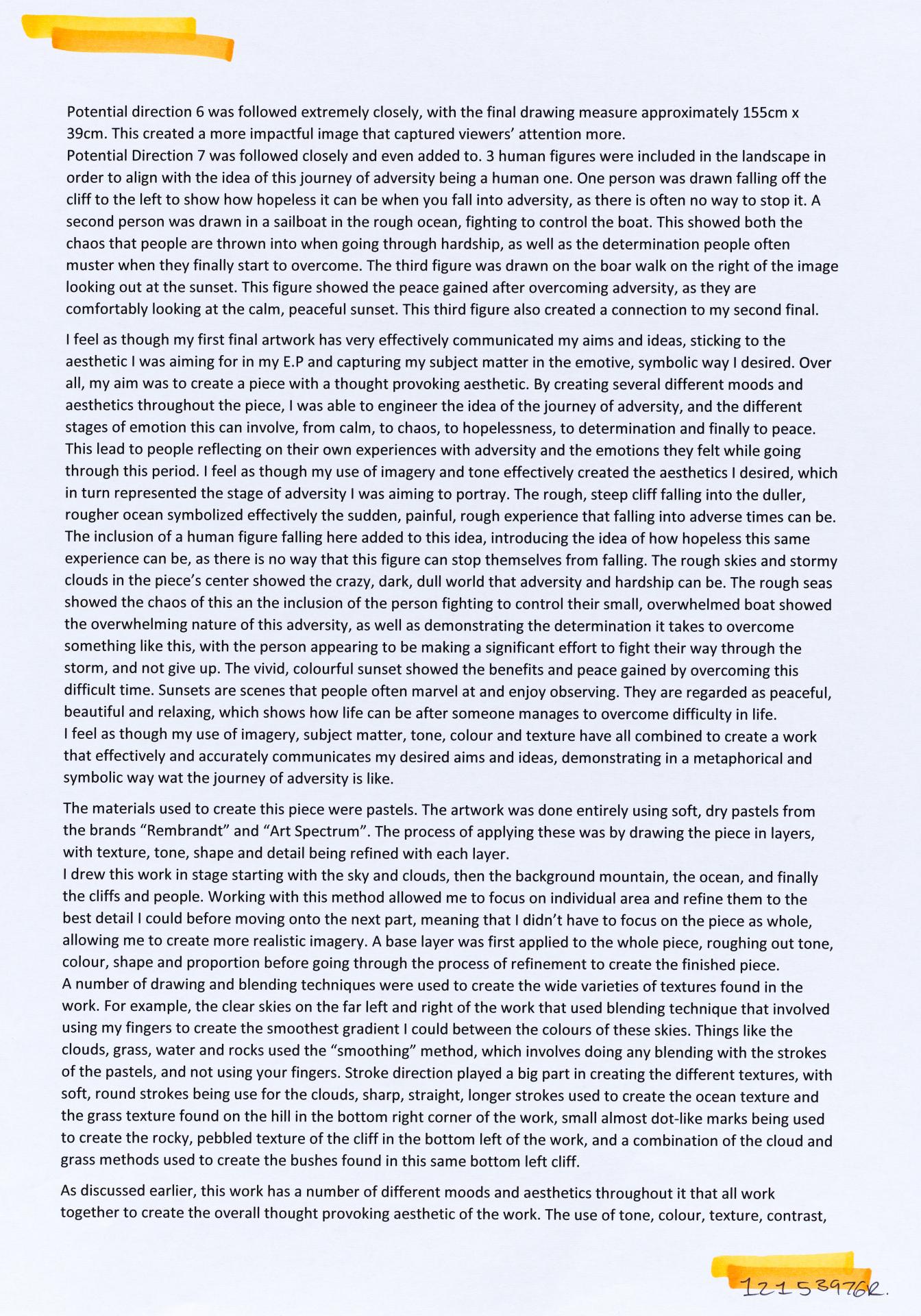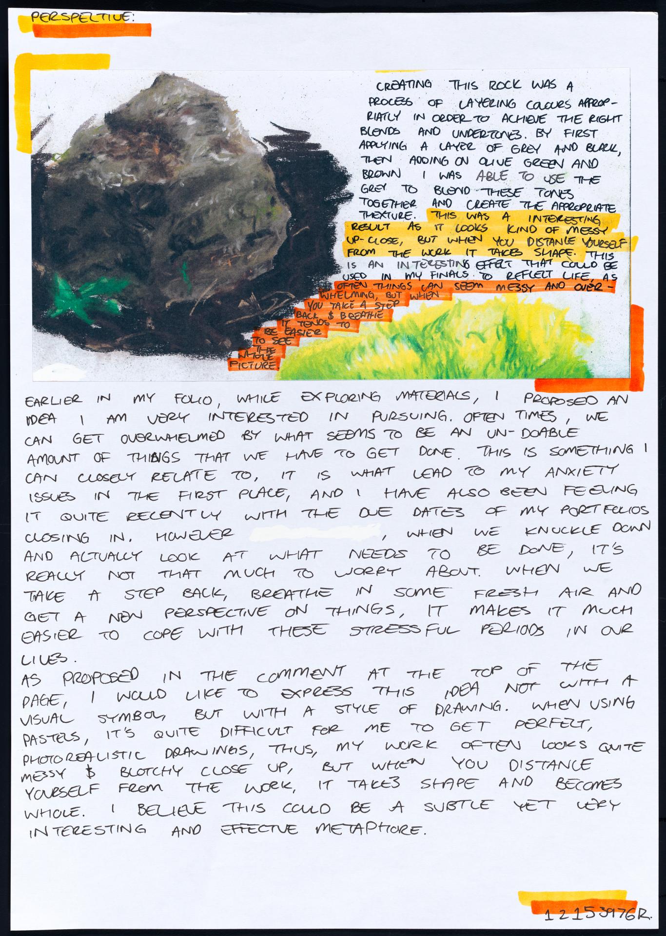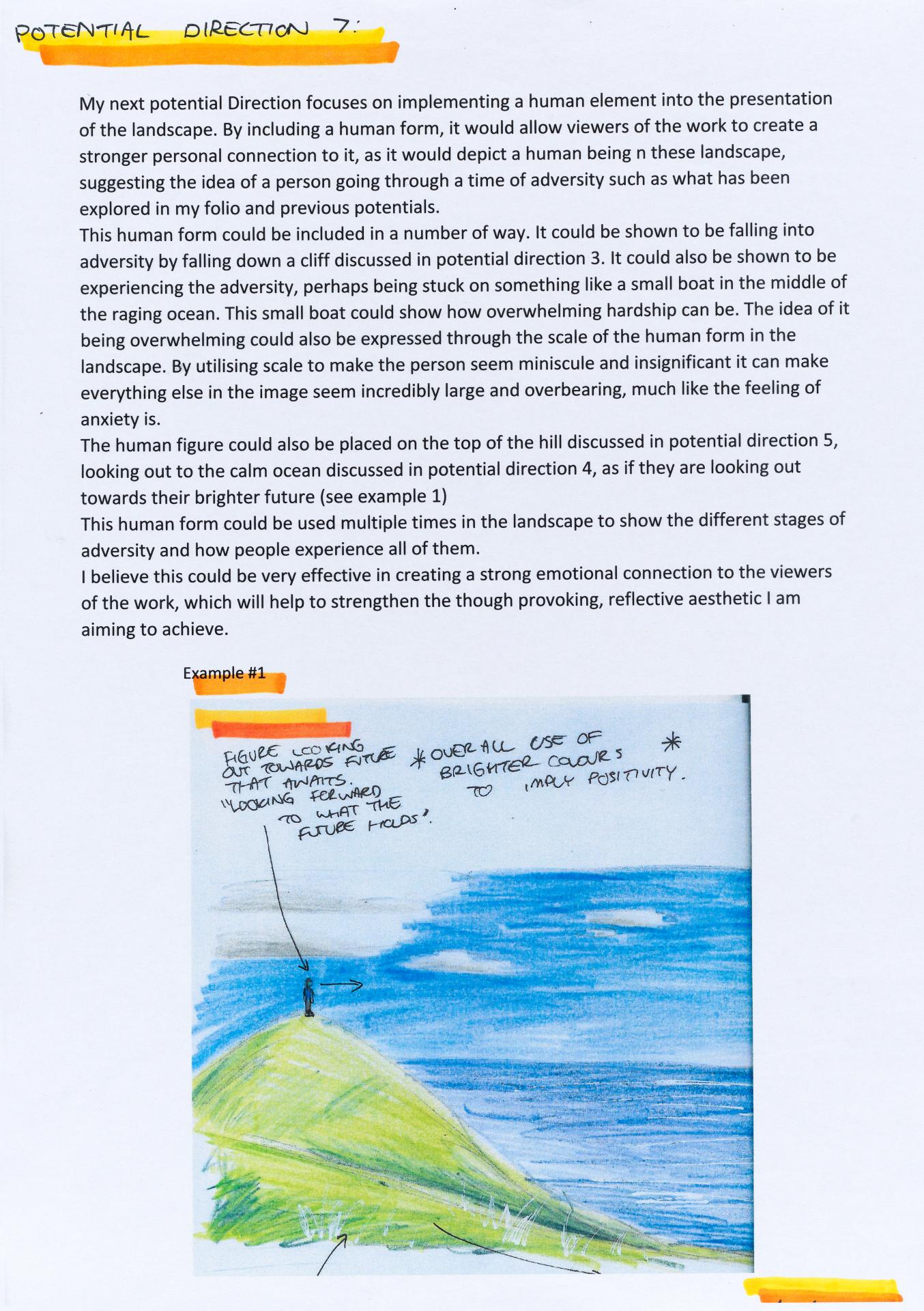 In his exploration proposal Jack has been able to provide detailed evidence of how he wants to develop his design process. He has described the focus and subject matter he will explore throughout his design process: “Overcoming Adversity” and how people do this. Jack has included personal imagery as part of his proposal to show the kind of work that he would like to make and to show how colour creates different moods and feelings within artworks. Jack describes how he wants to use the environment to explore emotions and review his own personal experiences.