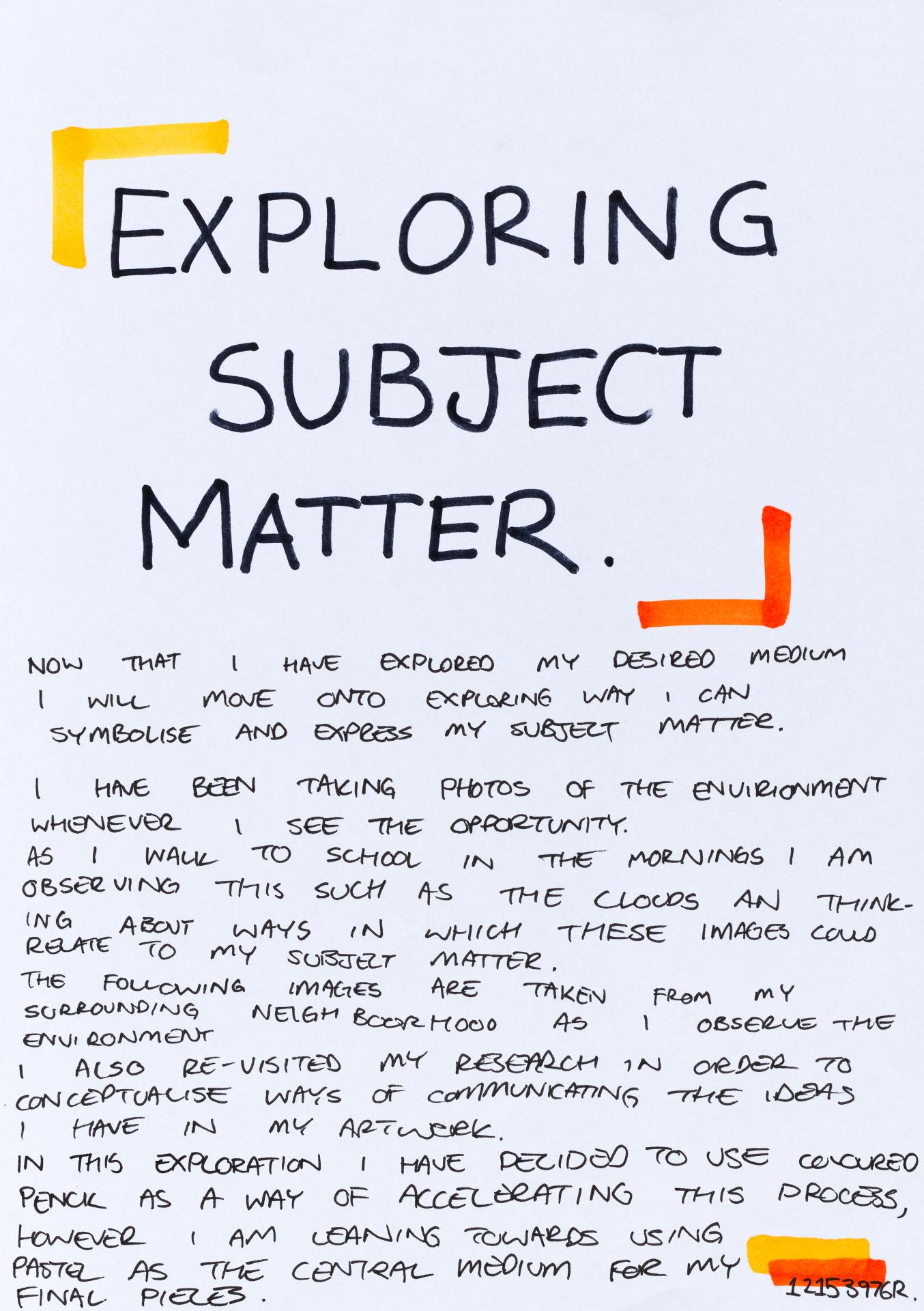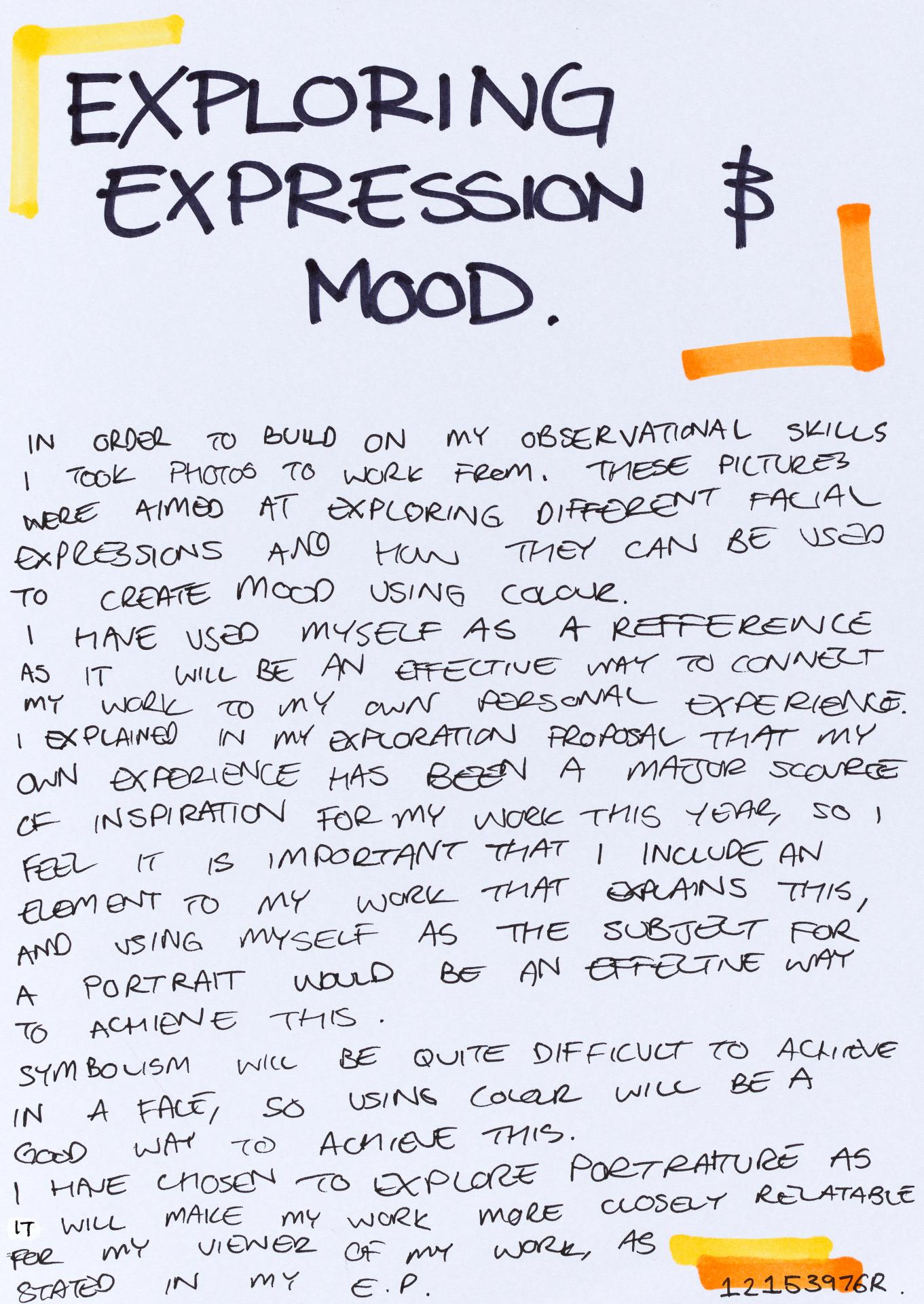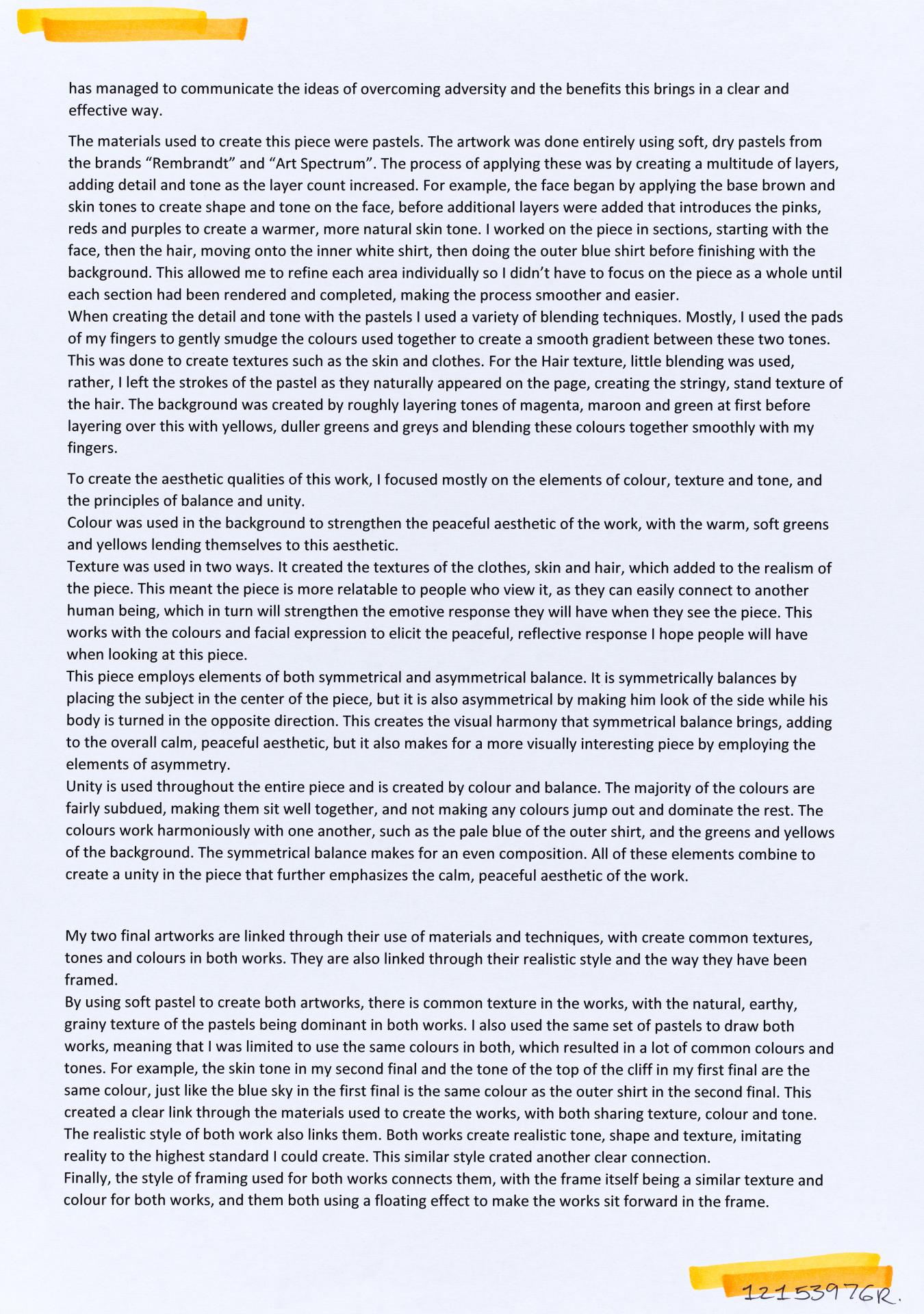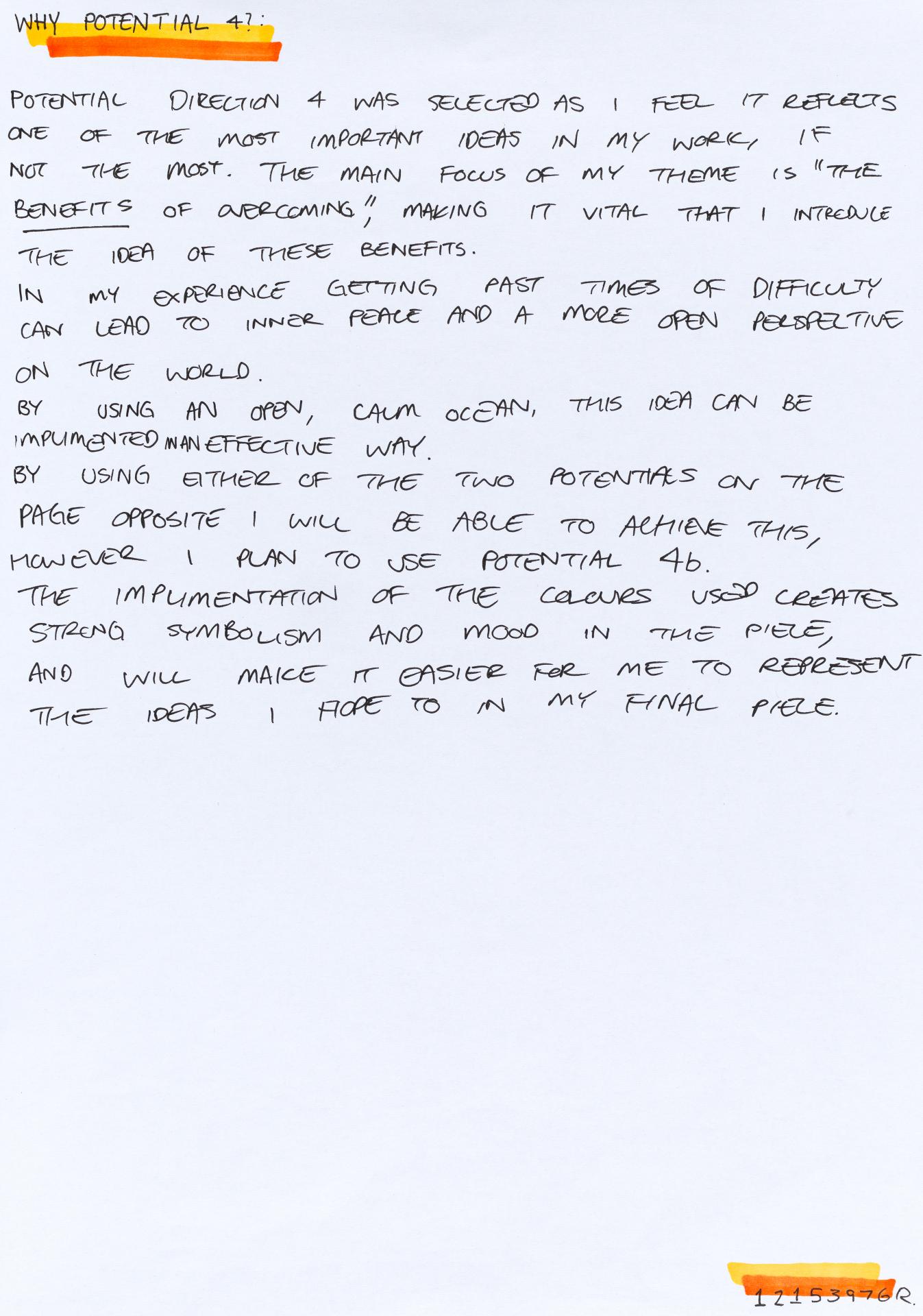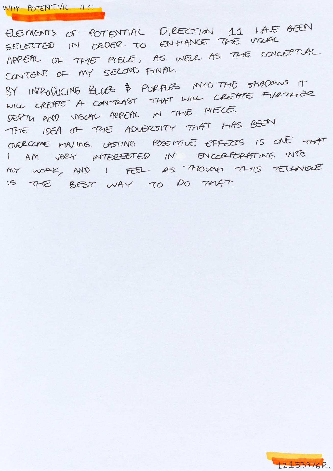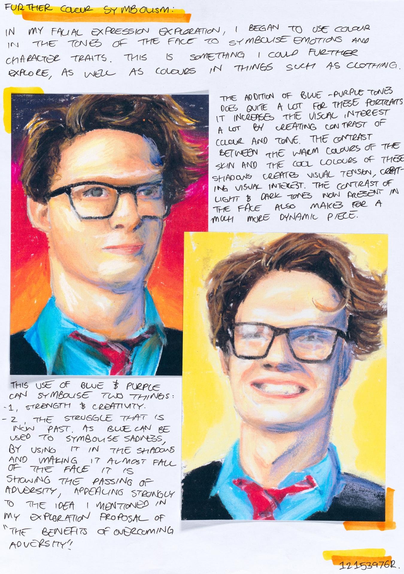 In his exploration proposal Jack has been able to provide detailed evidence of how he wants to develop his design process. He has described the focus and subject matter he will explore throughout his design process: “Overcoming Adversity” and how people do this. Jack has included personal imagery as part of his proposal to show the kind of work that he would like to make and to show how colour creates different moods and feelings within artworks. Jack describes how he wants to use the environment to explore emotions and review his own personal experiences.