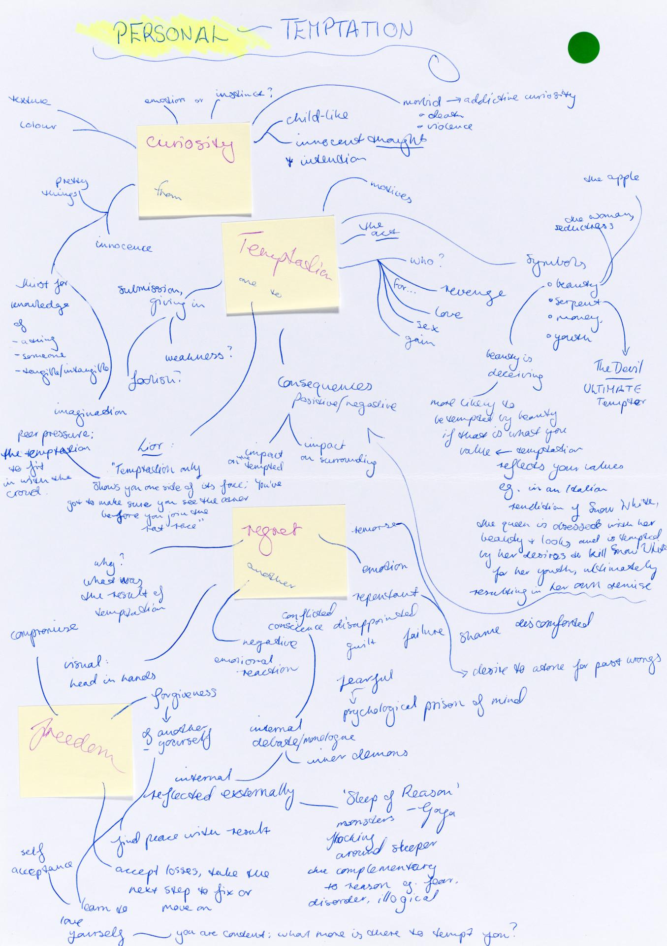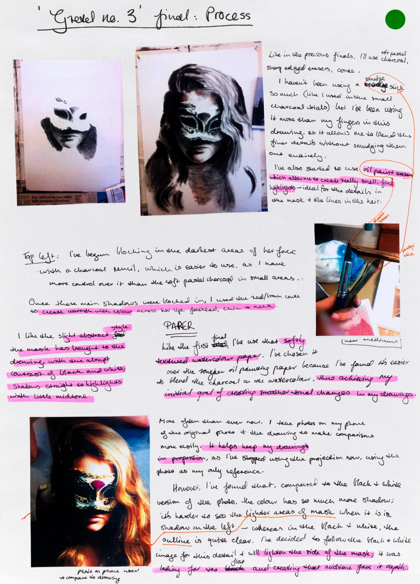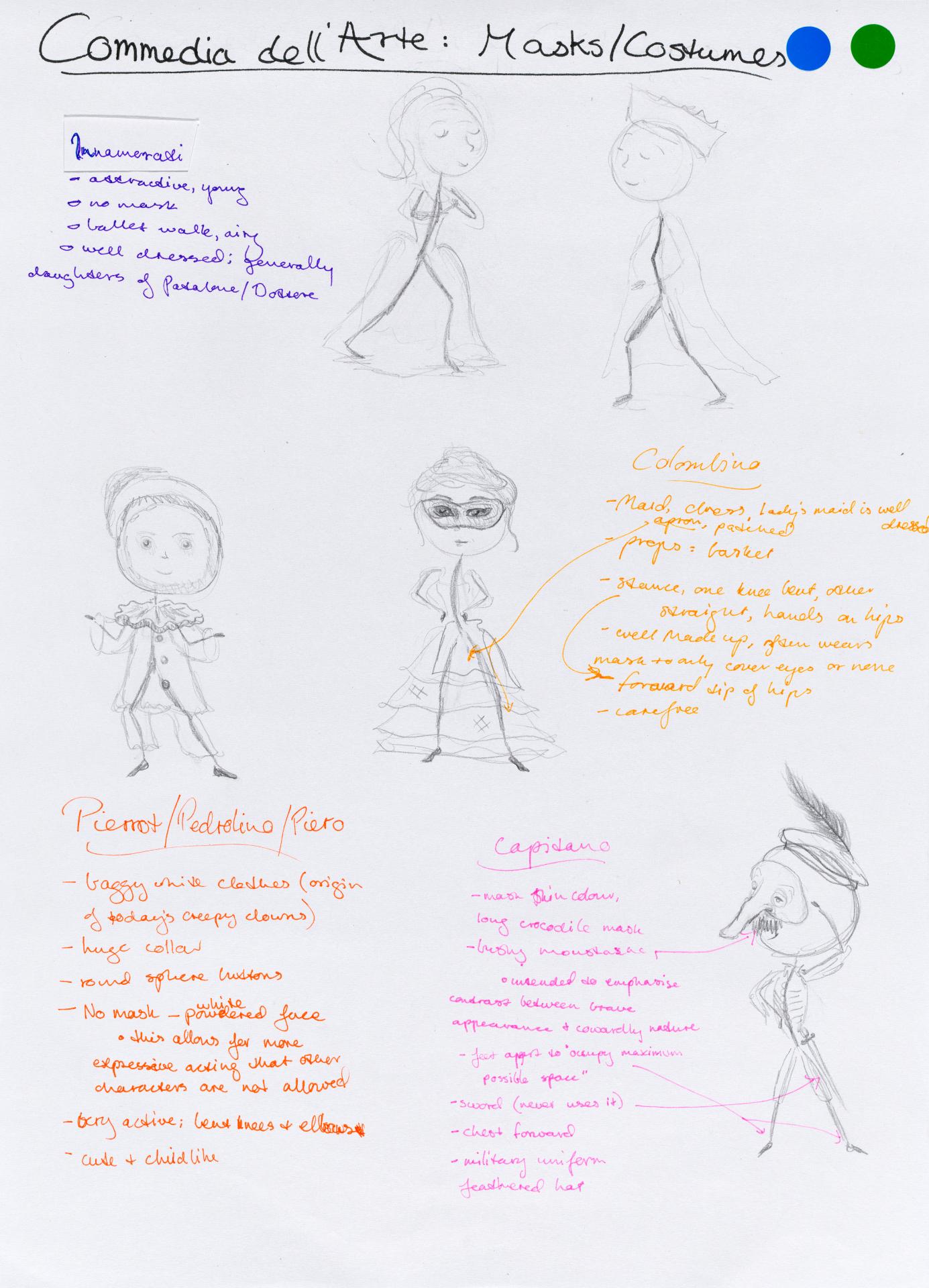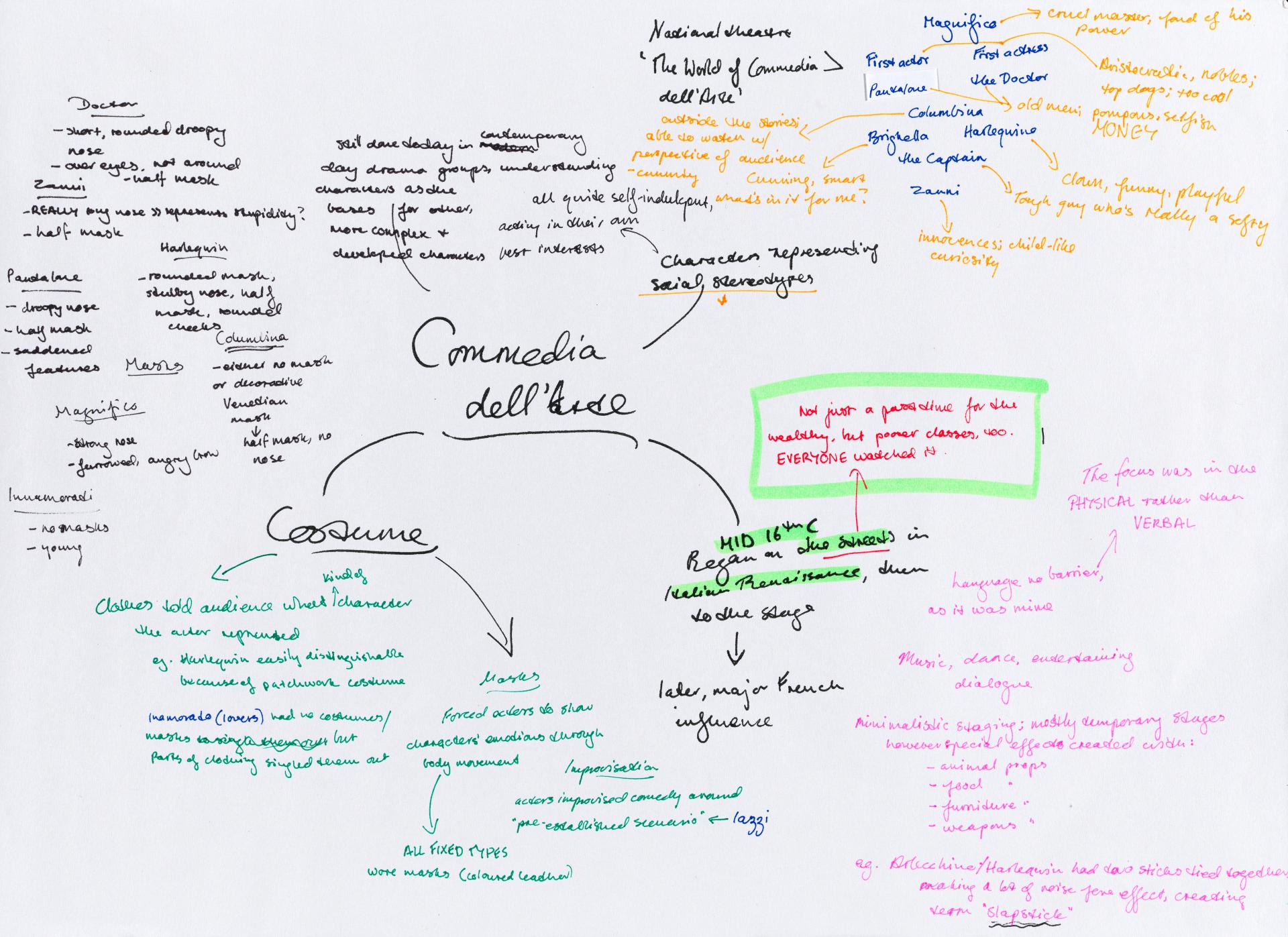 Louisa chose to start her personal exploration through a collection of ideas and mind maps. Her initial concepts and investigation are being refined and a focus on Commedia dell’arte (a form of theatre involving masks) commences. Her notes reflect possible ideas of exploration creating connections between concepts and practical artmaking.