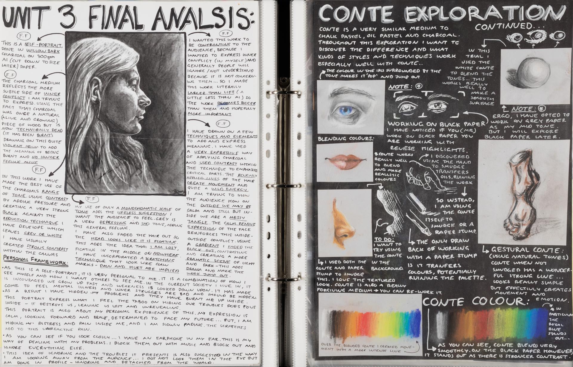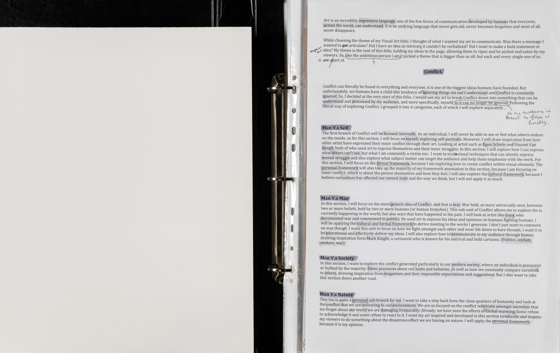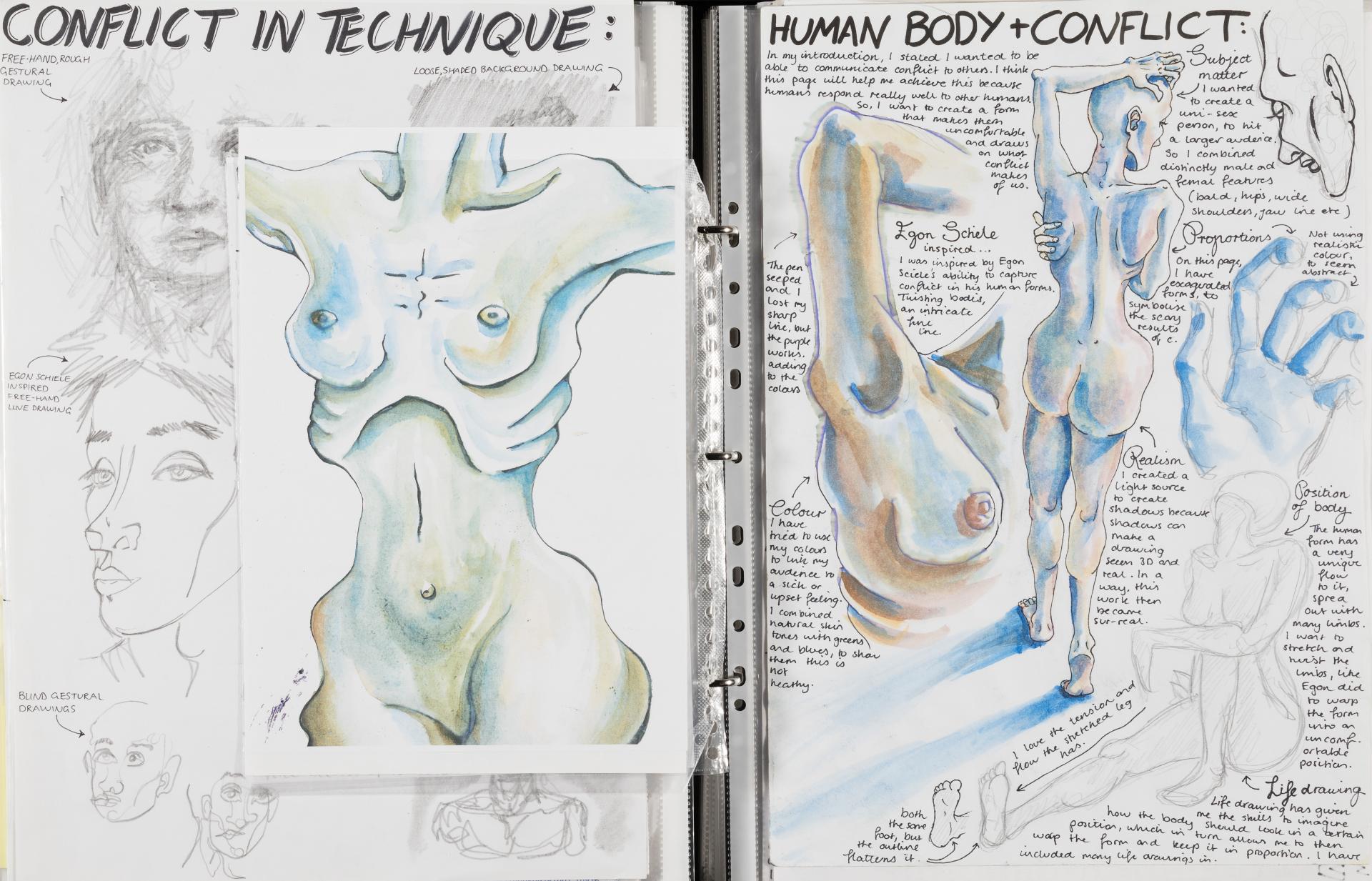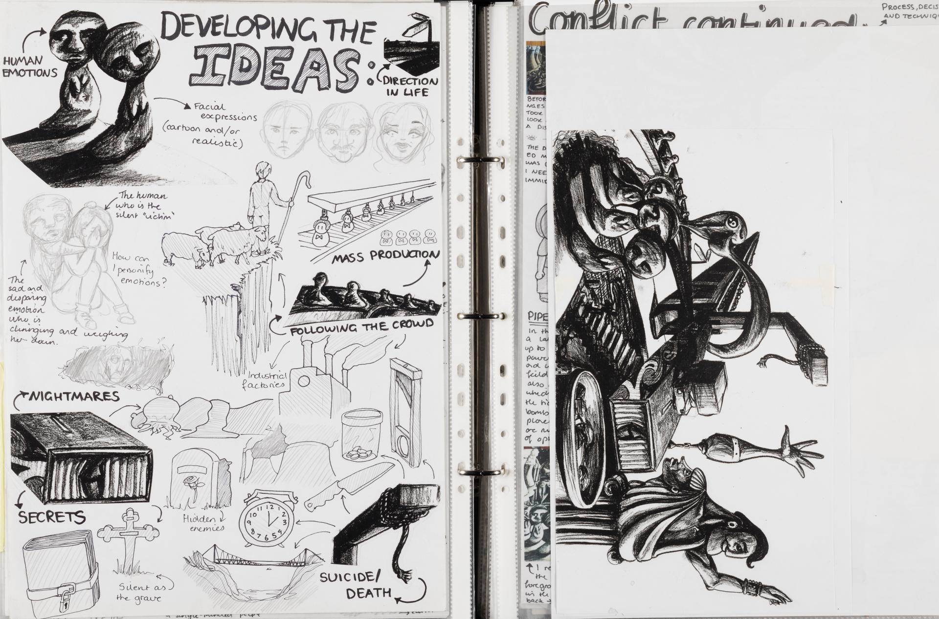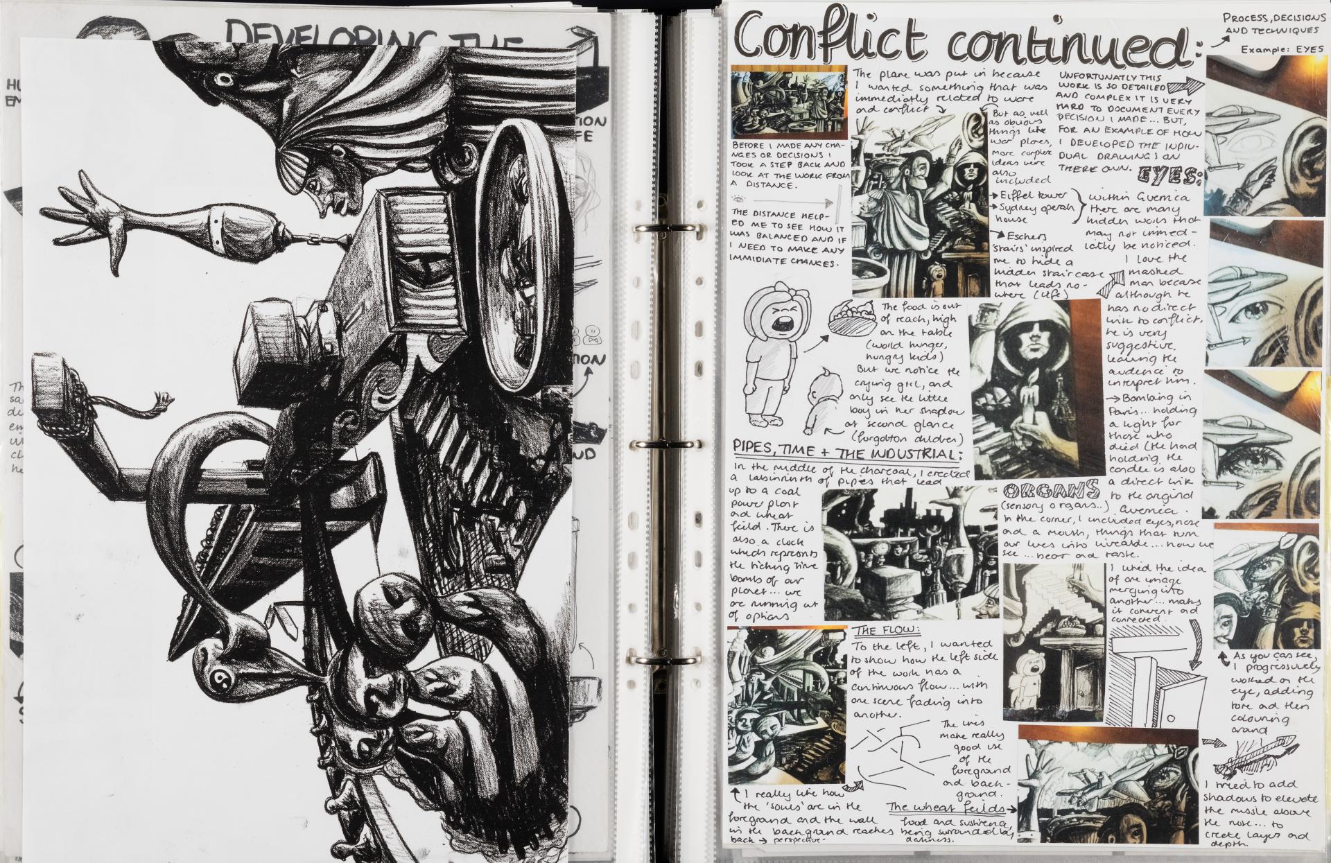Bethany began her art process with an overriding interest in conflict. She explored the notion of conflict from various perspectives using extensive mind maps and research. Here we see the beginning of Bethany’s focused exploration of personal ideas that continues throughout her body of work. The scope of her investigation is comprehensive and provides clear evidence of the exploration of concepts, skills and directions.