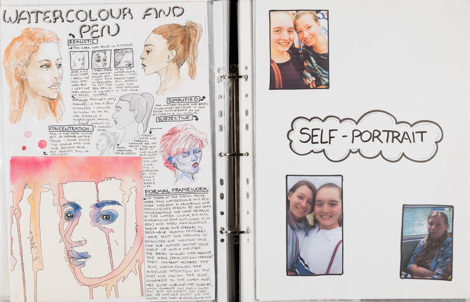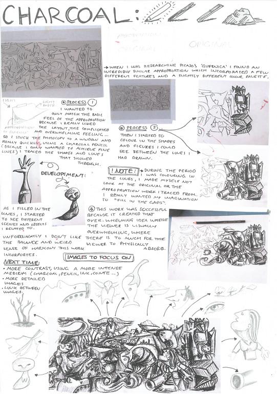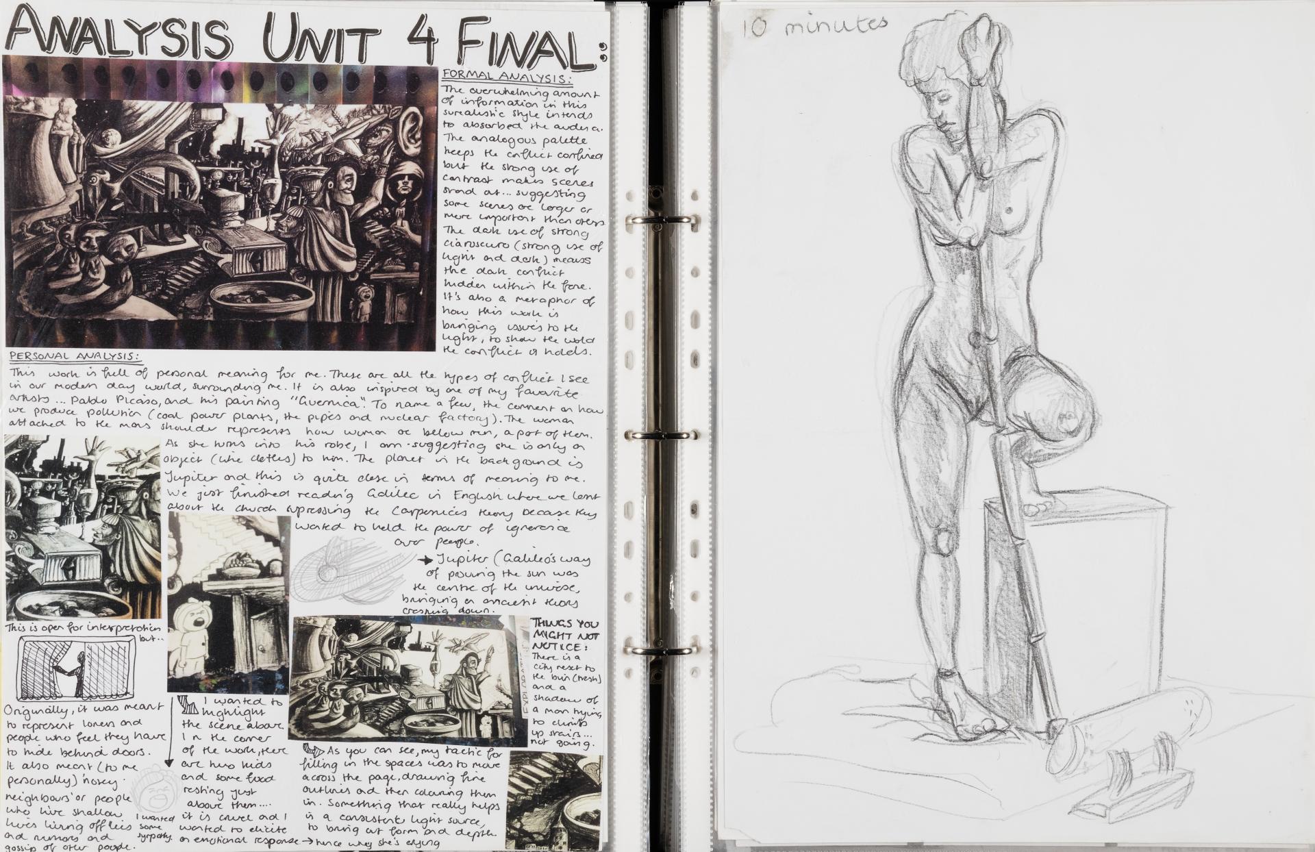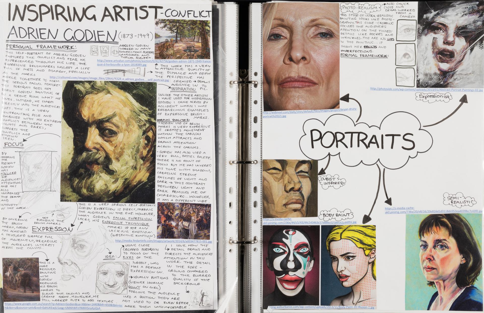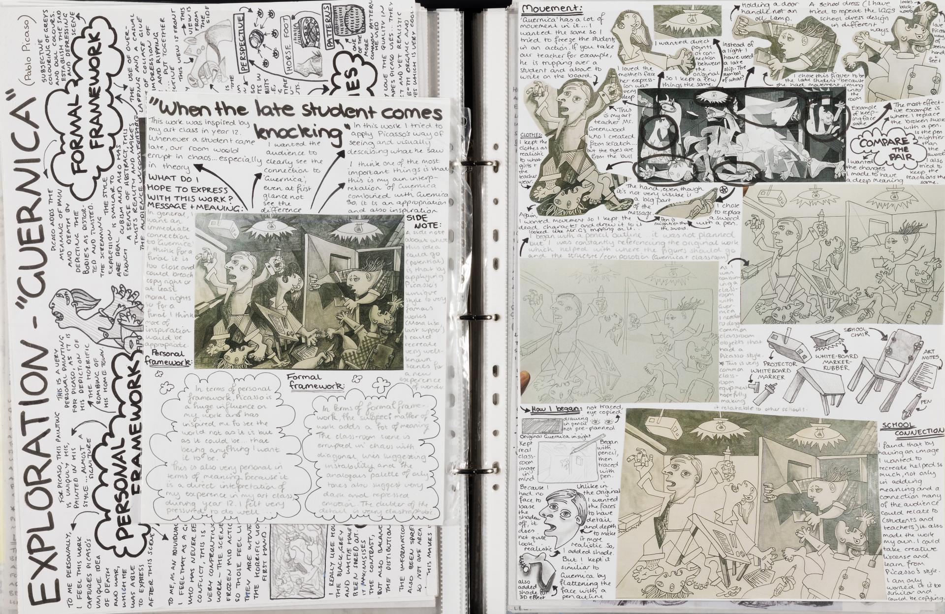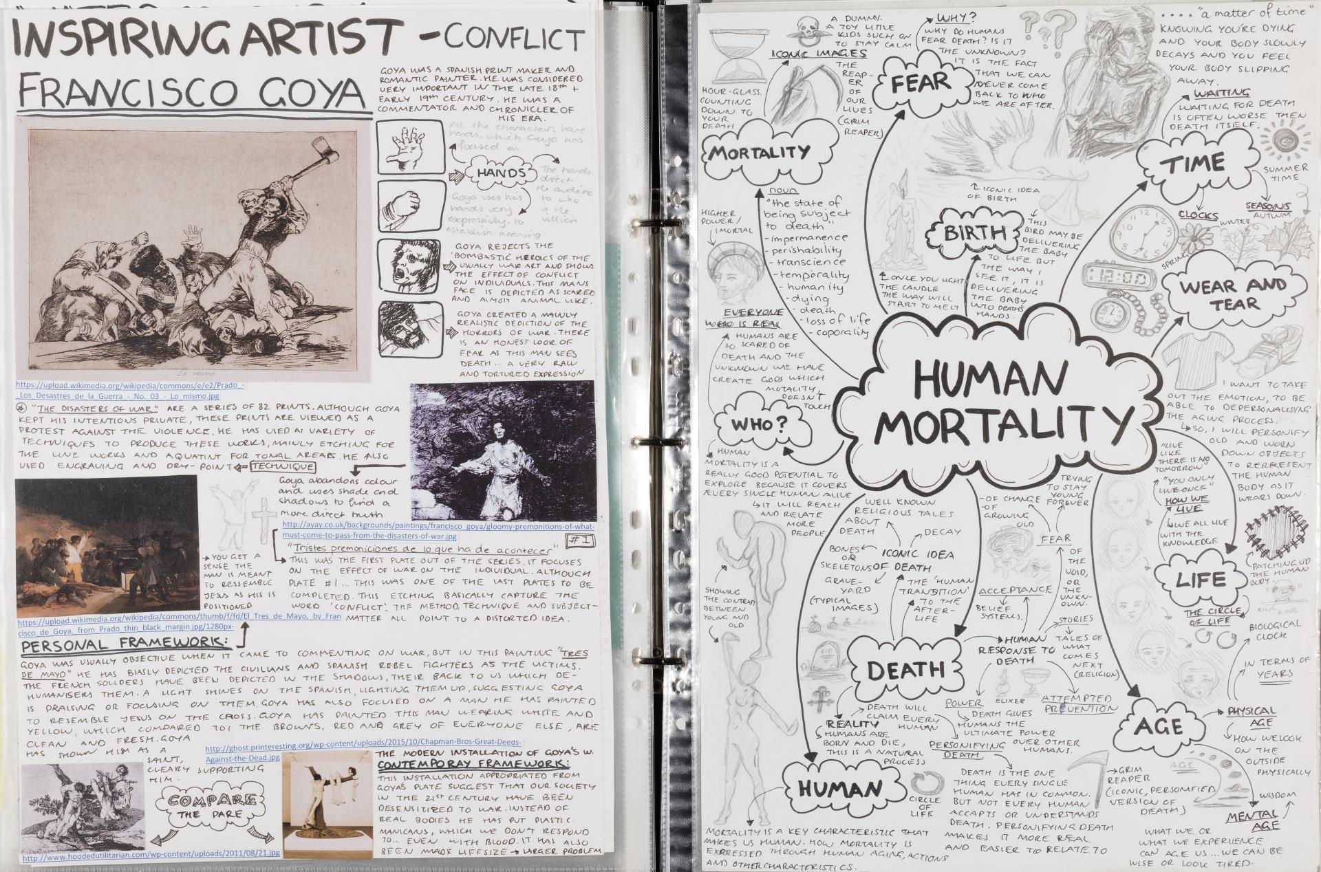 Bethany began her art process with an overriding interest in conflict. She explored the notion of conflict from various perspectives using extensive mind maps and research. Here we see the beginning of Bethany’s focused exploration of personal ideas that continues throughout her body of work. The scope of her investigation is comprehensive and provides clear evidence of the exploration of concepts, skills and directions.