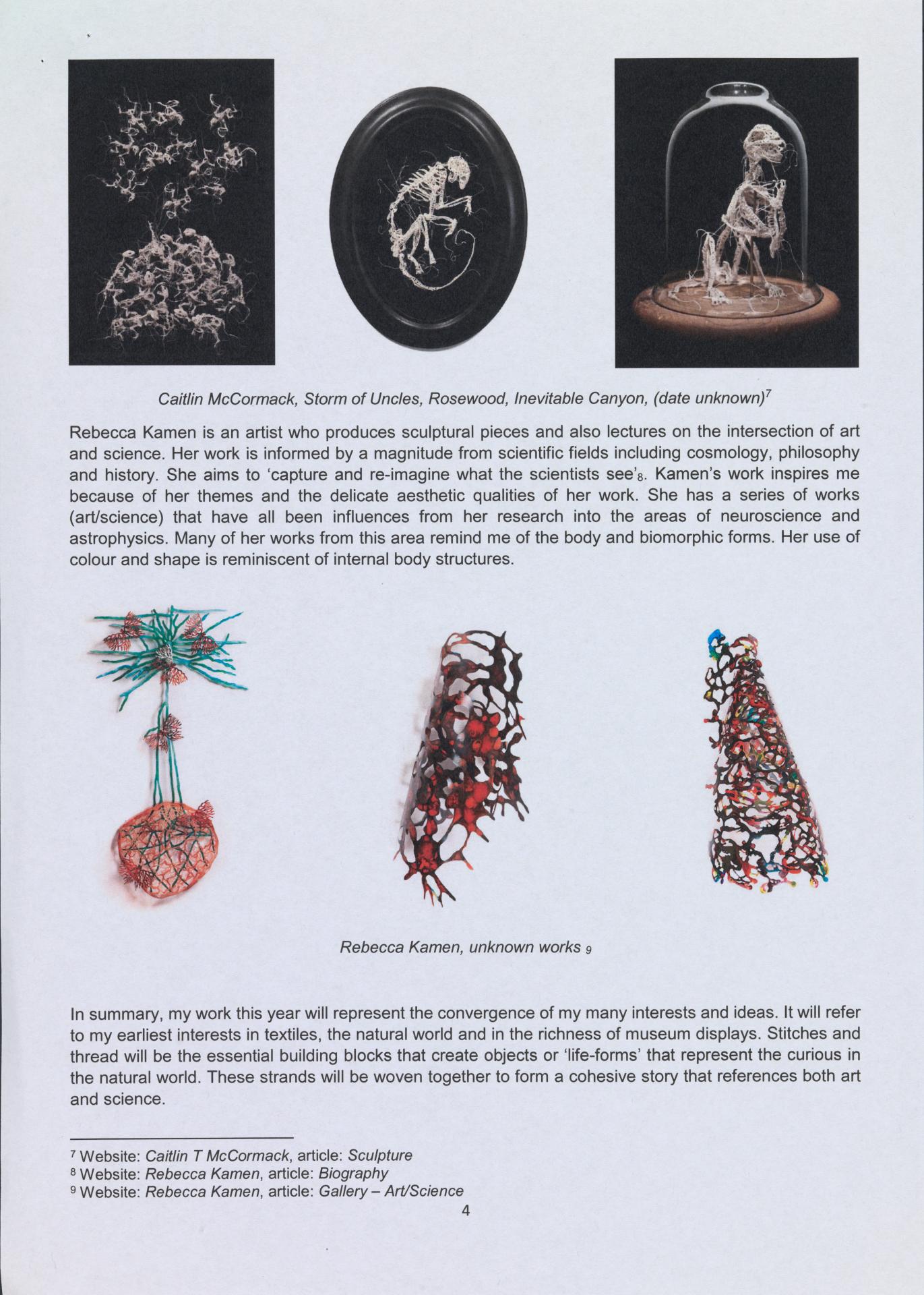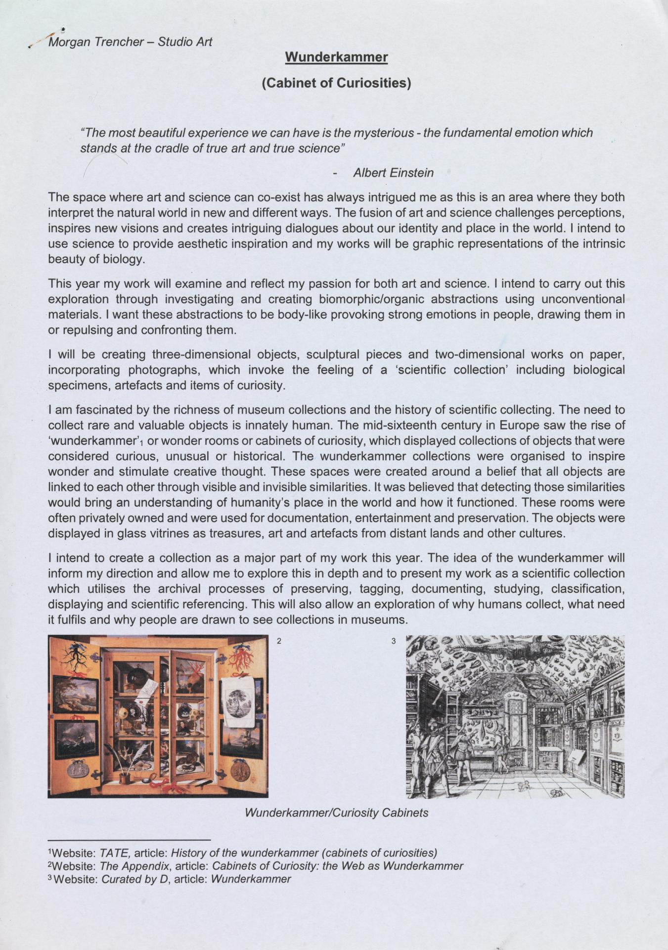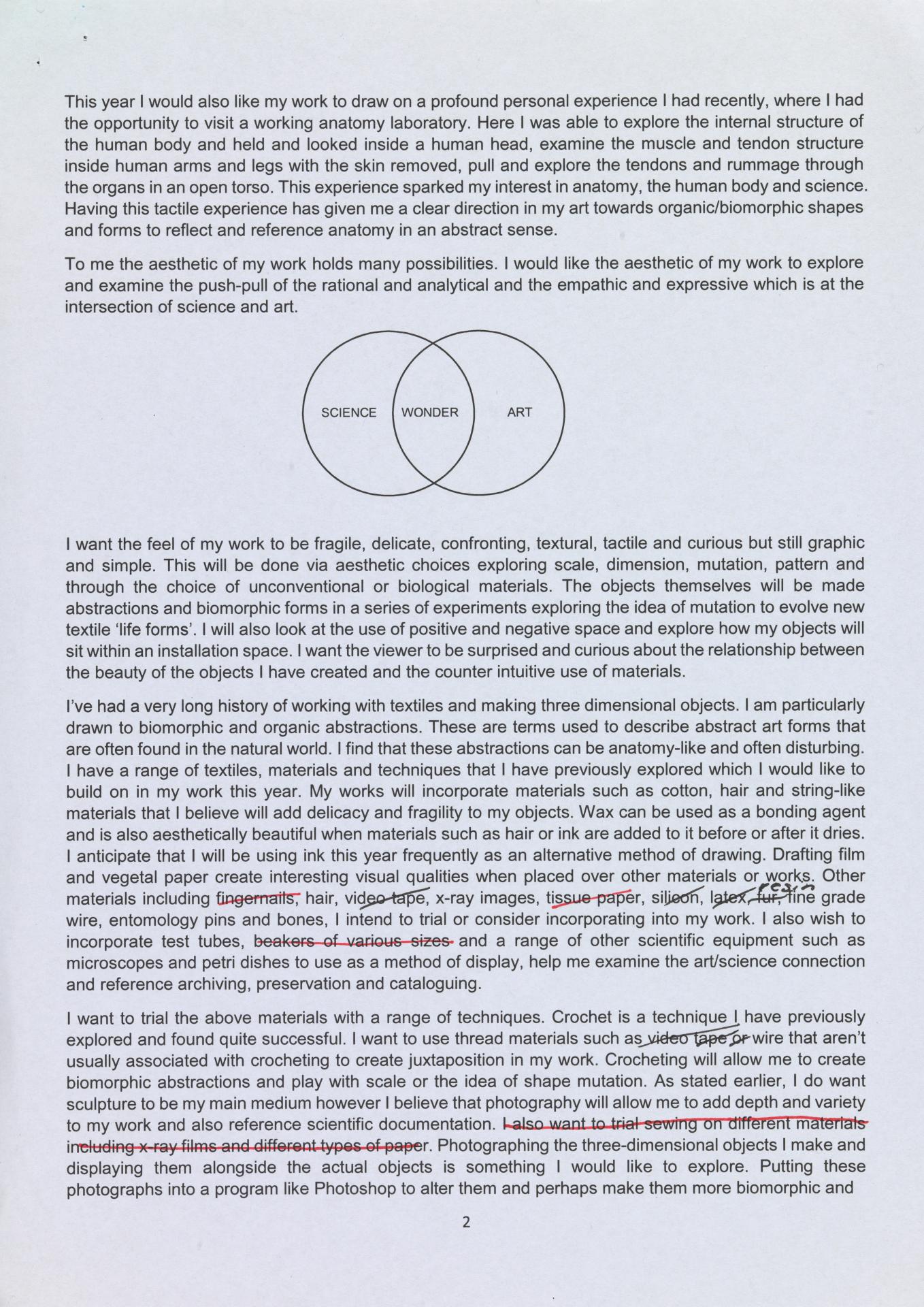 Morgan has completed a comprehensive, highly detailed exploration proposal (See current study design for current suggested word limit). Morgan has provided detailed evidence of how she will develop her studio process. She has described the focus and subject matter she will explore throughout this process: investigating and creating biomorphic/organic abstractions using unconventional materials and linking her interest in art and science.