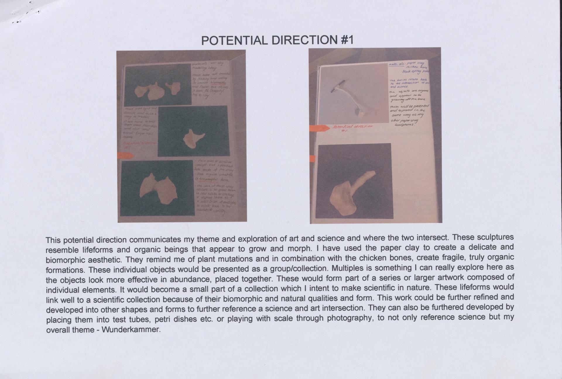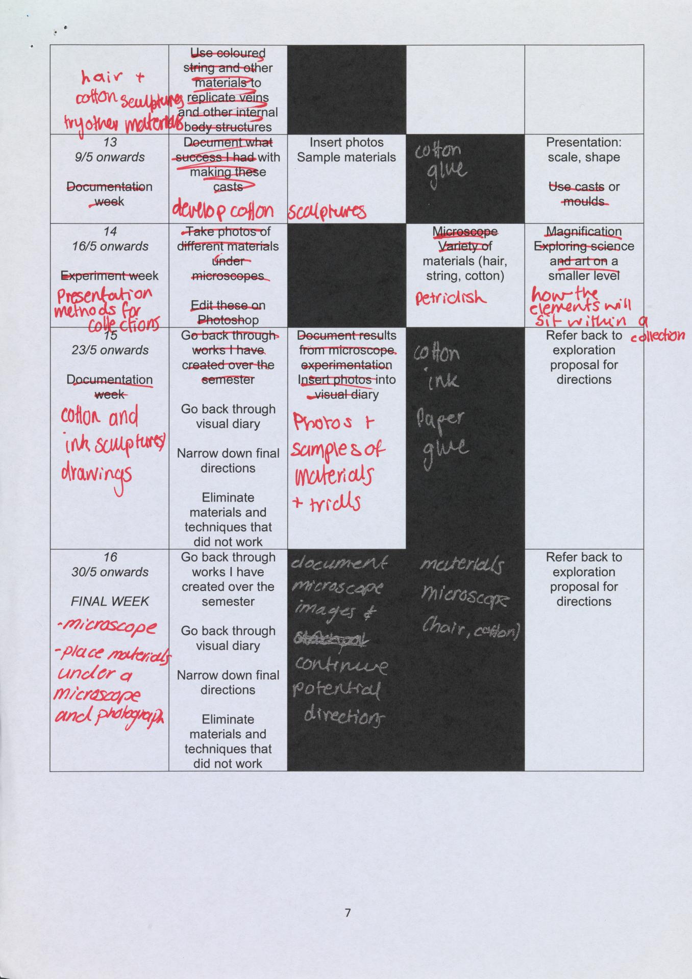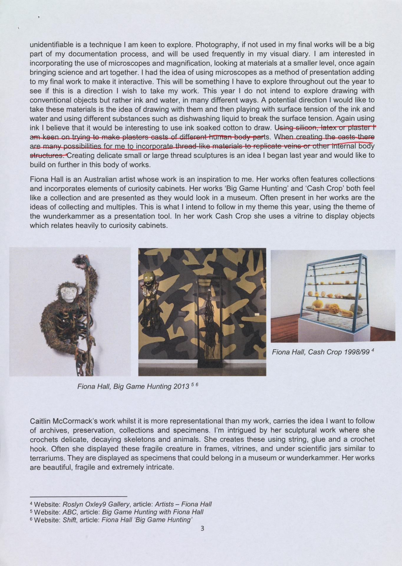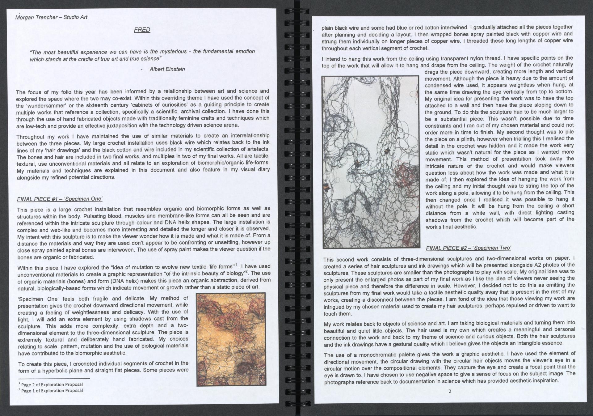 Morgan has completed a comprehensive, highly detailed exploration proposal (See current study design for current suggested word limit). Morgan has provided detailed evidence of how she will develop her studio process. She has described the focus and subject matter she will explore throughout this process: investigating and creating biomorphic/organic abstractions using unconventional materials and linking her interest in art and science.