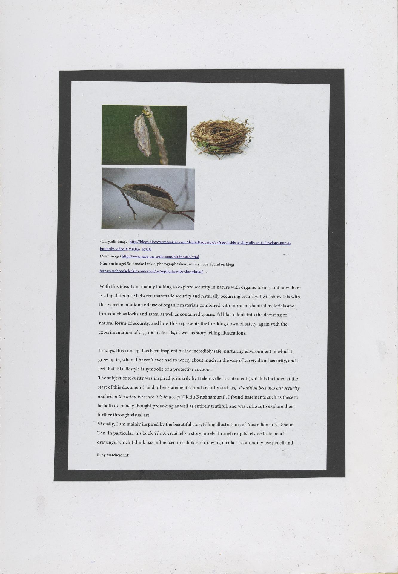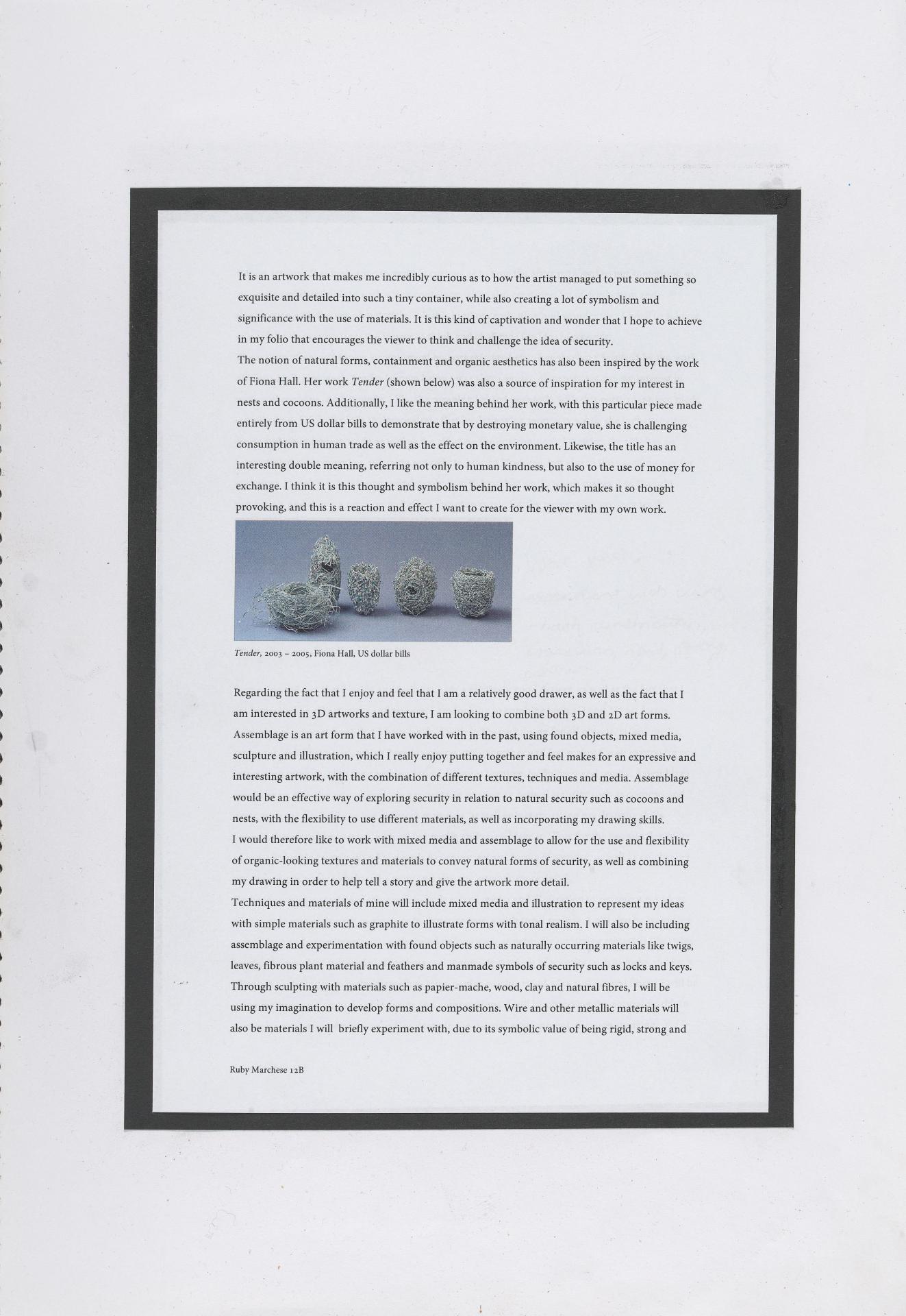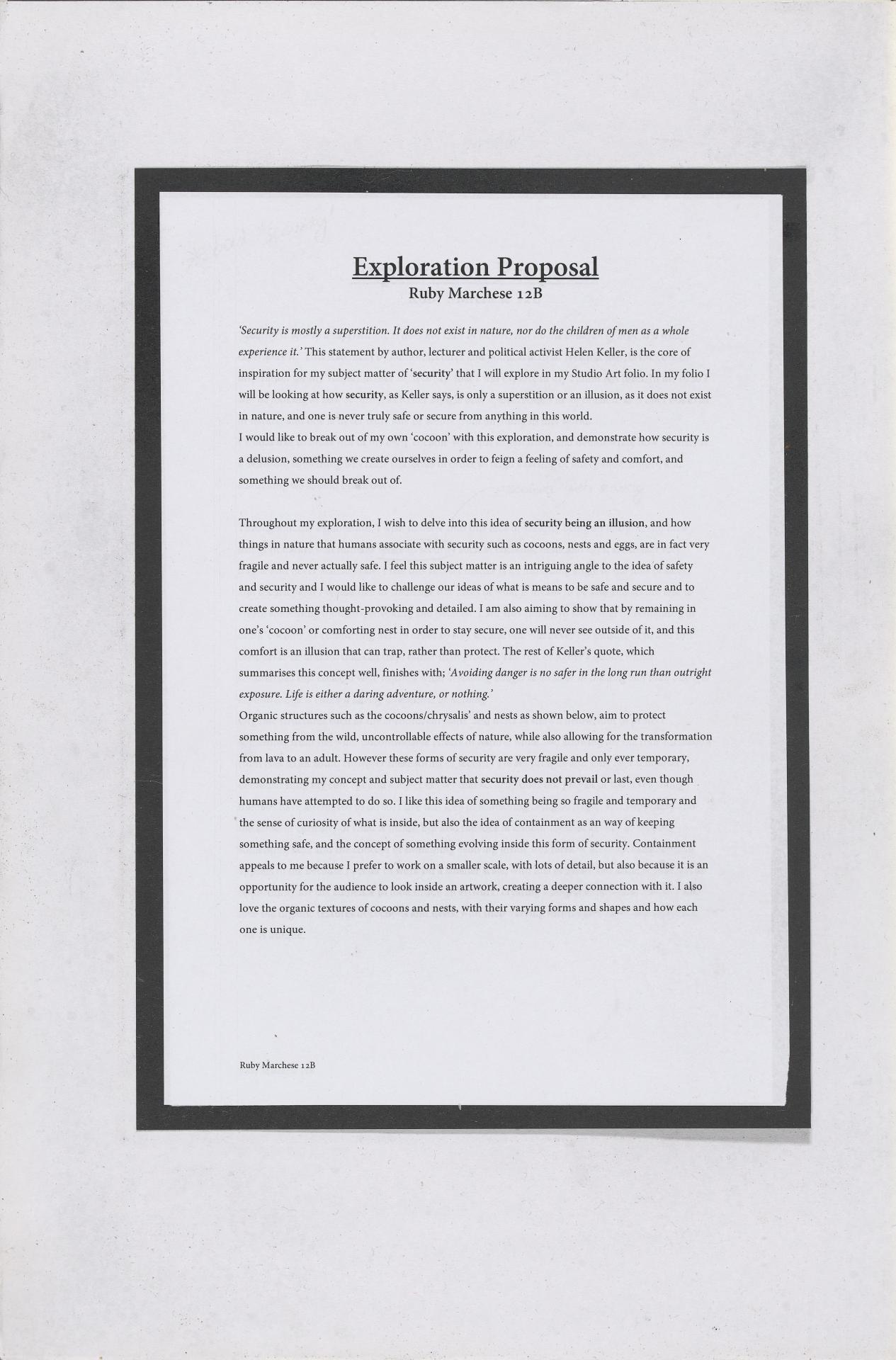 Ruby has completed a comprehensive, highly detailed exploration proposal. (Please refer to current study design for word limit) Ruby has been able to provide detailed evidence of how she will to develop her studio process. She has described the focus and subject matter she will explore throughout this process.