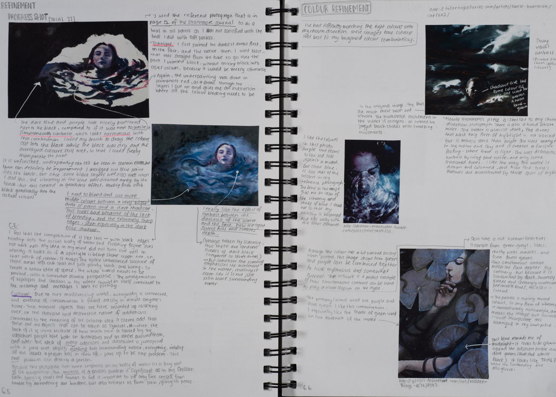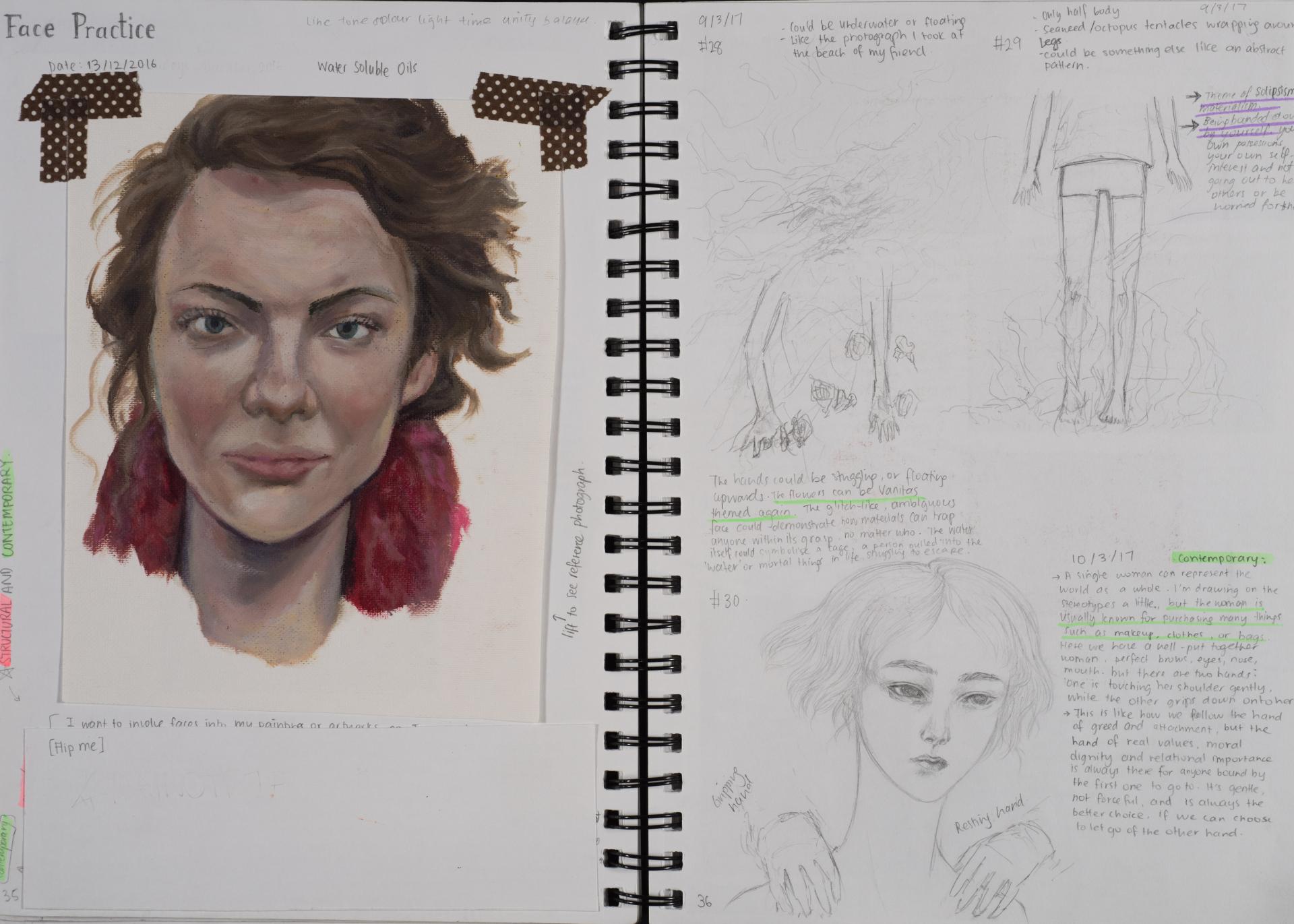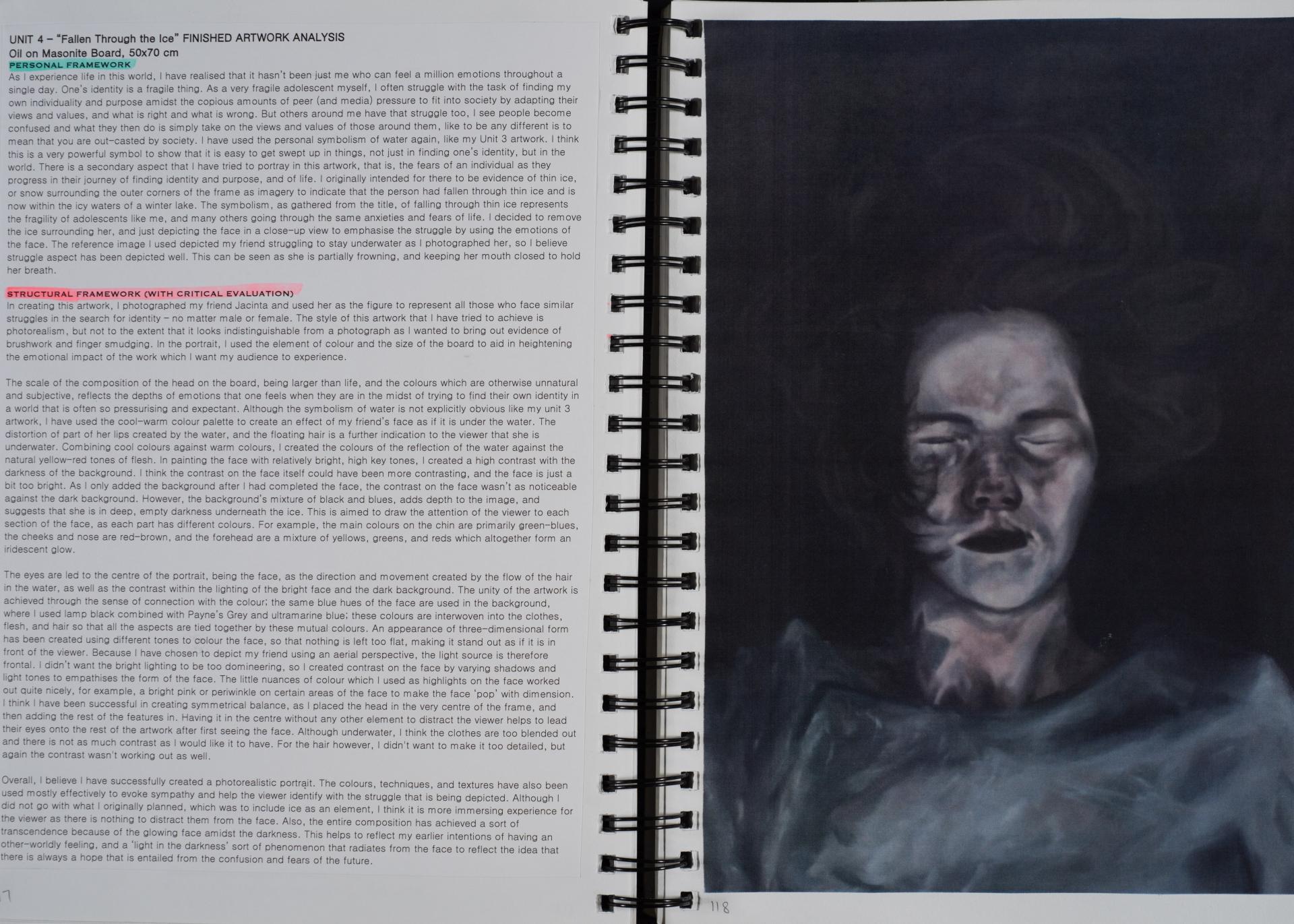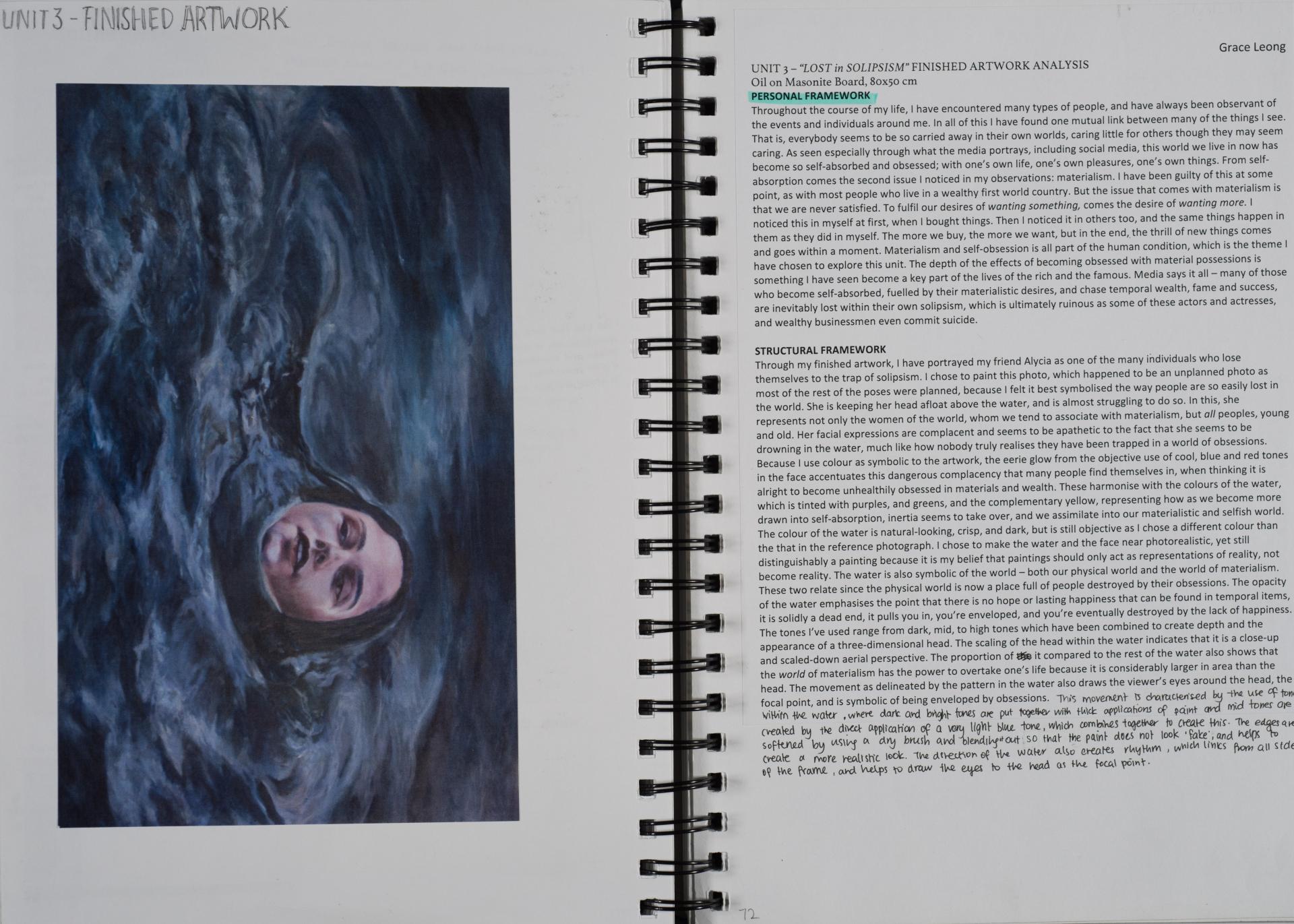 Grace engaged in the exploration of the human condition and conflict from the beginning of her folio. You can see the generation and exploration of concepts and themes in large comprehensive brainstorms. The scope and communication of her personal responses is comprehensive and clear.