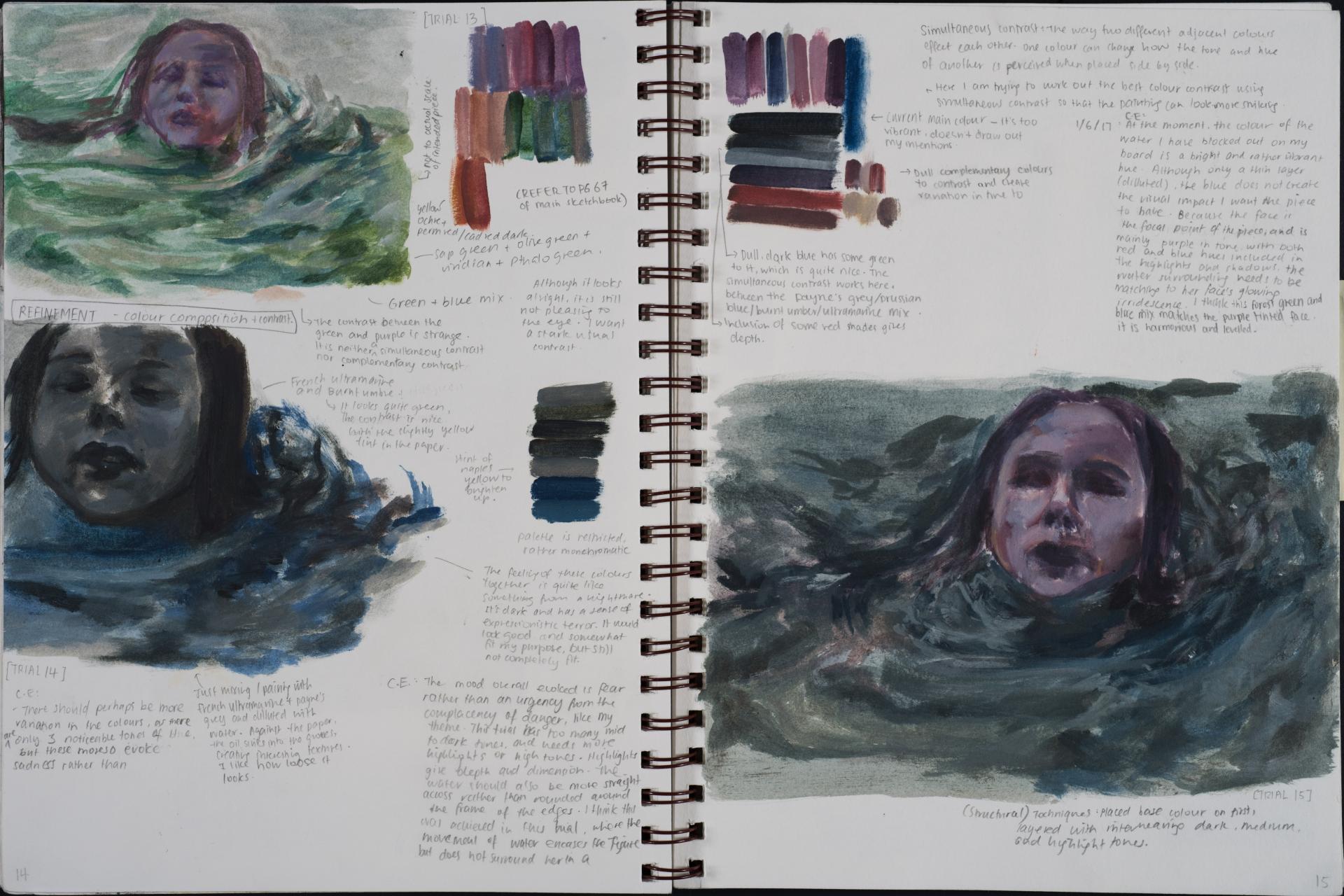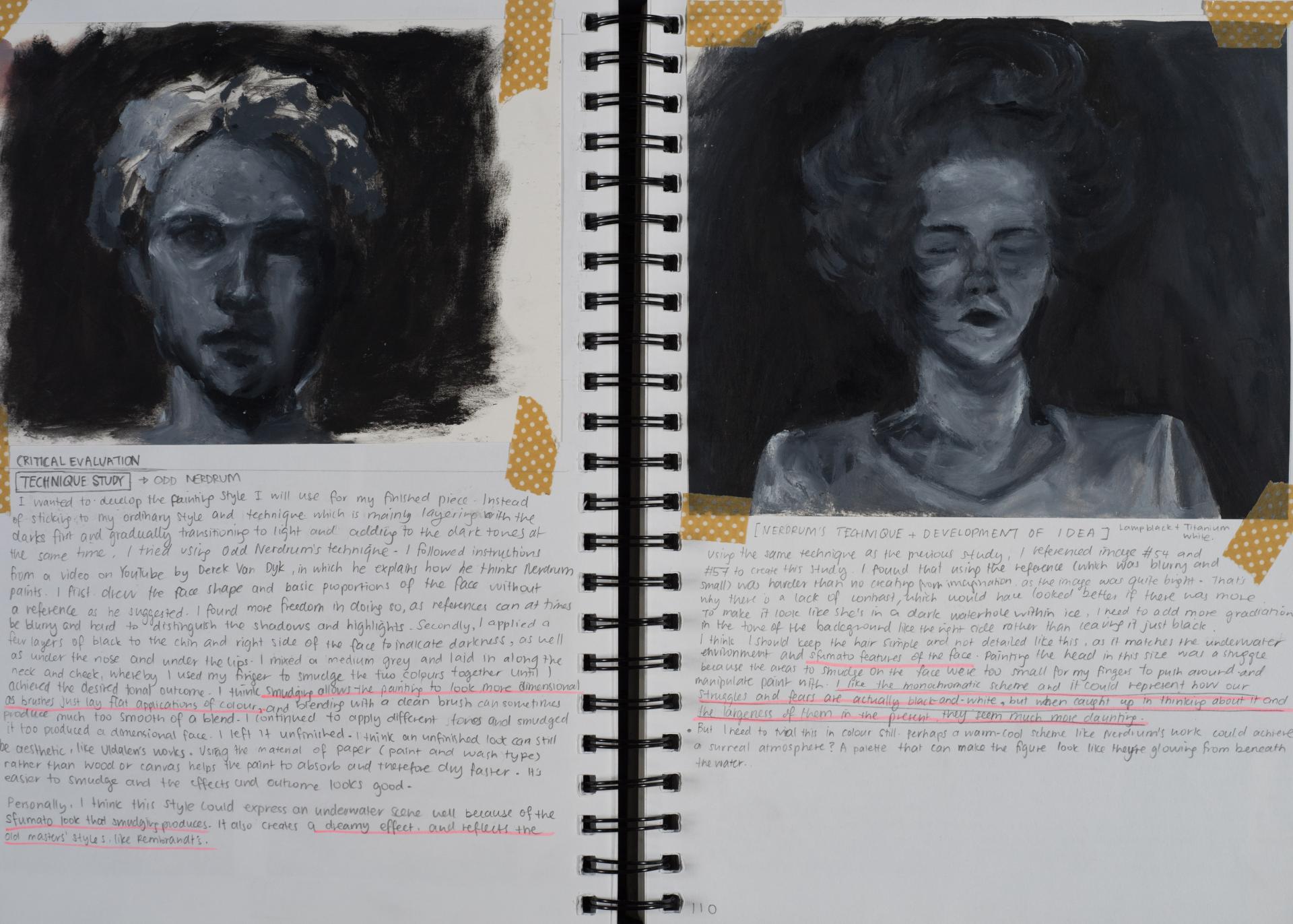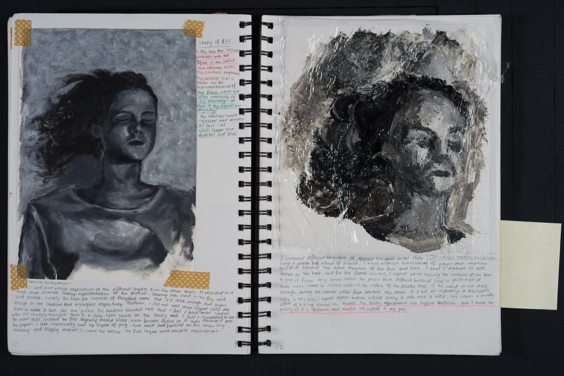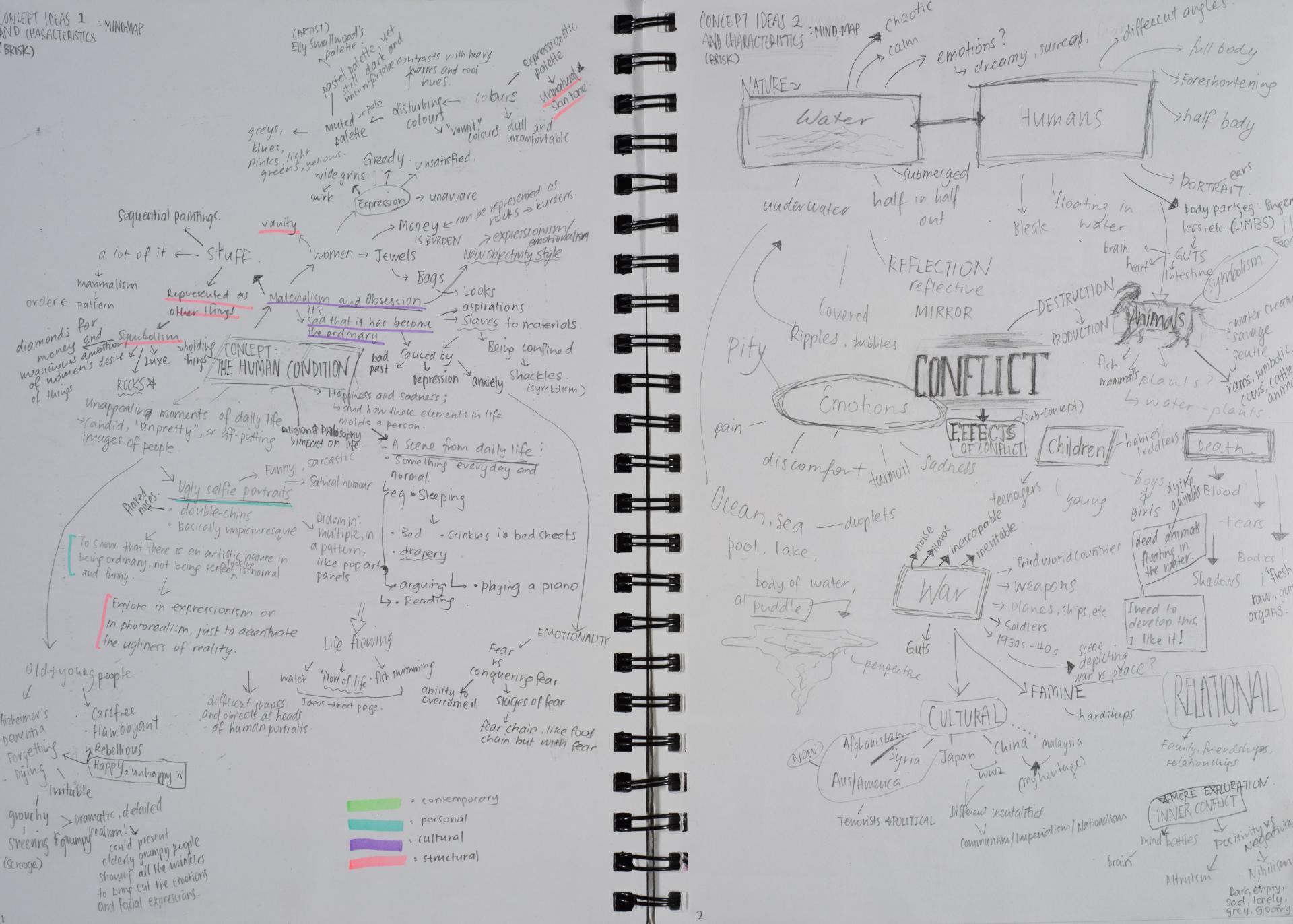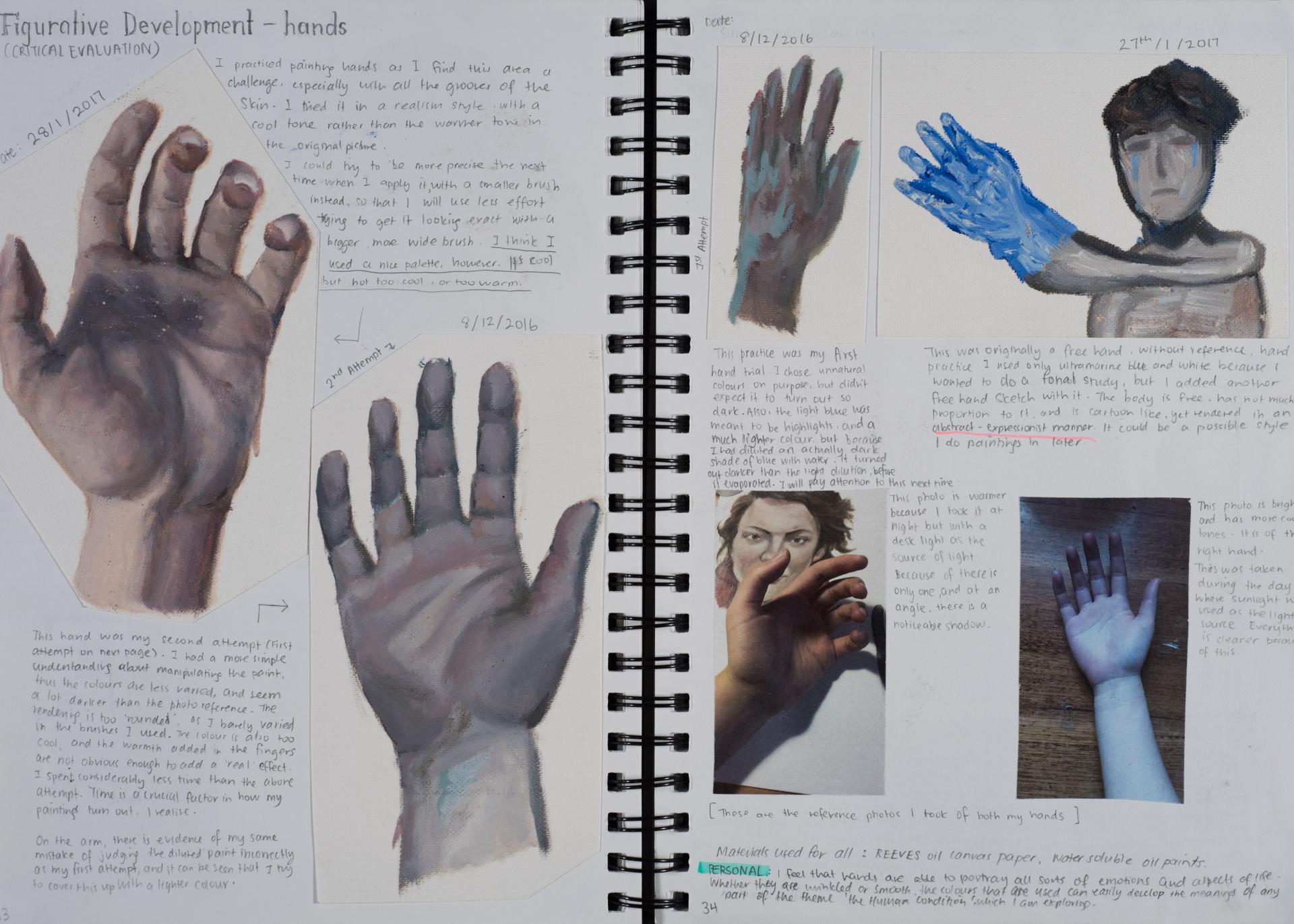 Grace engaged in the exploration of the human condition and conflict from the beginning of her folio. You can see the generation and exploration of concepts and themes in large comprehensive brainstorms. The scope and communication of her personal responses is comprehensive and clear.